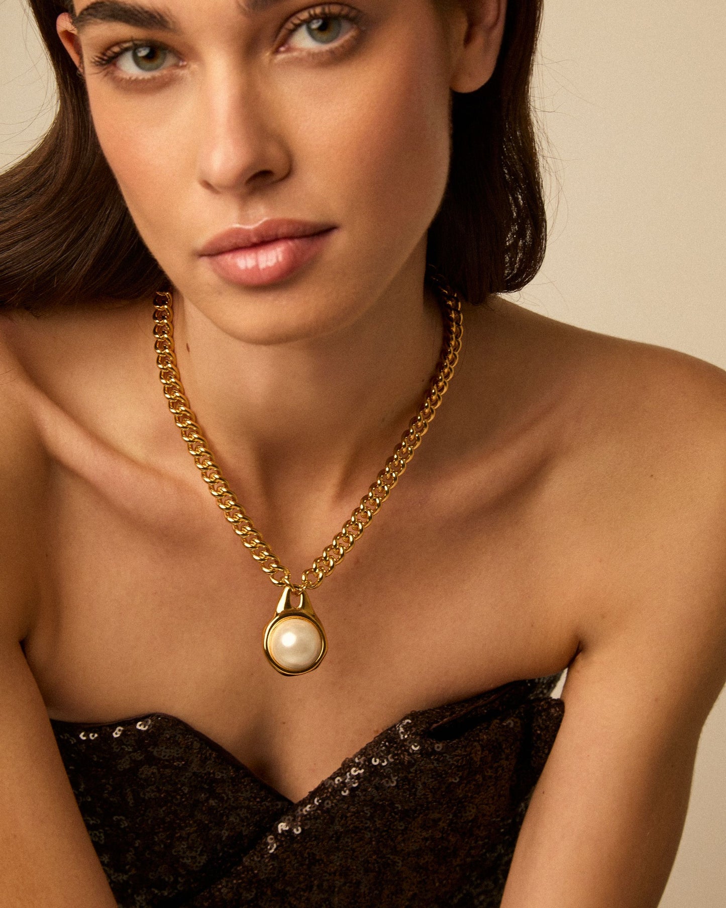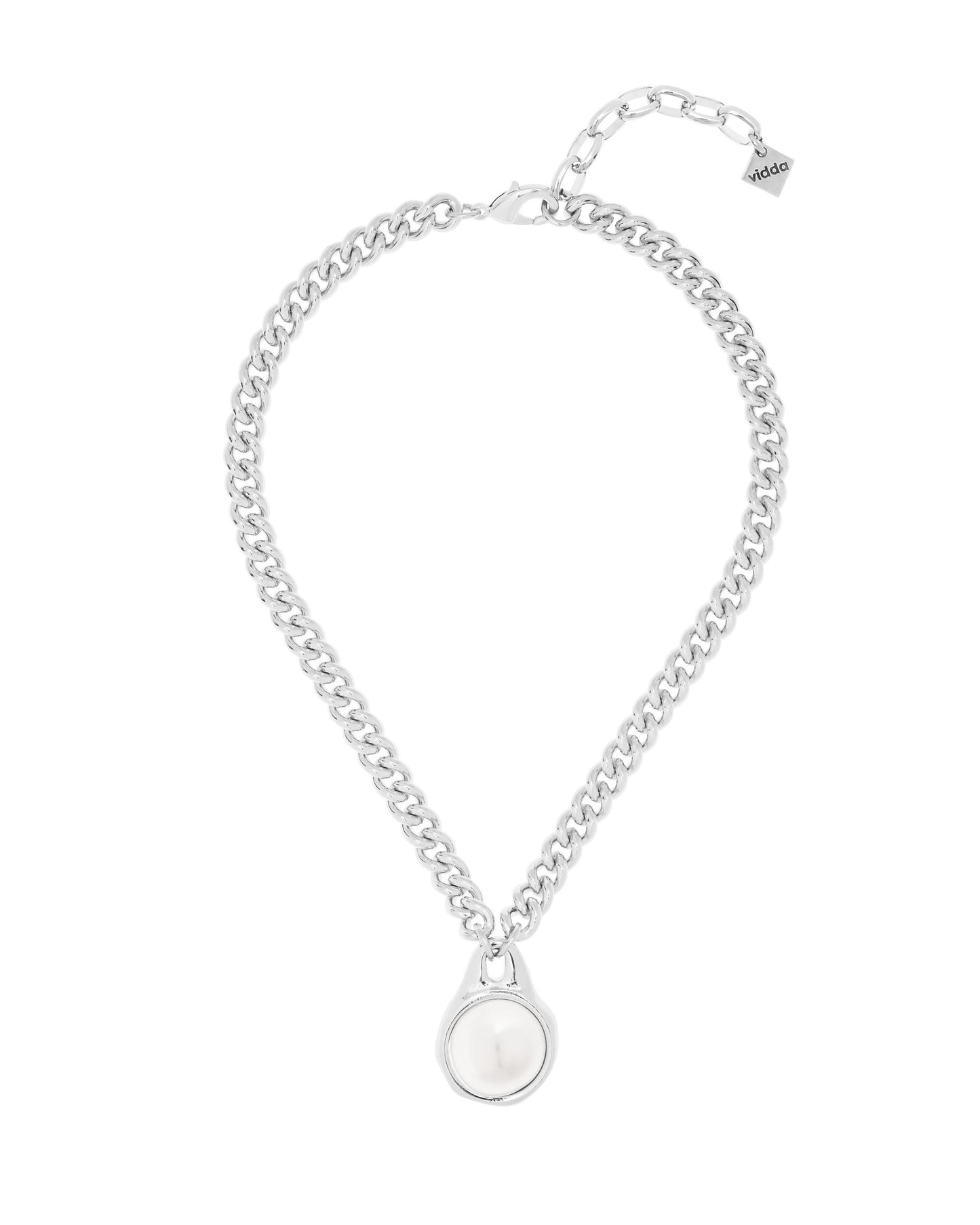Bold cuban chain necklace with a double-sided round pendant, set with a pearl on each side.