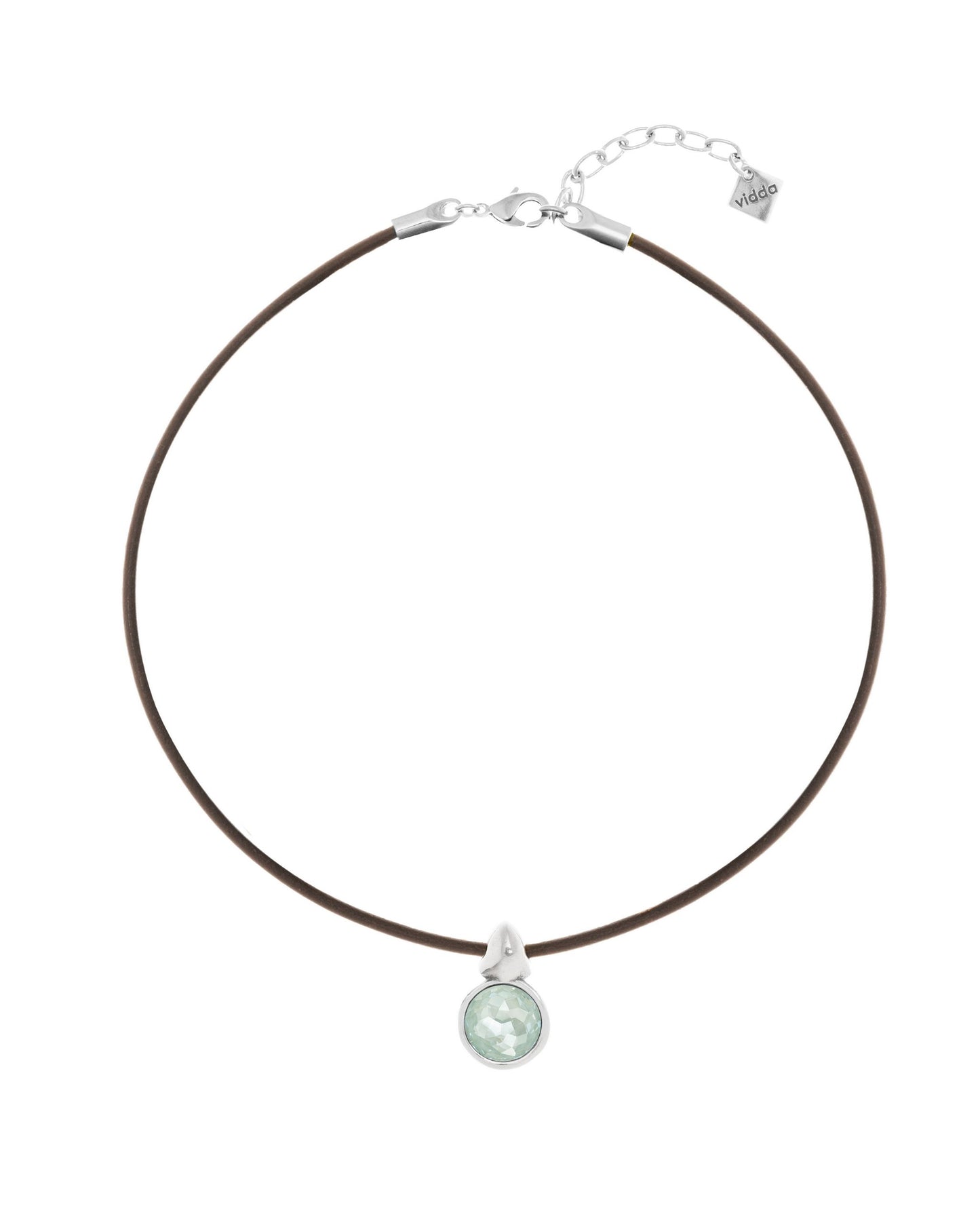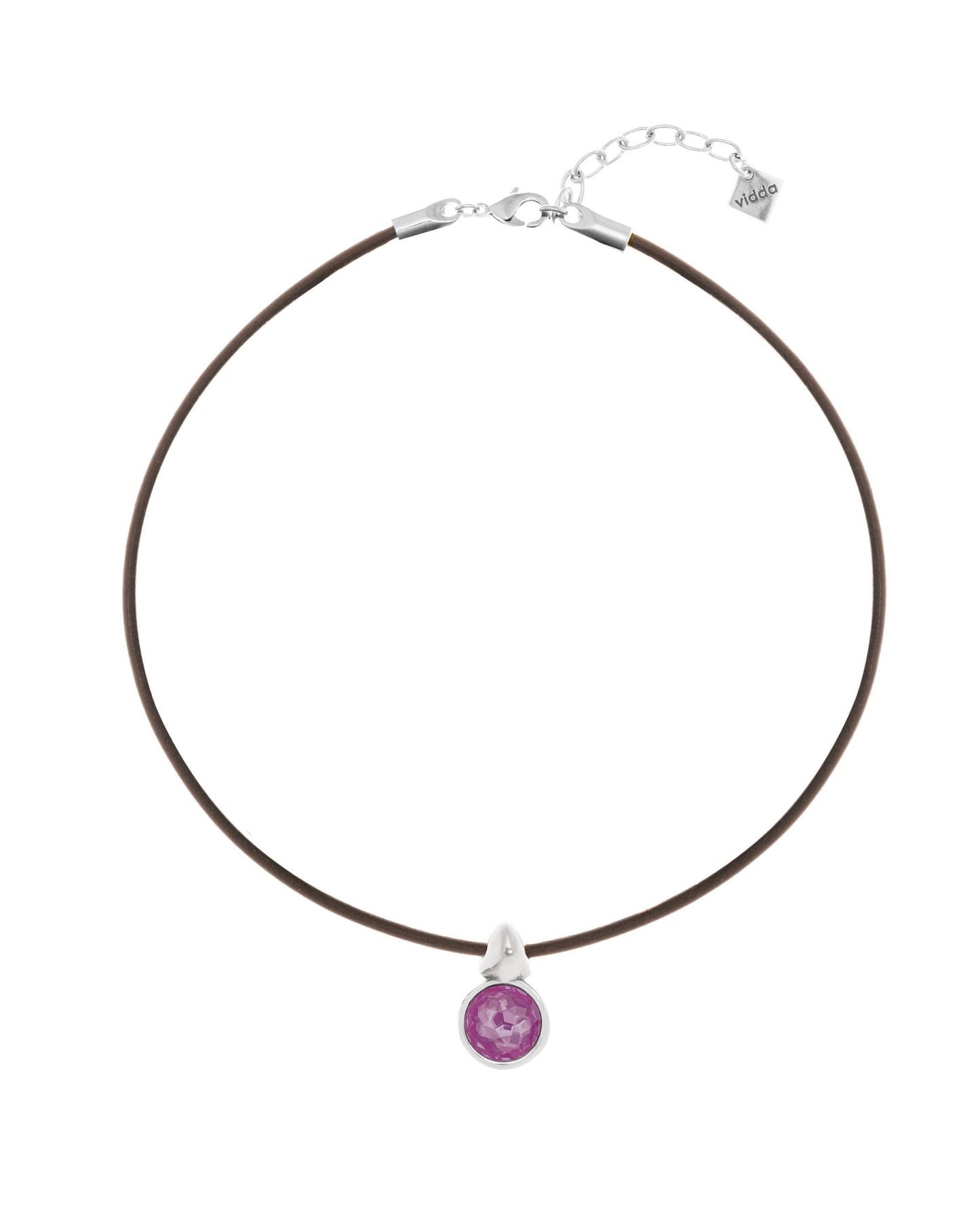 Short thin leather cord necklace. Suspended at the center is a round Swarovski������ crystal set in a bezel, topped with a triangle-shaped element.