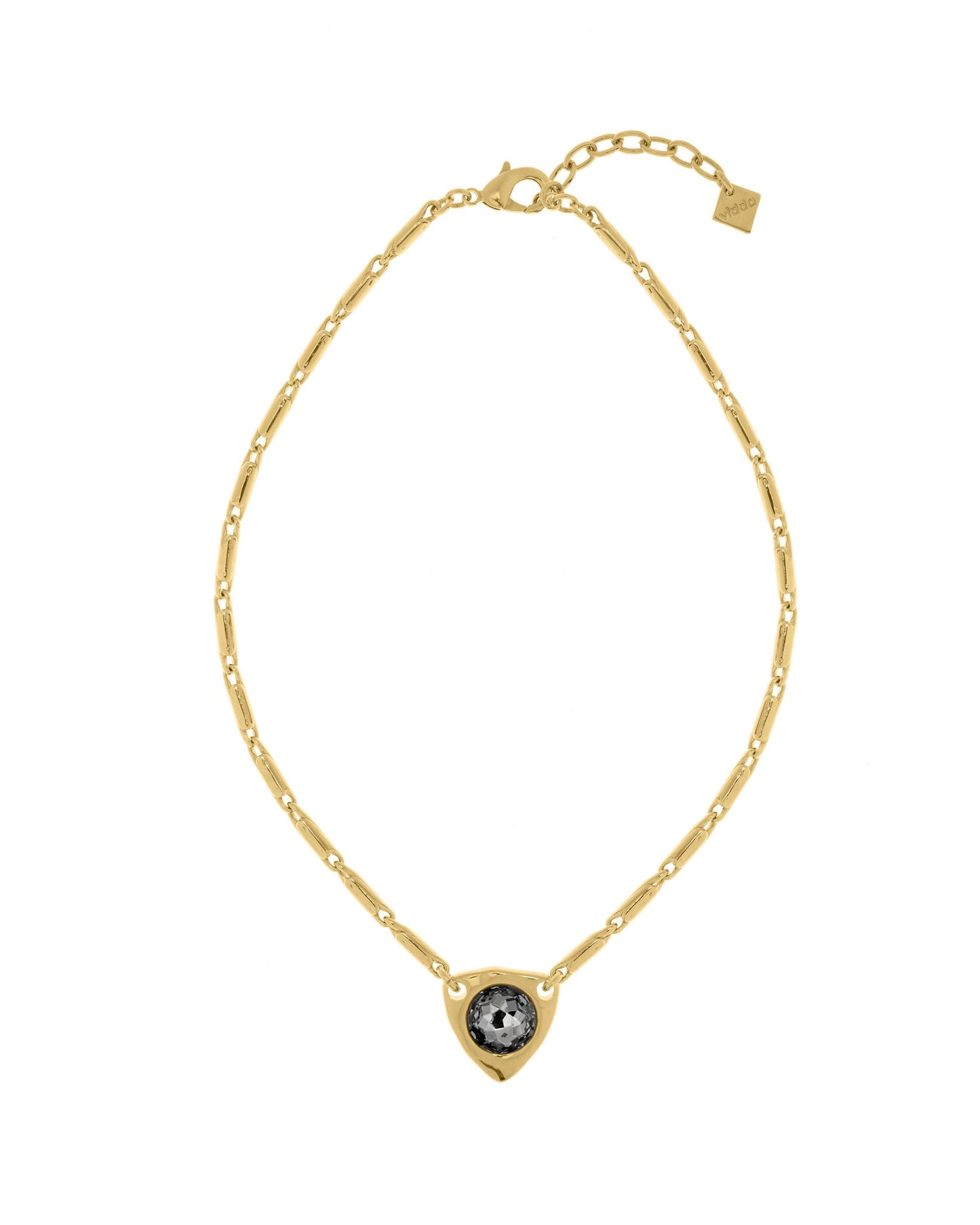 Link chain necklace connected at the center with a triangular-shaped element with a round Swarovski������ crystal.