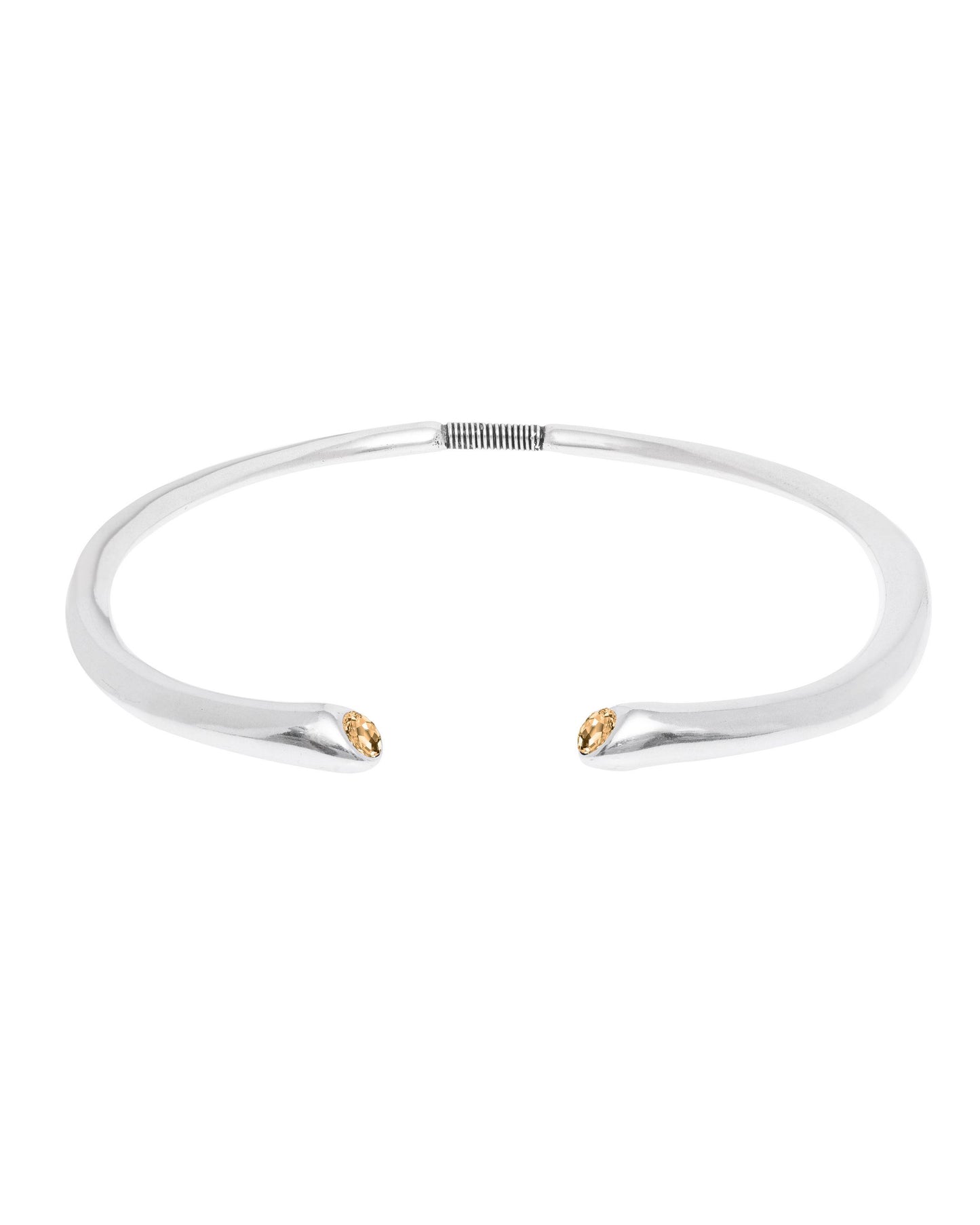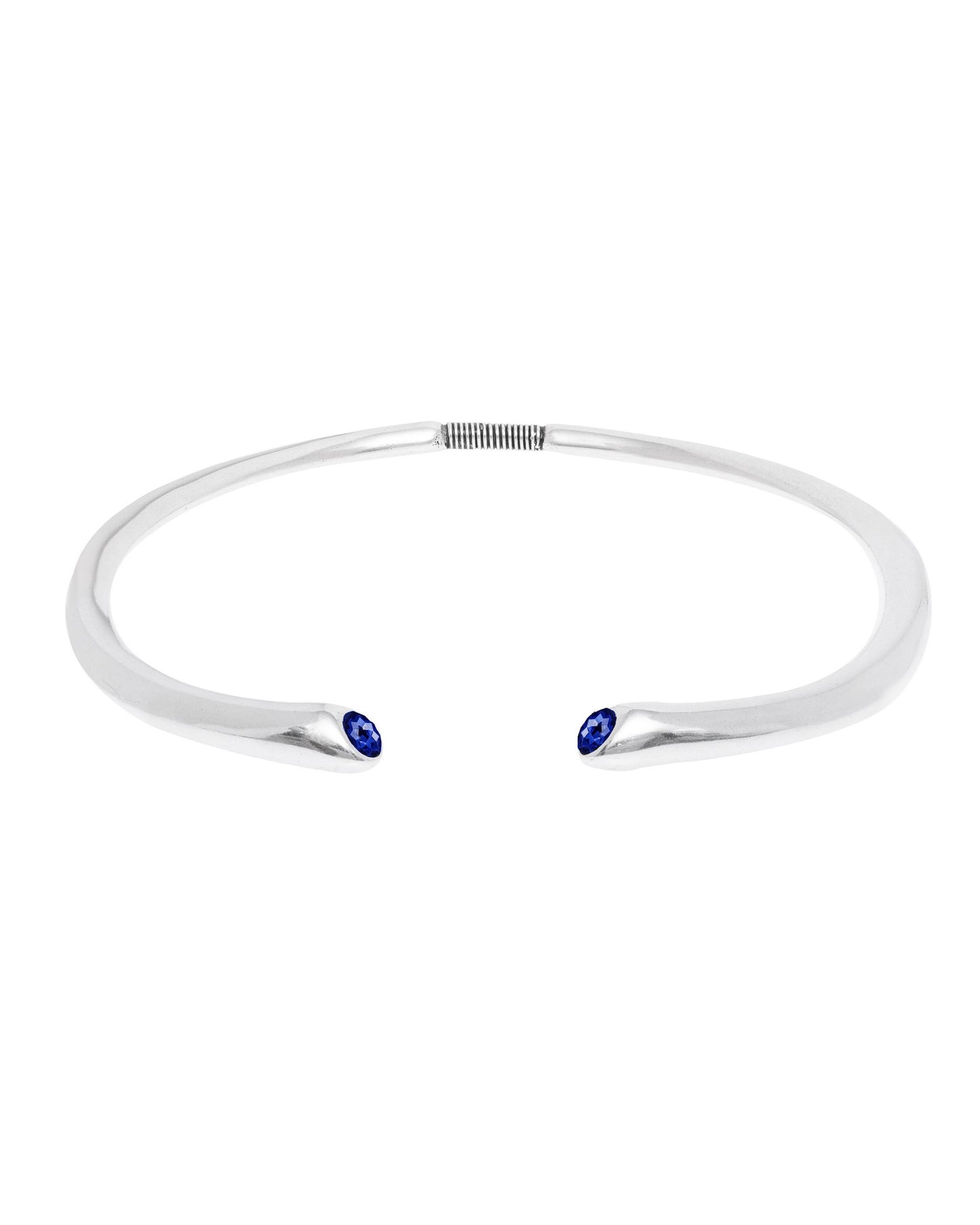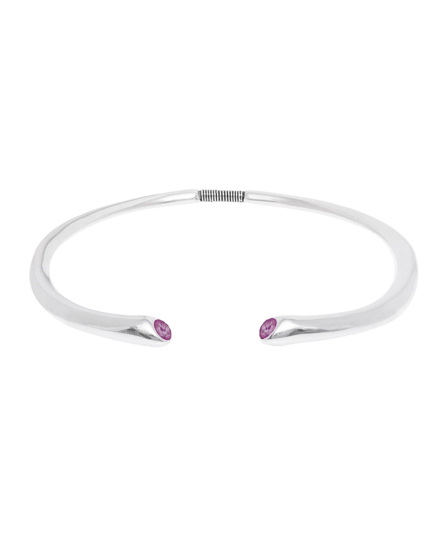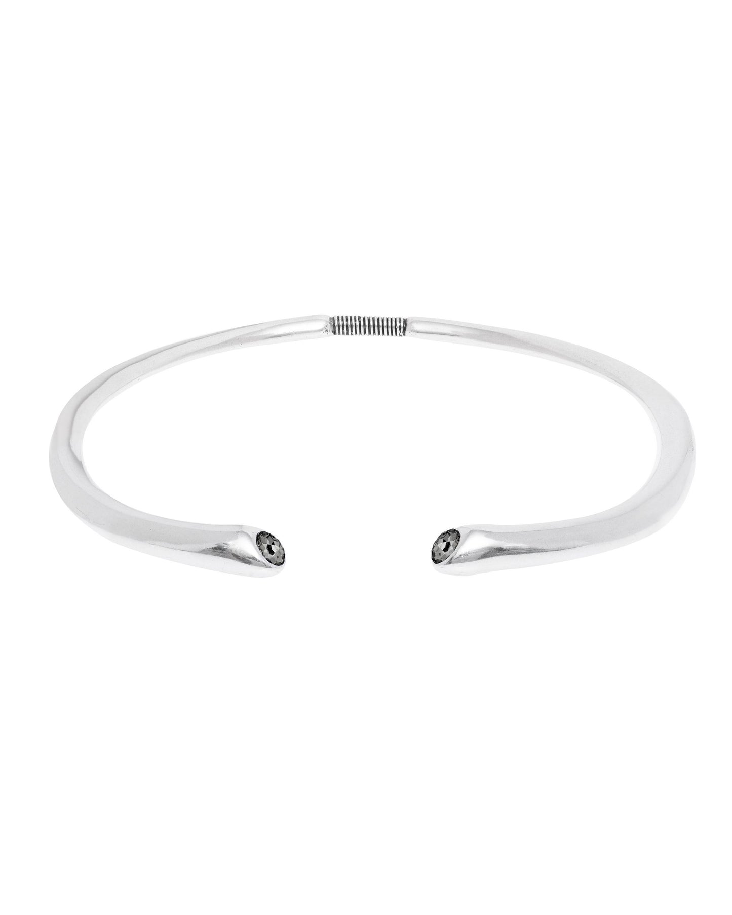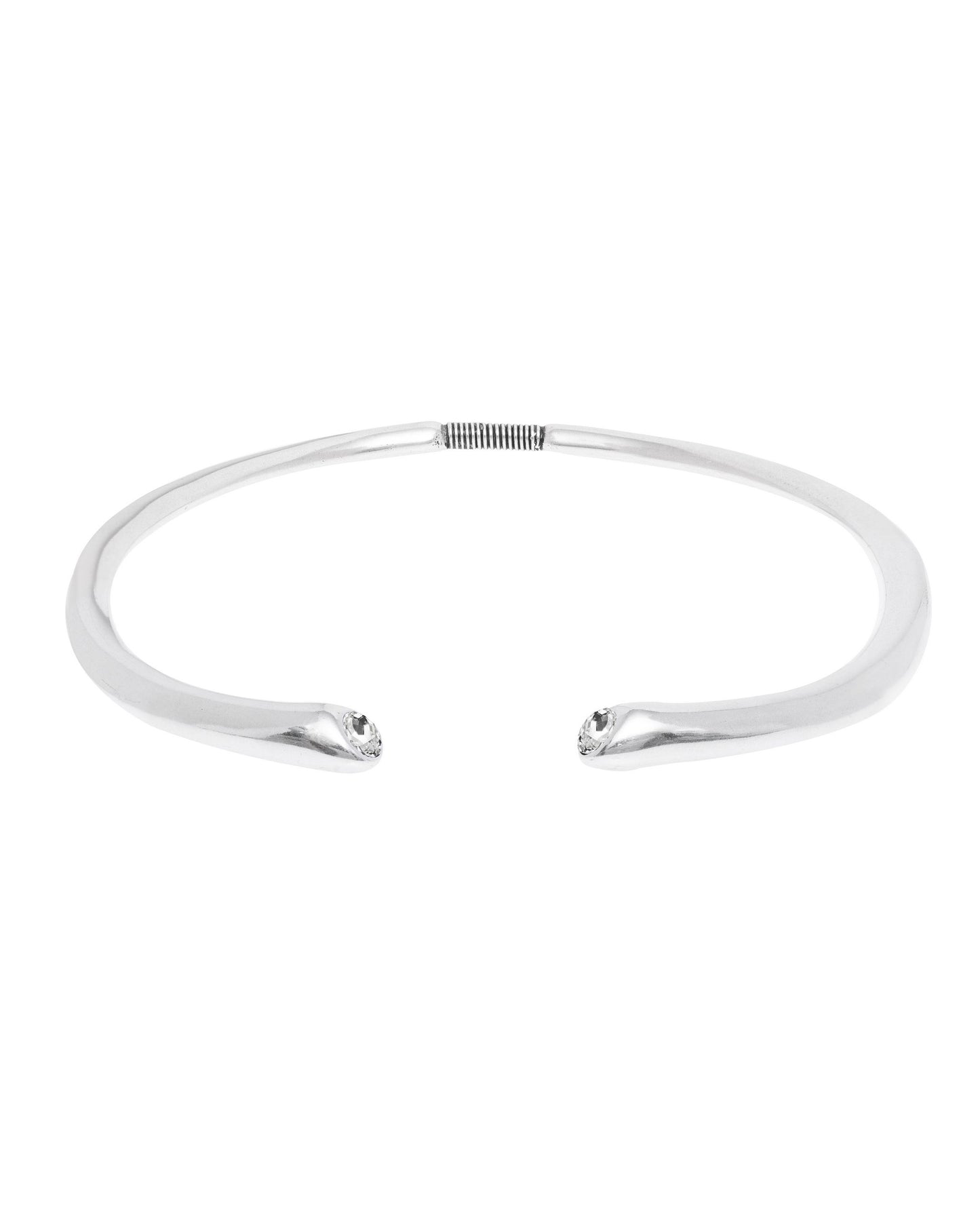 Rigid necklace crafted in a curved, open-front shape with a round Swarovski������ crystal at each end. It includes a hidden spring mechanism that allows it to flex open for easy wear and removal.