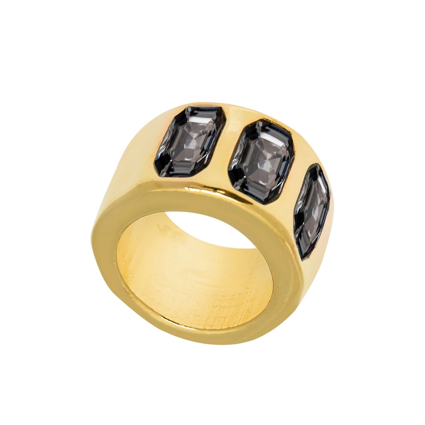 Anillo ancho con tres cristales rectangulares.