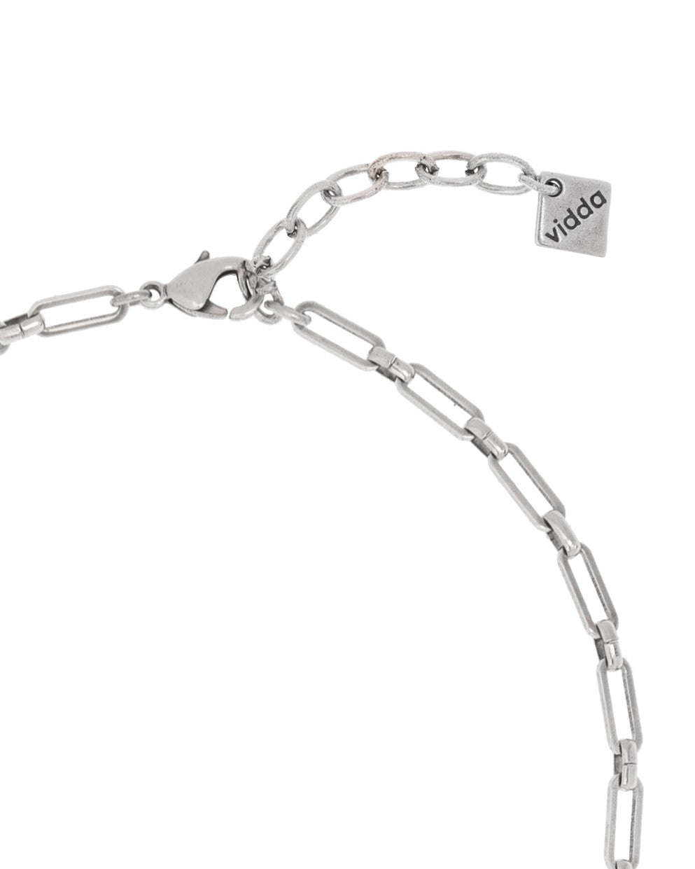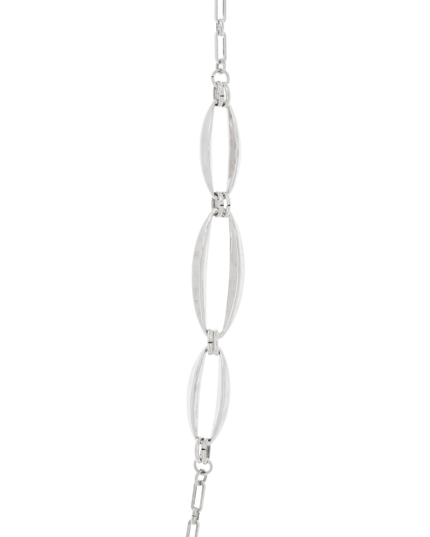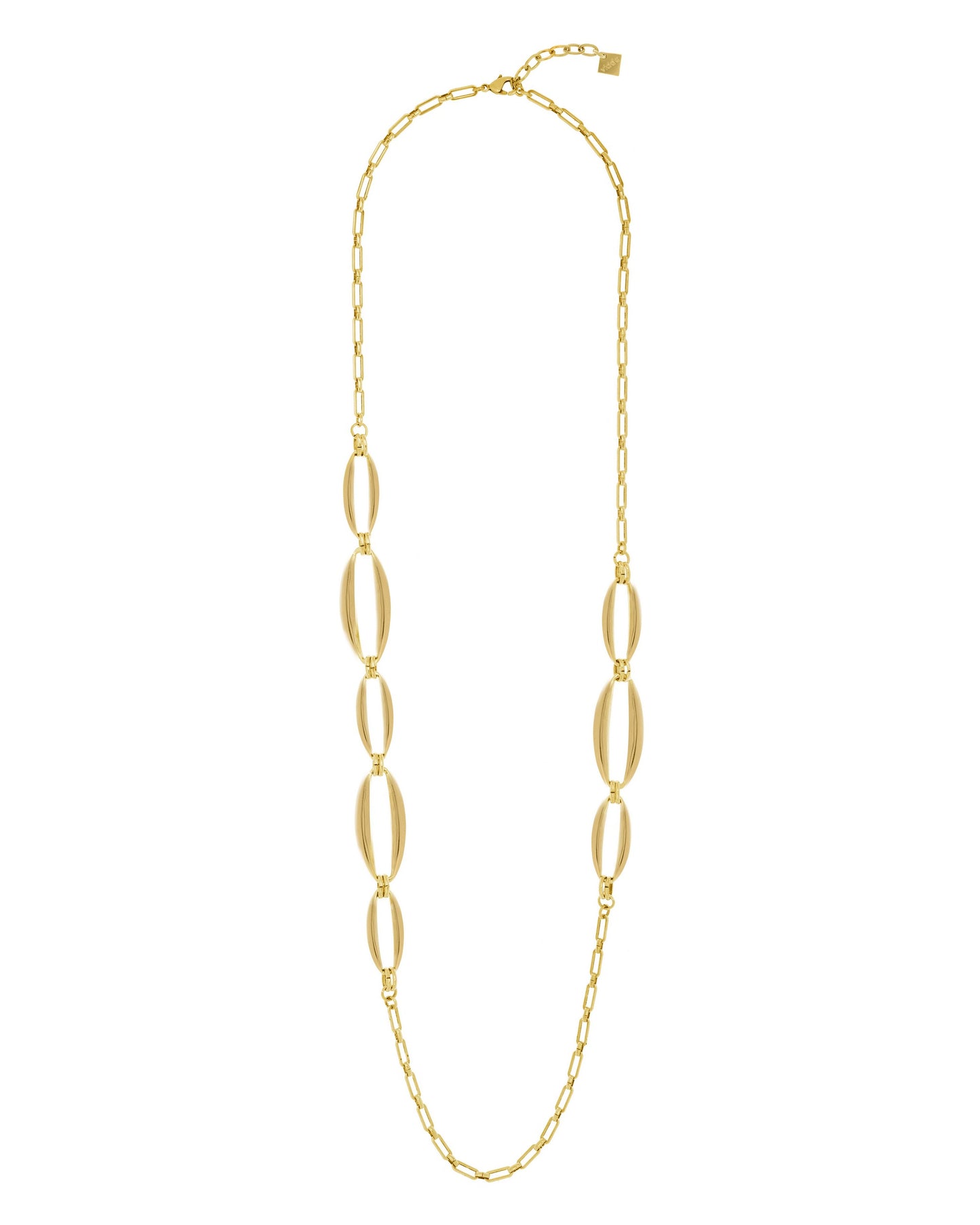 Collar largo de cadena de caja rectangular con cinco eslabones ovalados de diferentes tamaños en un lado y tres en el otro lado.
