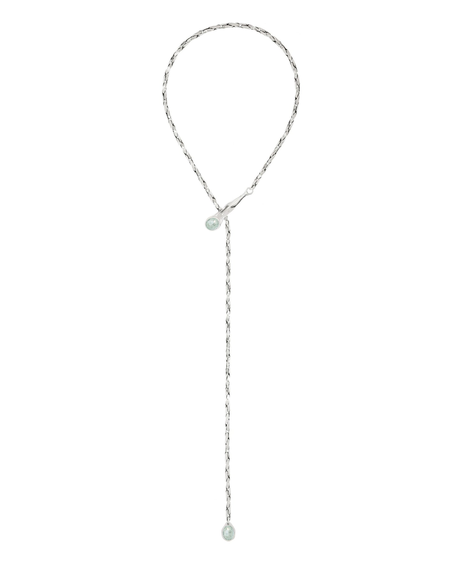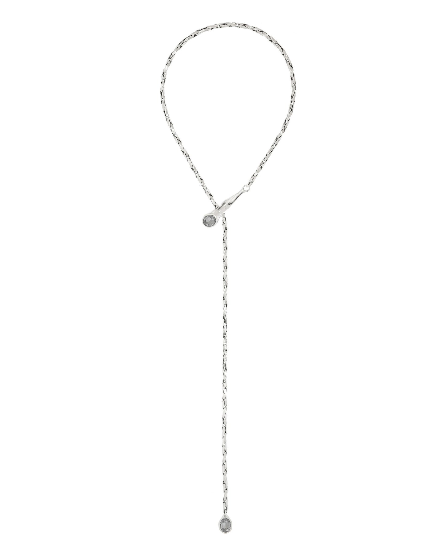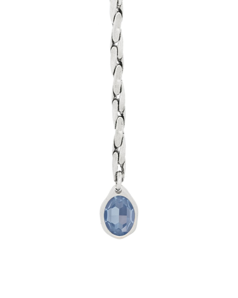 Collar largo tipo Y hecho con cadena de avena. Una pieza con cristal Swarovski® por donde pasa la cadena creando el collar en un extremo y un charm de cristal Swarovski® ovalado en el otro.
