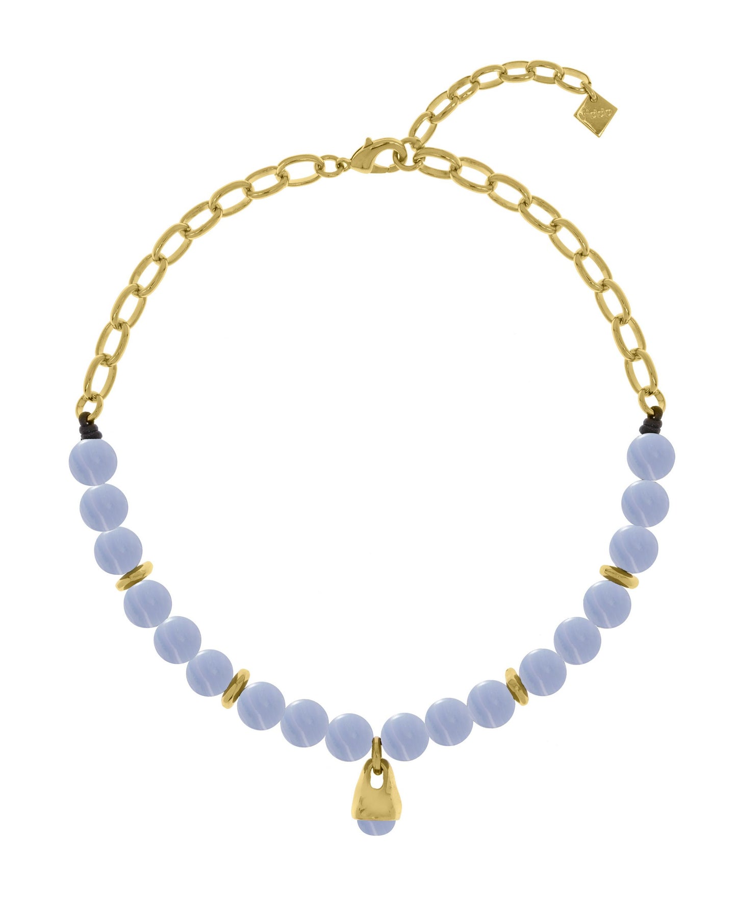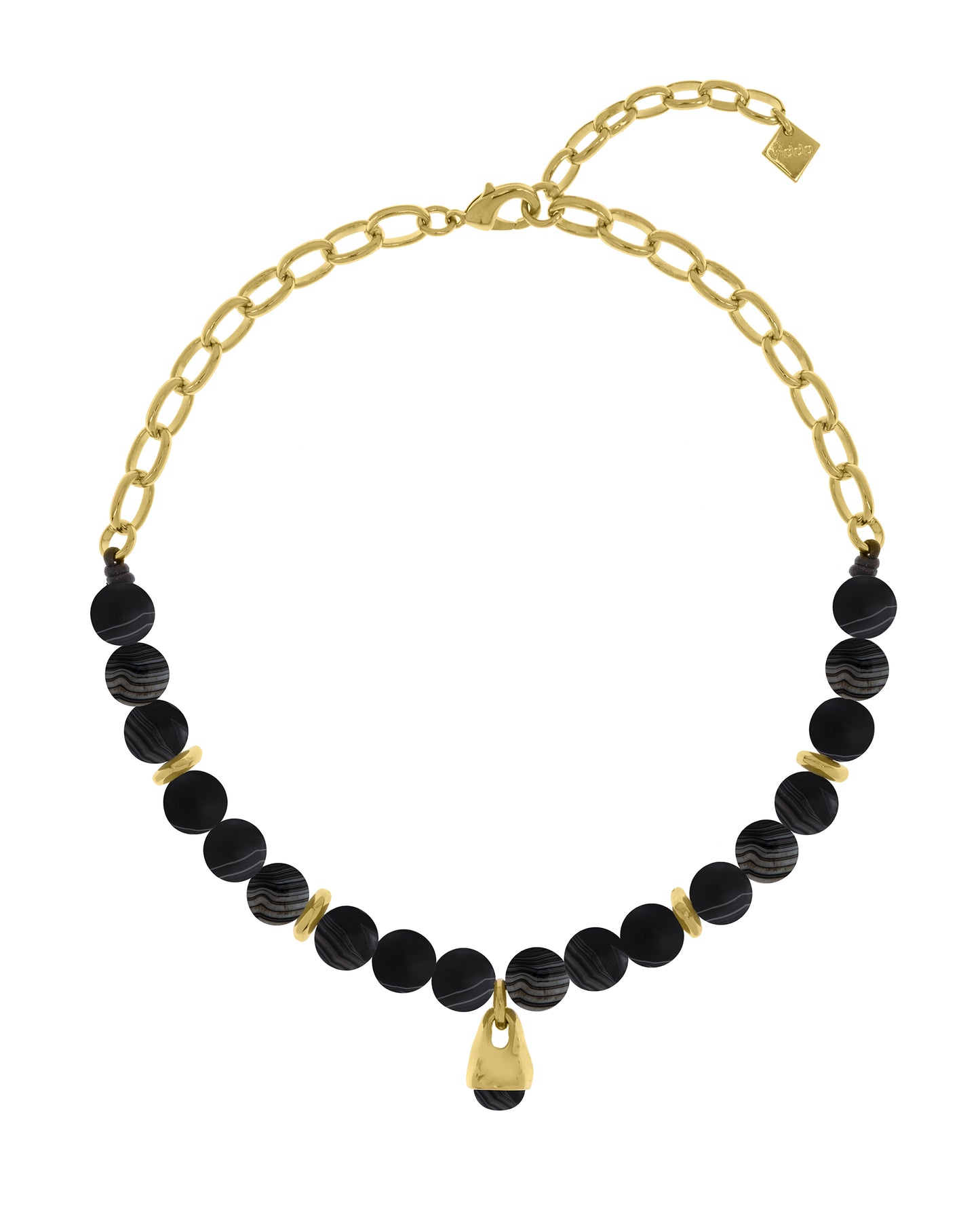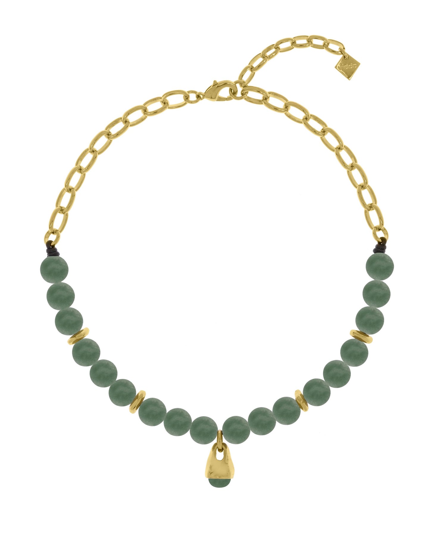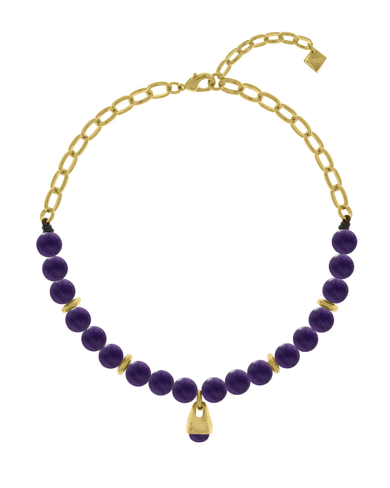 Este elegante collar piedras naturales combina una cadena con cordón de cuero y un colgante en forma de gota, rematado con una piedra natural cuidadosamente seleccionada. Su diseño moderno y sofisticado se complementa con detalles metálicos bañados en oro de 24k, creando una pieza versátil y atemporal.