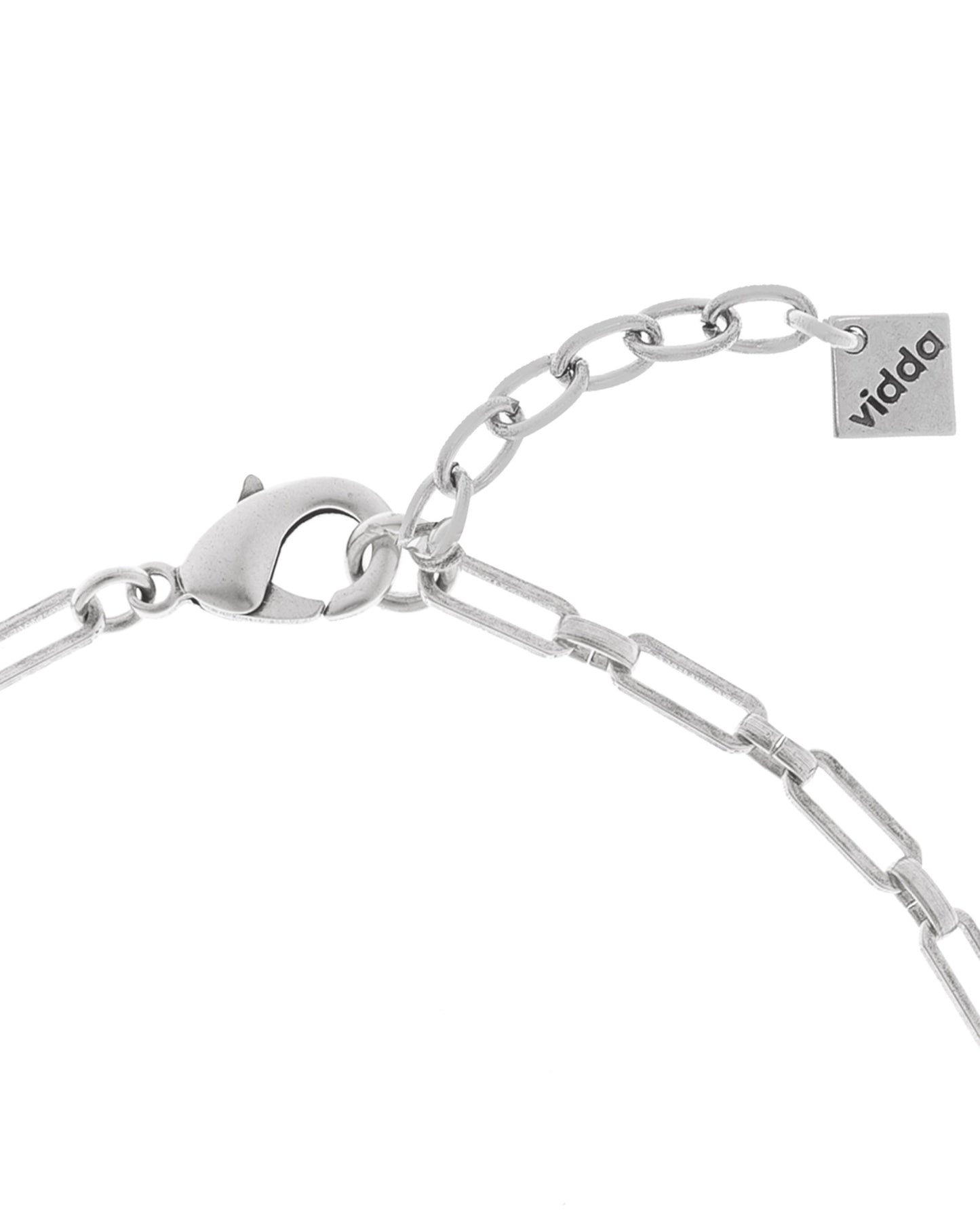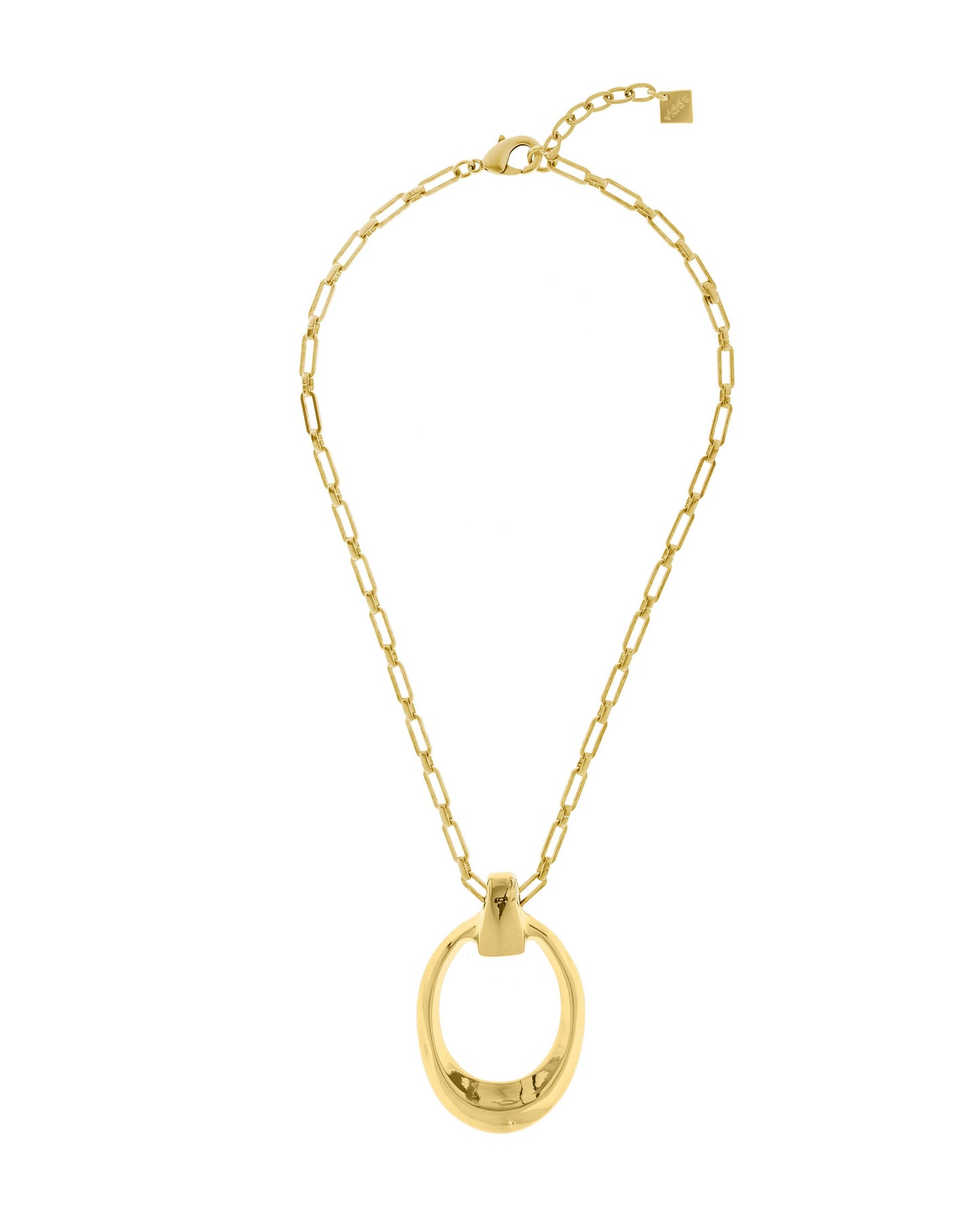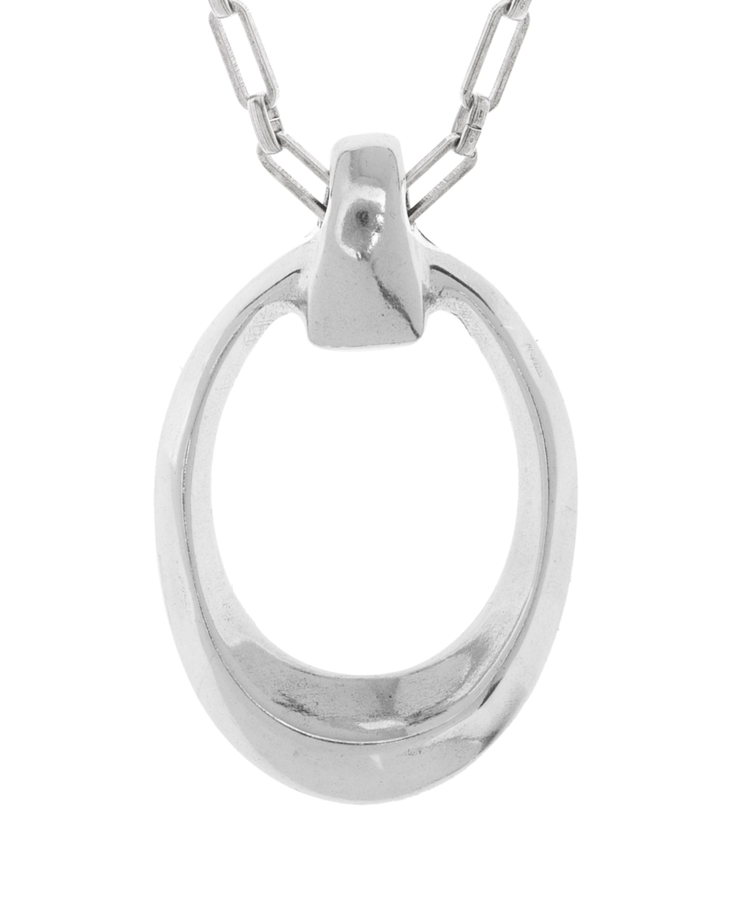 Collar corto de cadena de caja rectangular con colgante de pieza ovalada irregular de borde afilado.