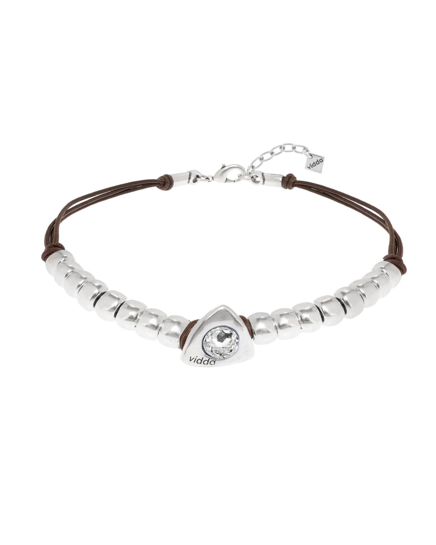 Collar tipo choker de cordón de cuero doble con una hilera de cuentas redondas a cada lado. En el centro presenta un botón triangular con un cristal Swarovski® redondo.