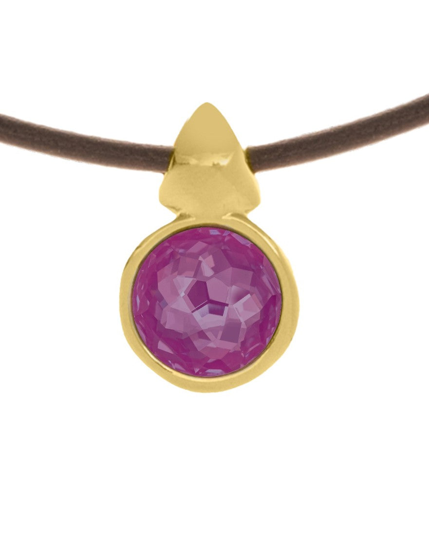 Collar corto de cordón de cuero fino. Prensenta un colgante circular acabado en forma triangular con un cristal Swarovski® redondo en el centro.