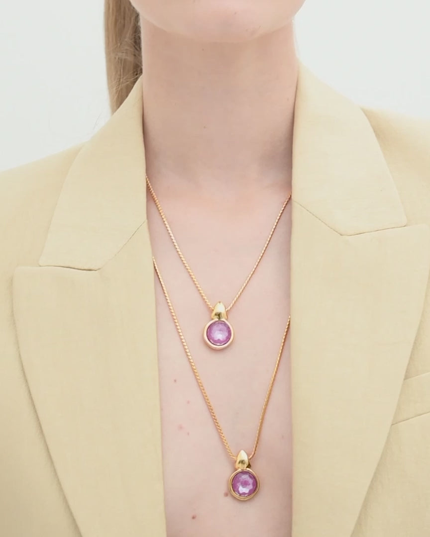 Collar largo de cadena de cordón redondo. Prensenta un colgante circular acabado en forma triangular con un cristal Swarovski® redondo en el centro.