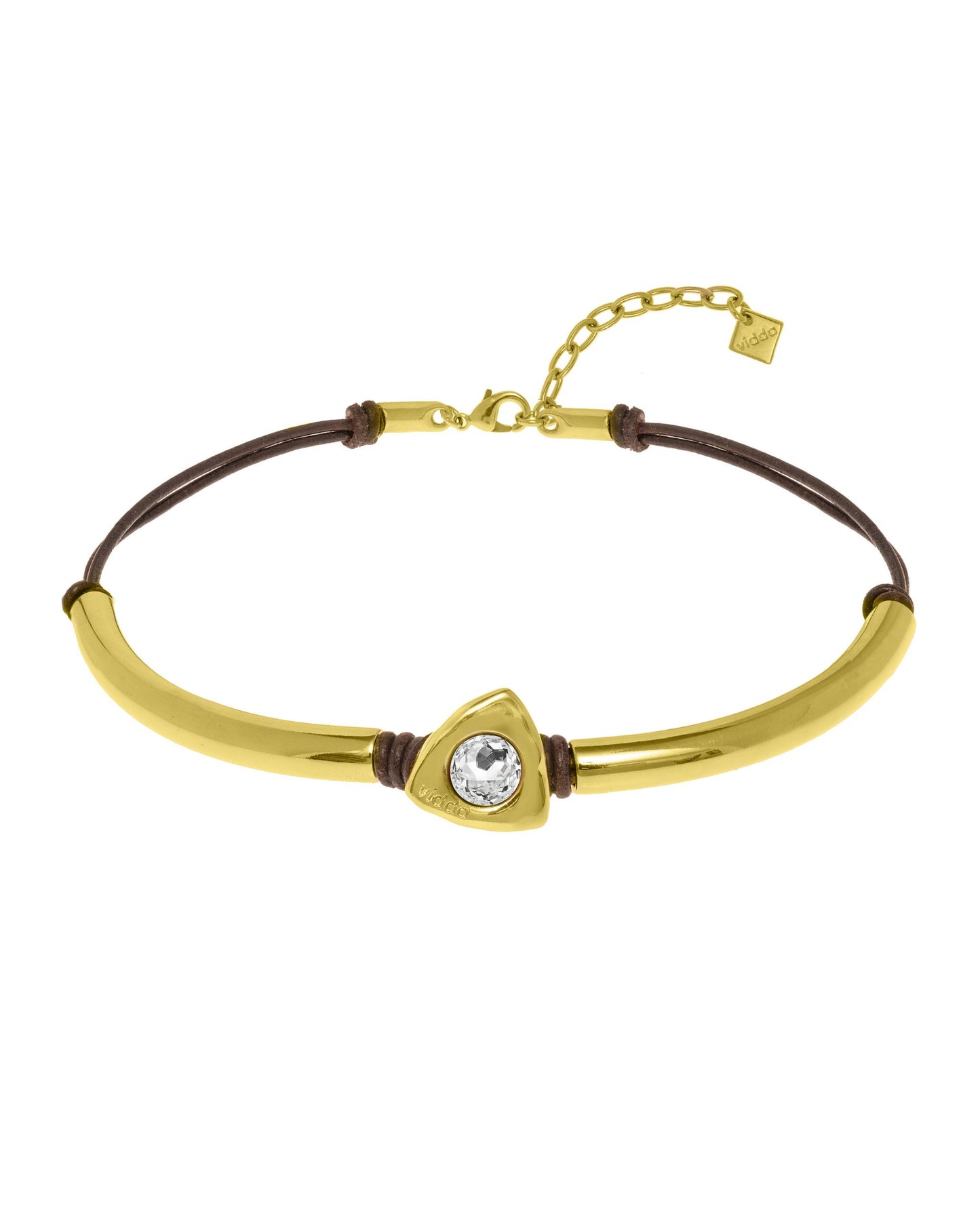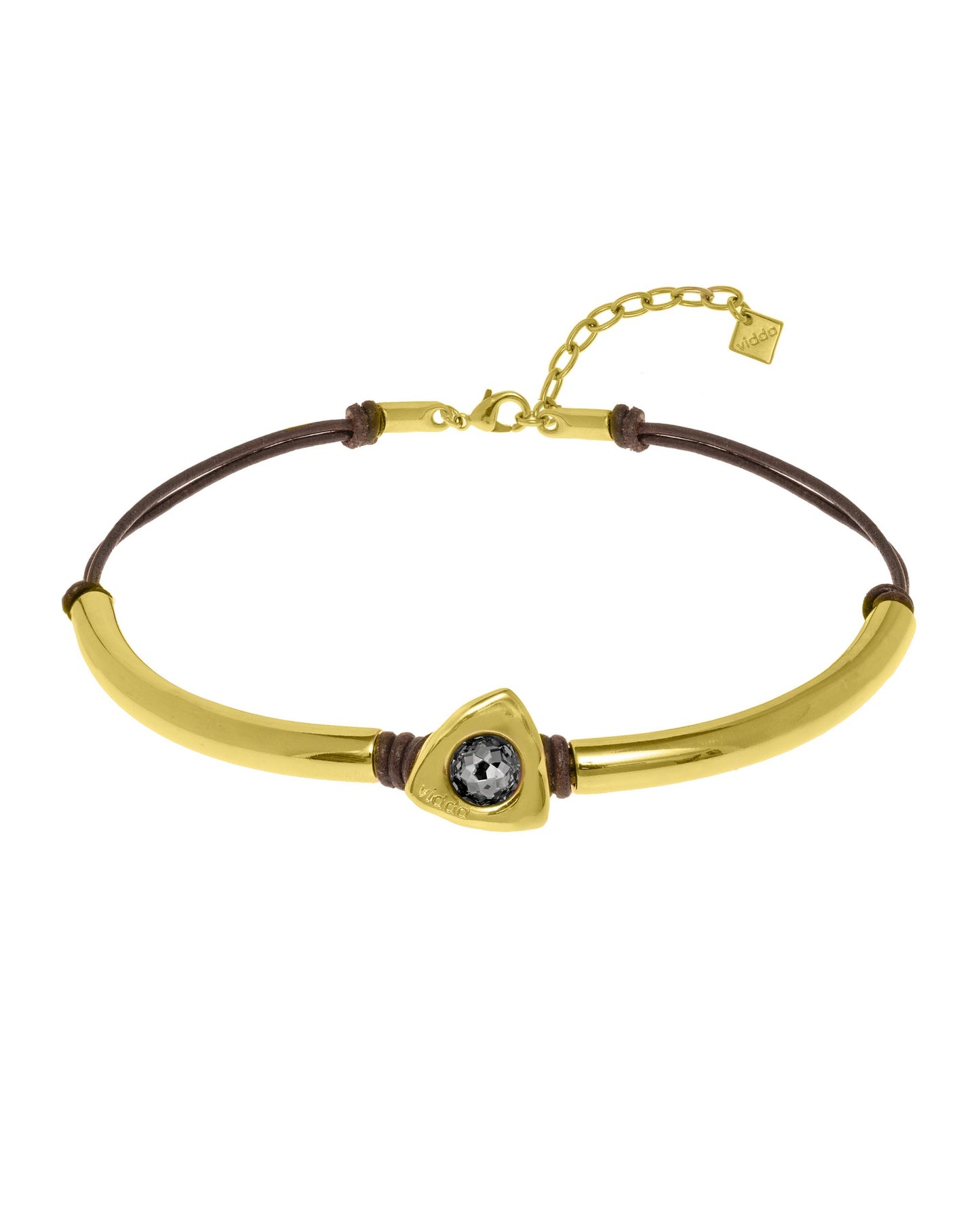 Collar tipo choker de cordón de cuero doble con una barra de metal curva en cada lado. En el centro hay un botón triangular con un cristal Swarovski® redondo.