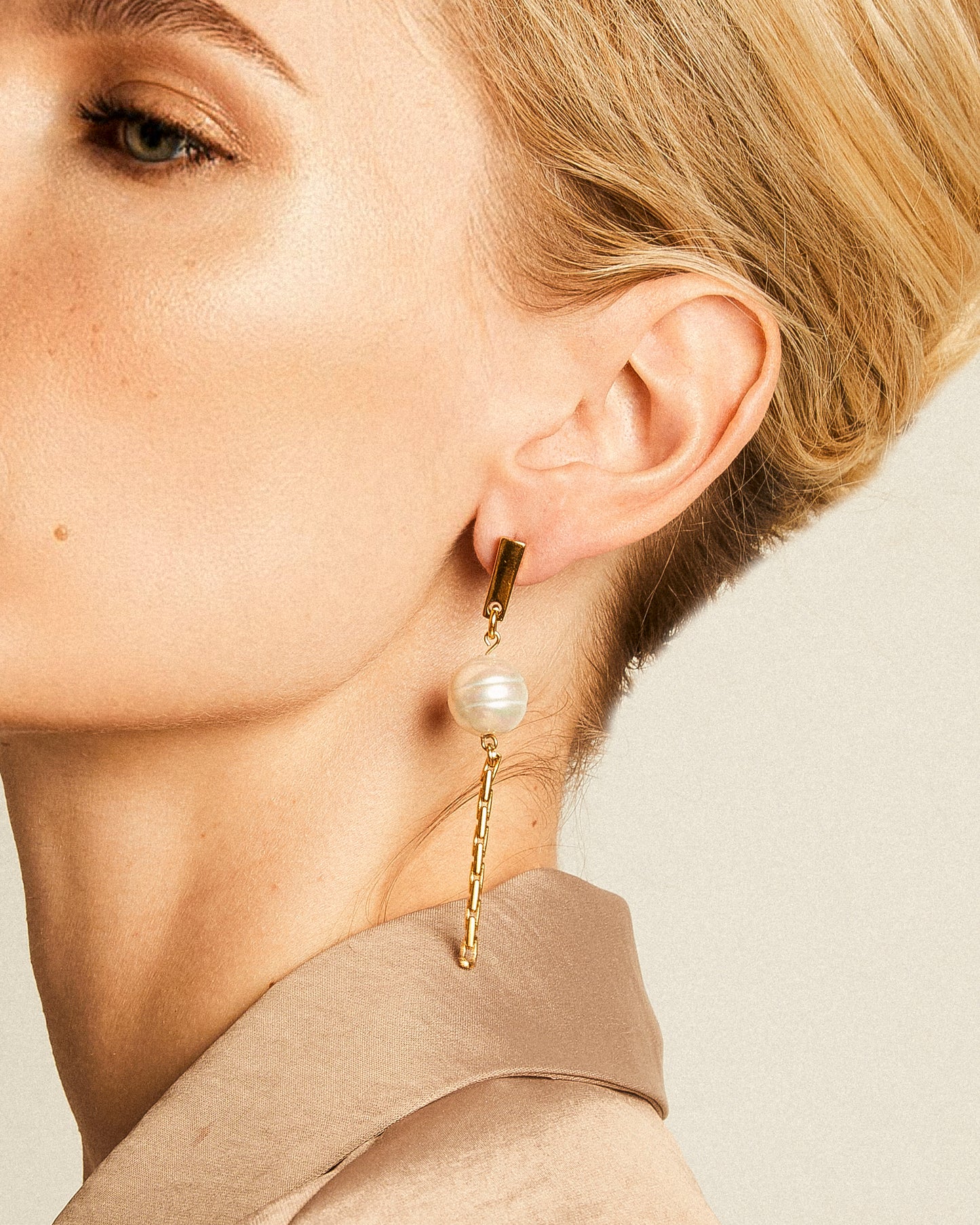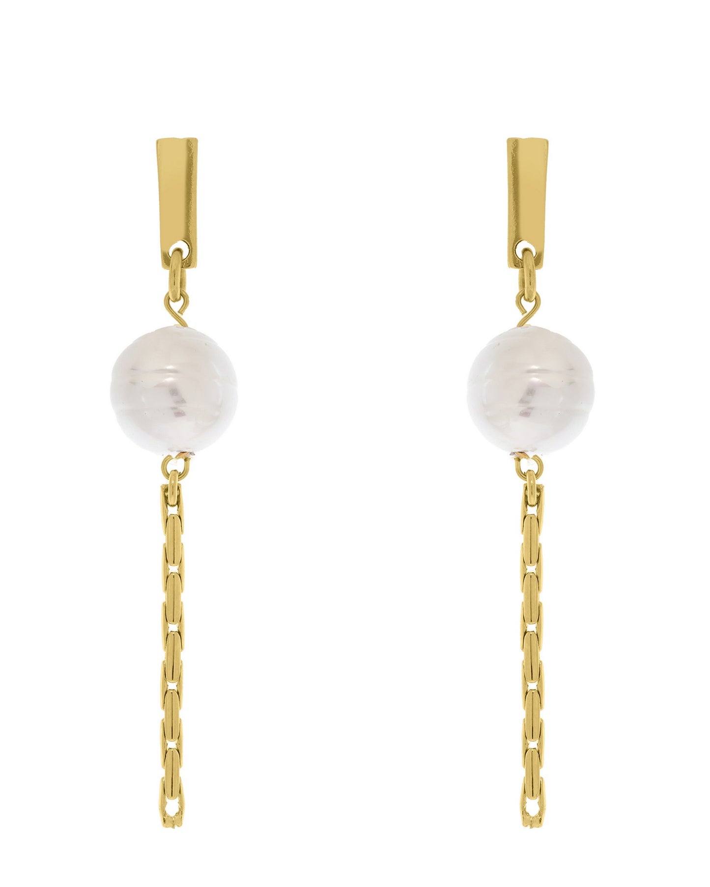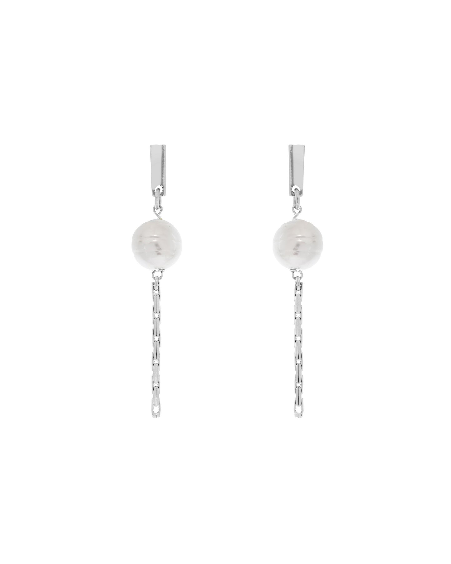 Pendientes con colgante de perla de estilo barroco con cadena tipo avena en el extremo.