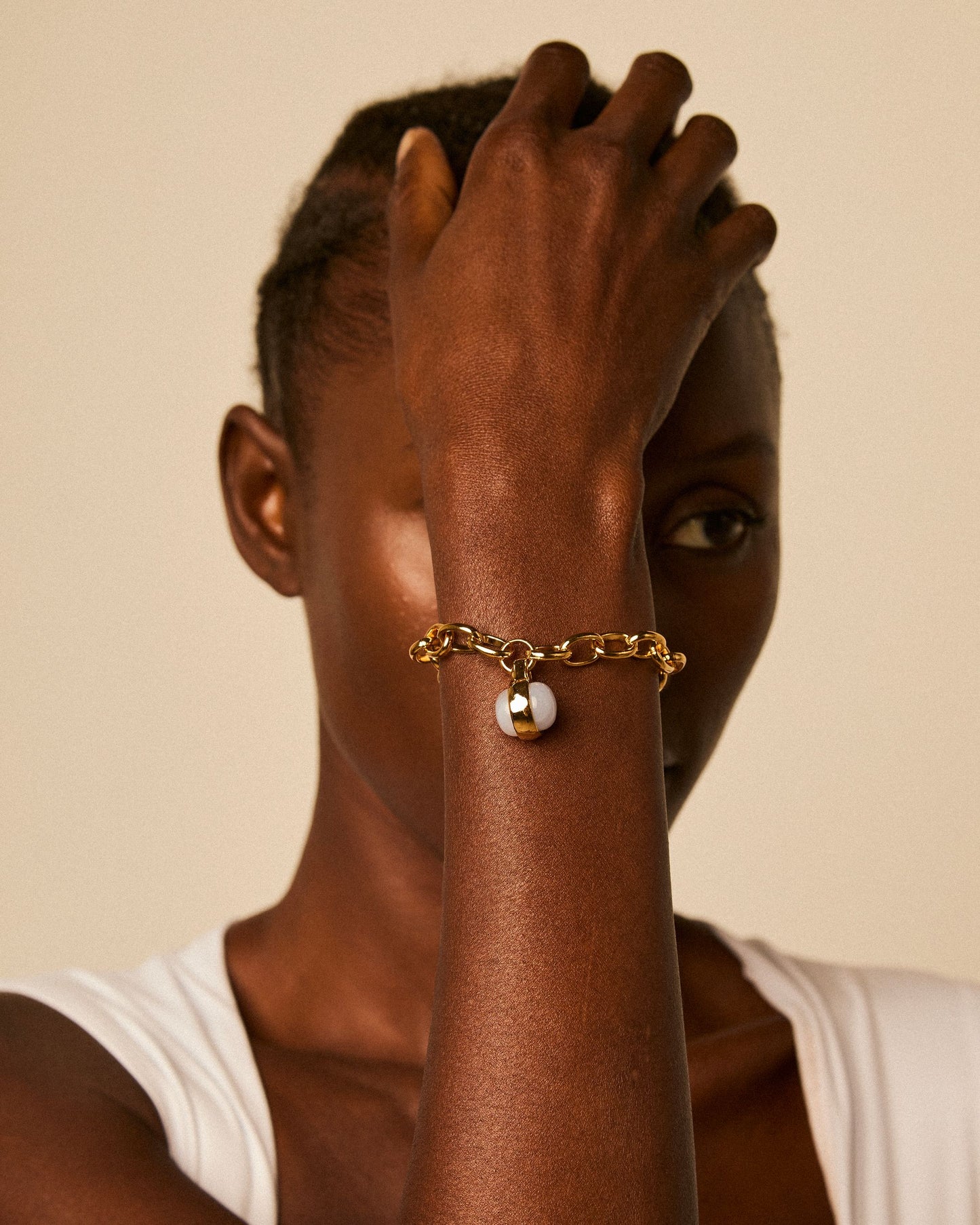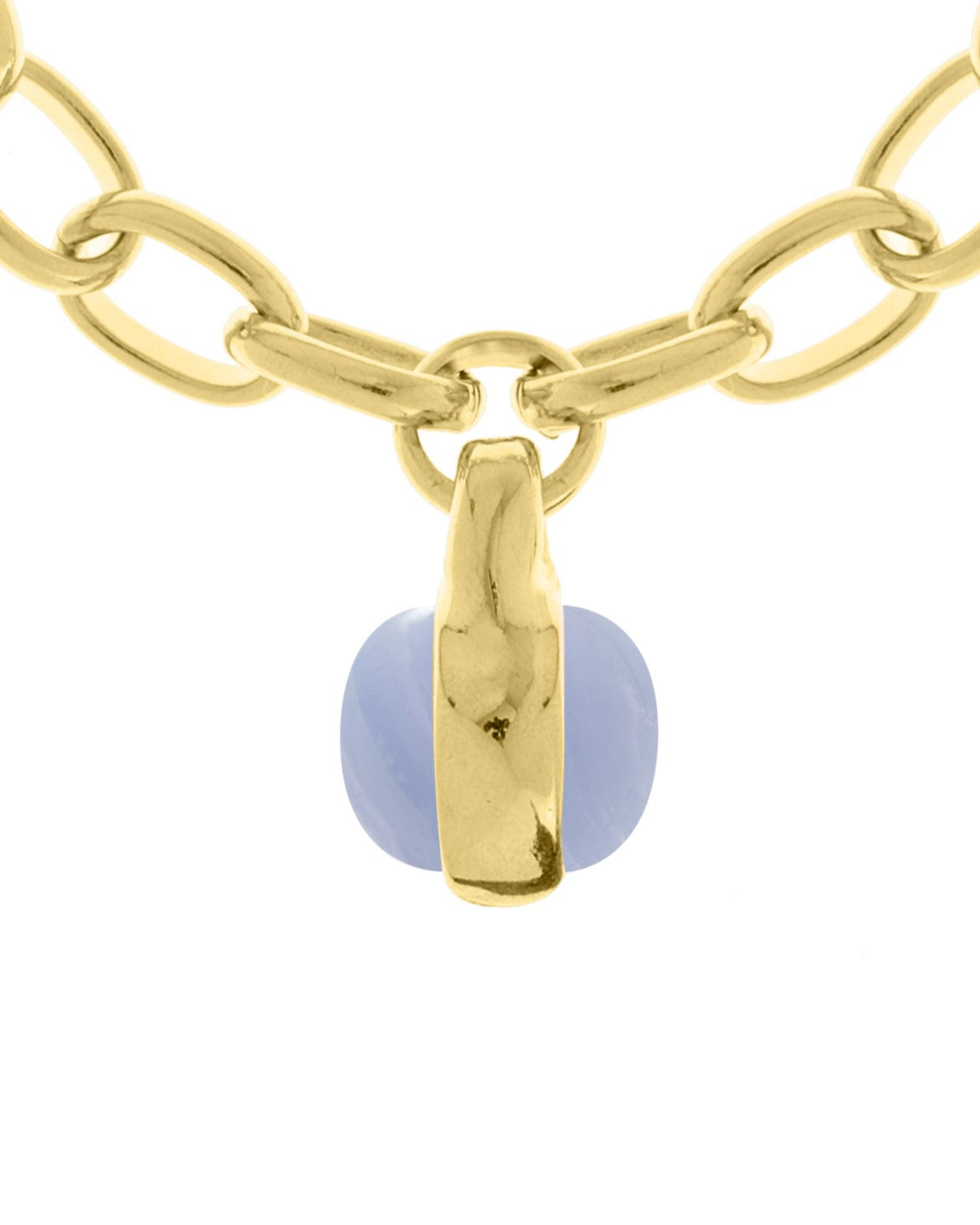 Pulsera de cadena con un pequeño colgante metálico redondo con una piedra semipreciosa redonda en cada lado.