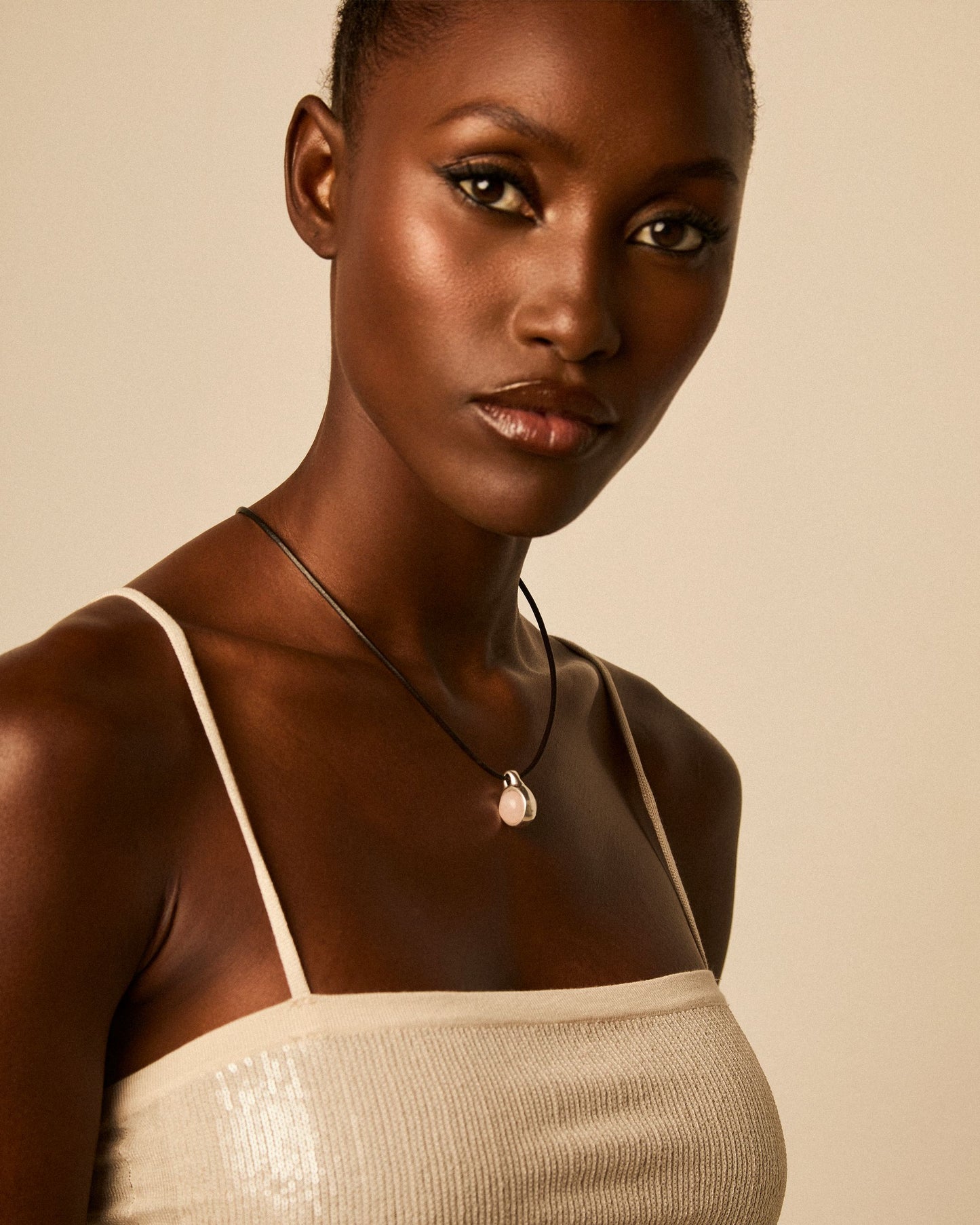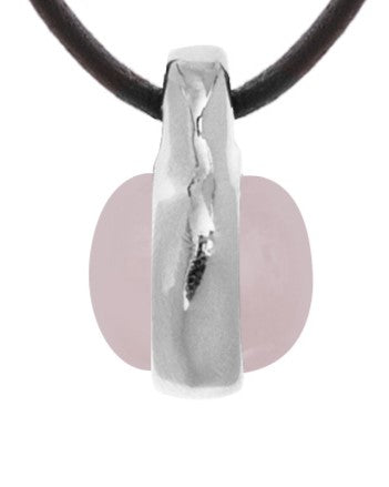 Collar de cordon de cuero fino con un colgante metálico redondo con una piedra semipreciosa redonda en cada lado.