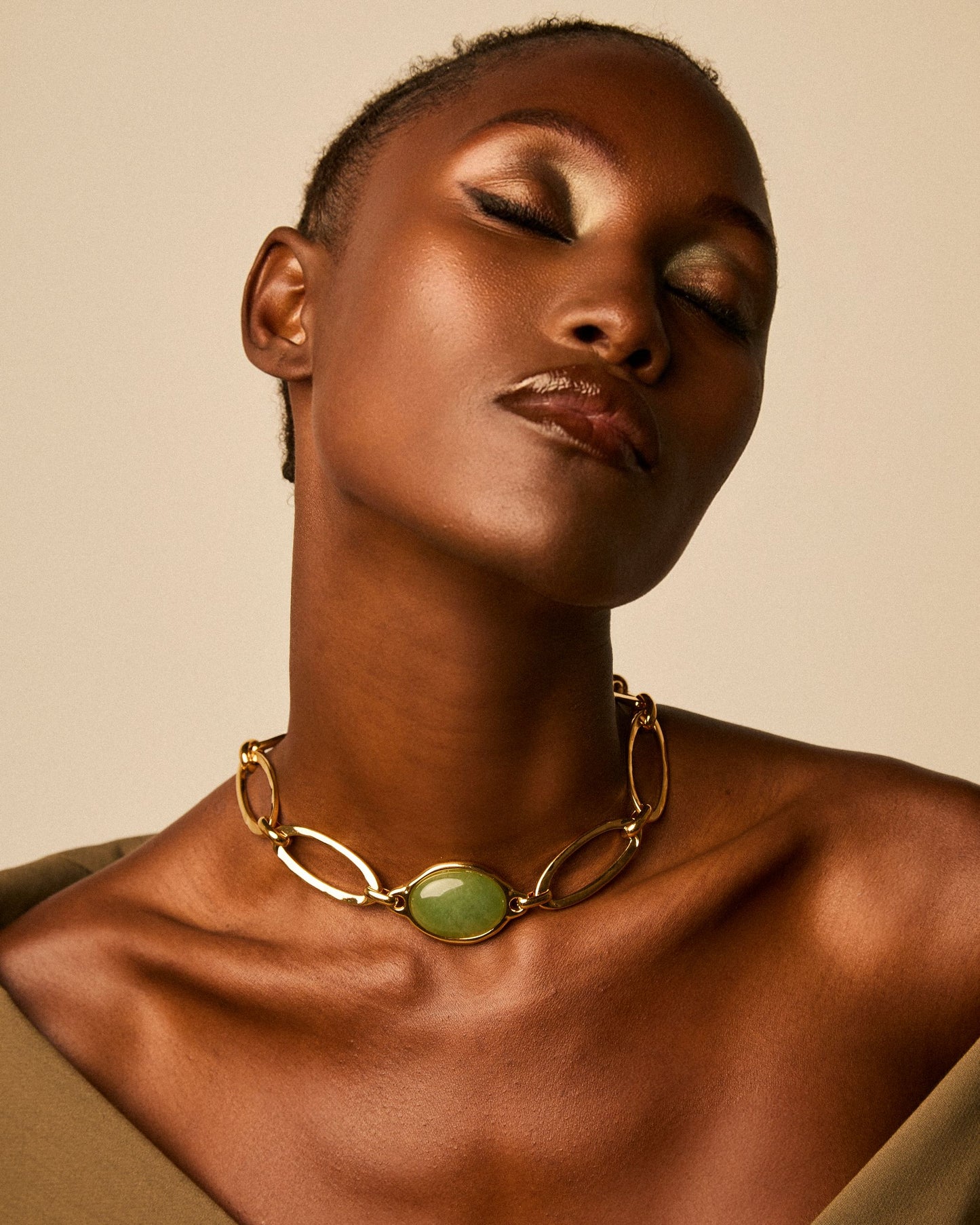 Collar de eslabones ovalados unidos en cadena con una pieza metálica ovalada con una piedra semipreciosa en el centro.