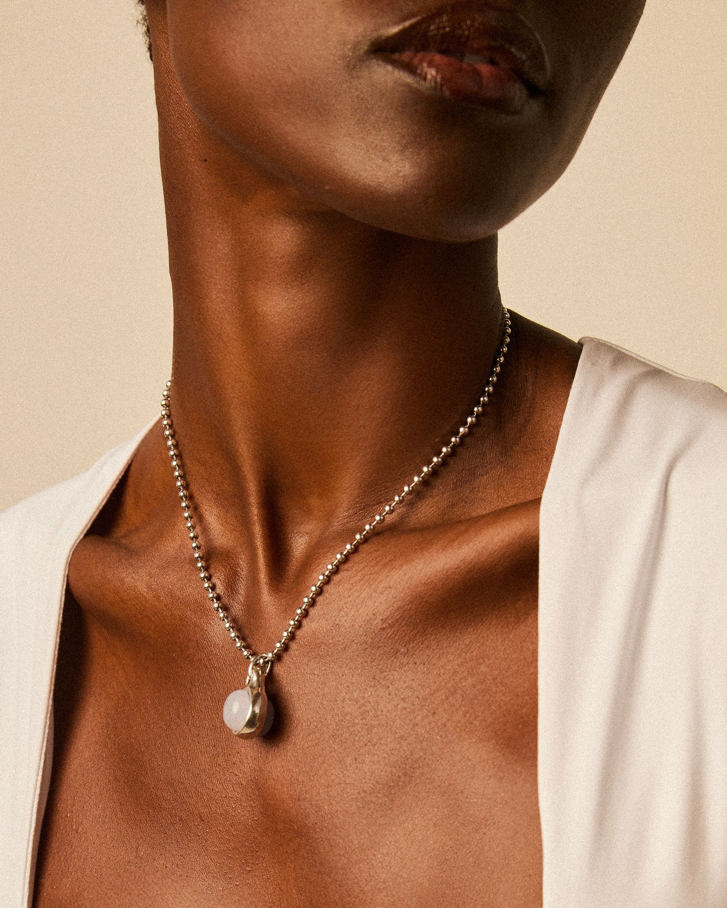 Collar de cadena de bolas con un colgante metálico redondo con una piedra semipreciosa redonda en cada lado.