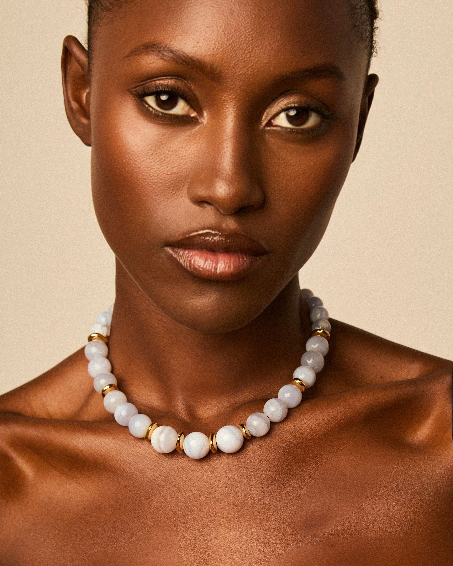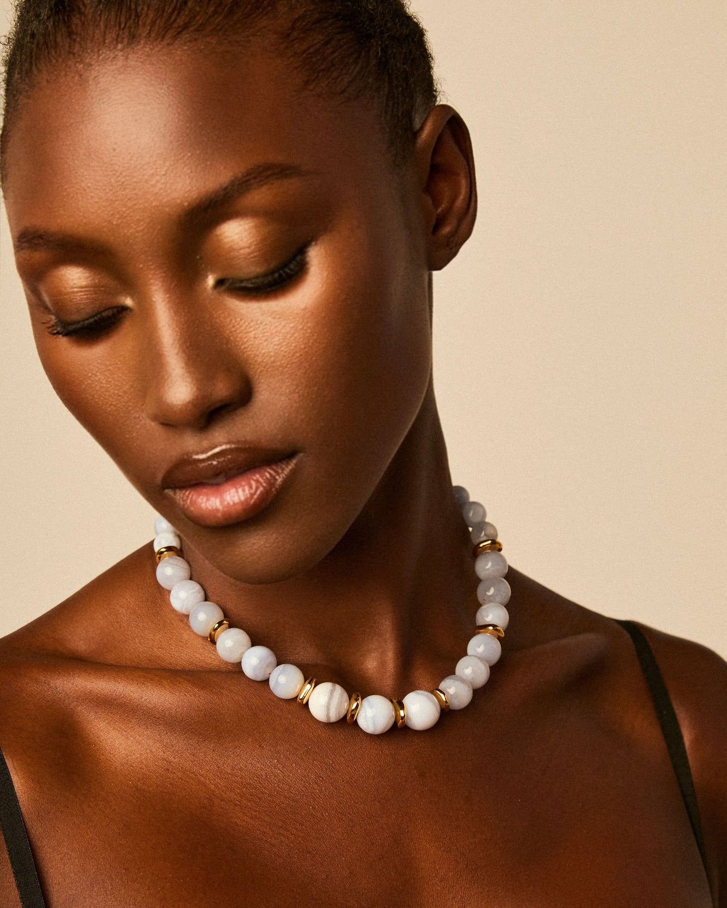 Collar de cordón de cuero elaborado con una combinación de cuentas de piedras semipreciosas y cuentas metálicas.
