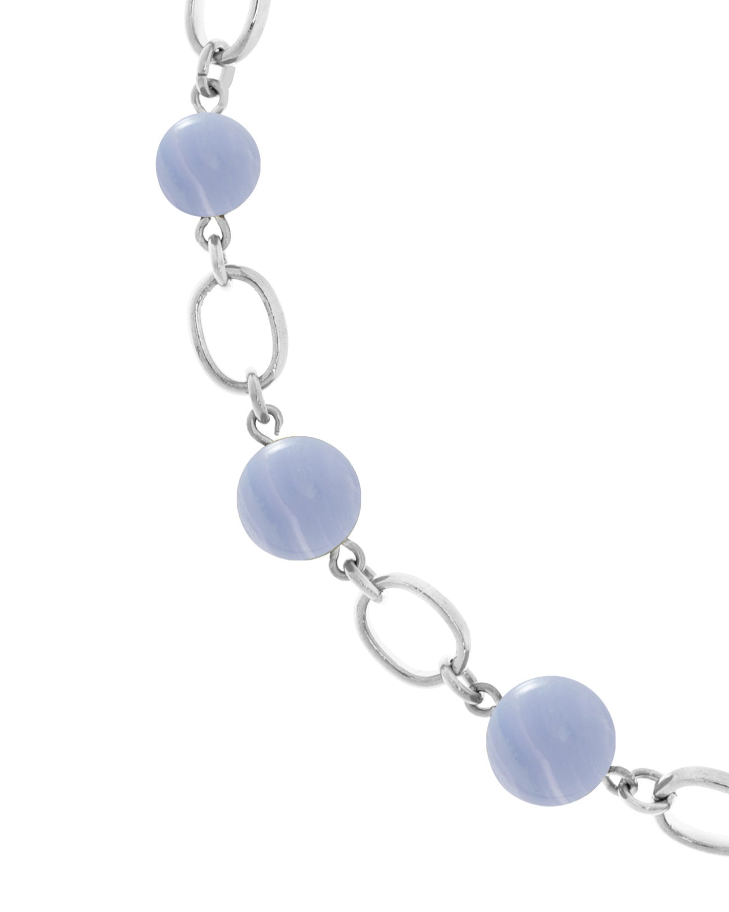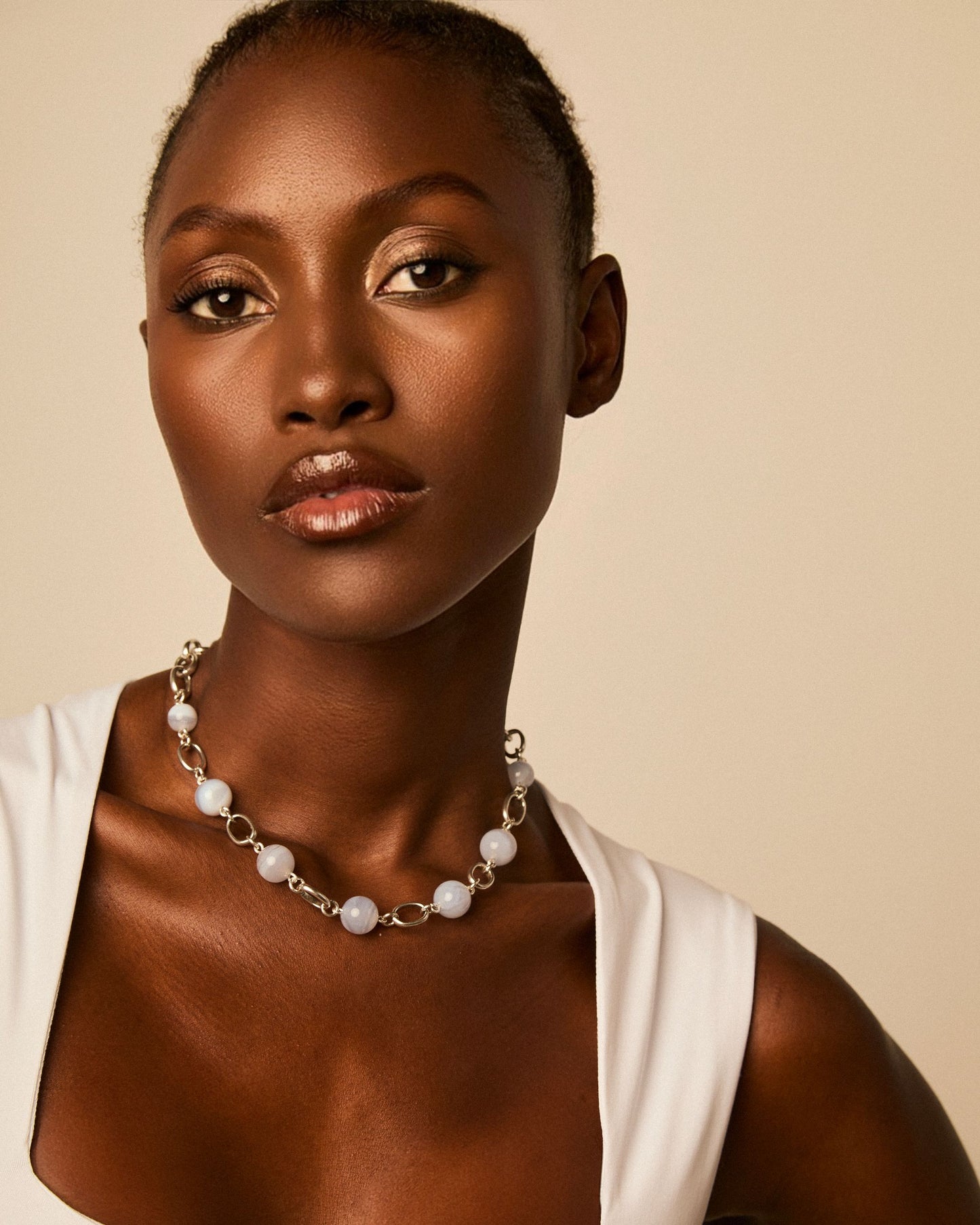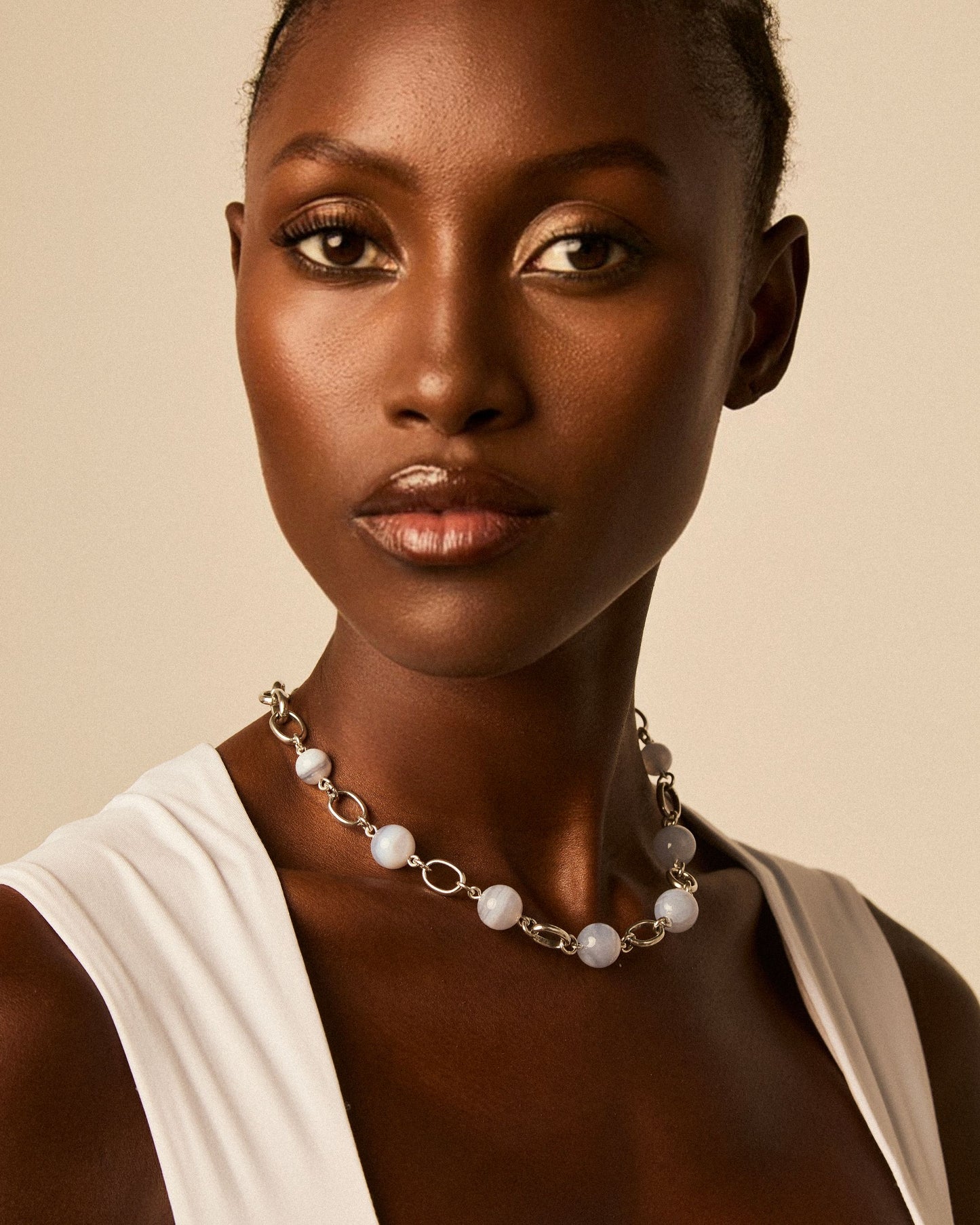 Collar de cadena con siete piedras semipreciosas redondas de diferentes tamaños espaciadas de manera uniforme.