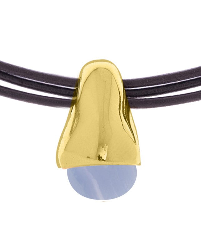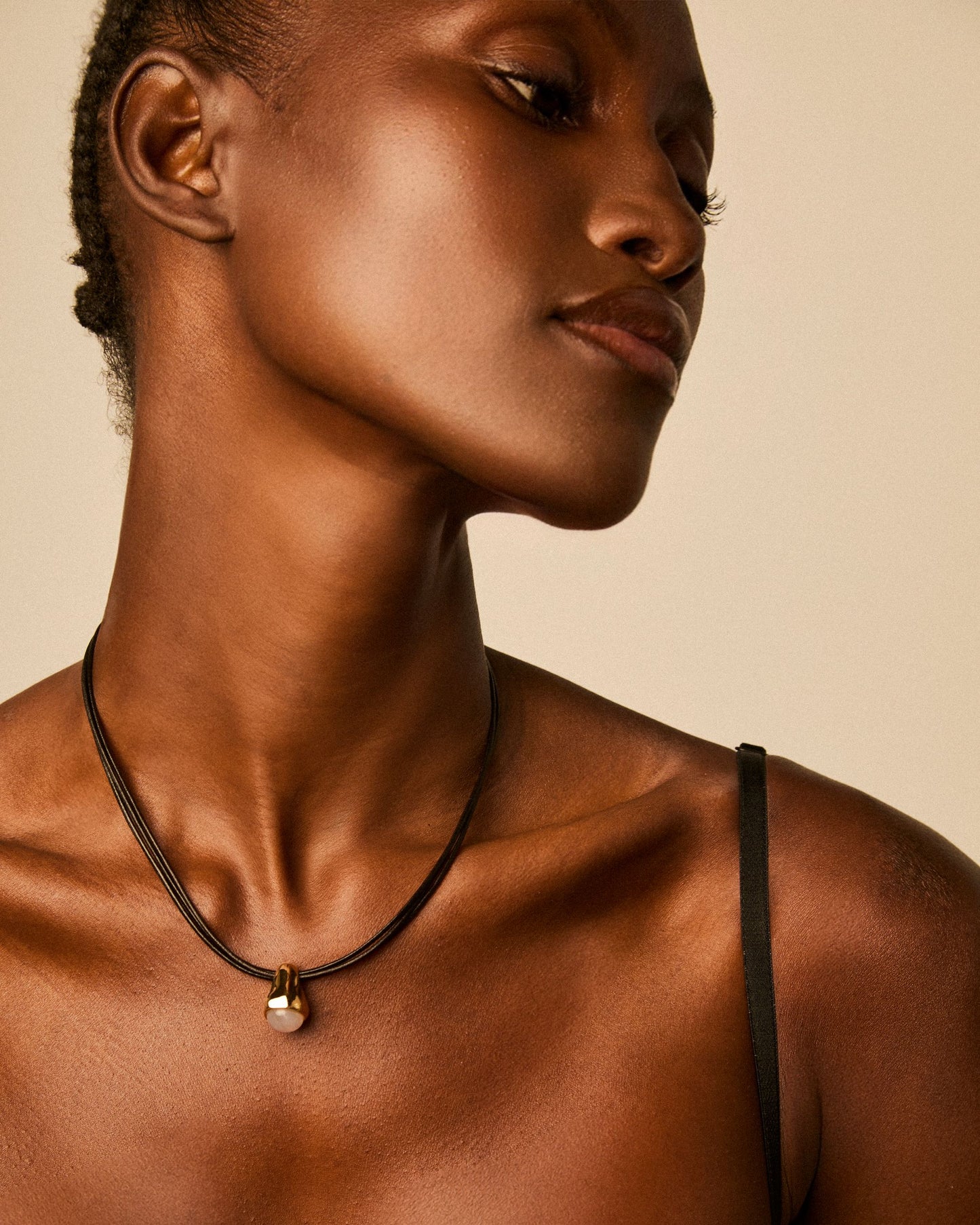 Collar de triple cordón de cuero con un gran colgante en forma de gota con una piedra semipreciosa en la punta.