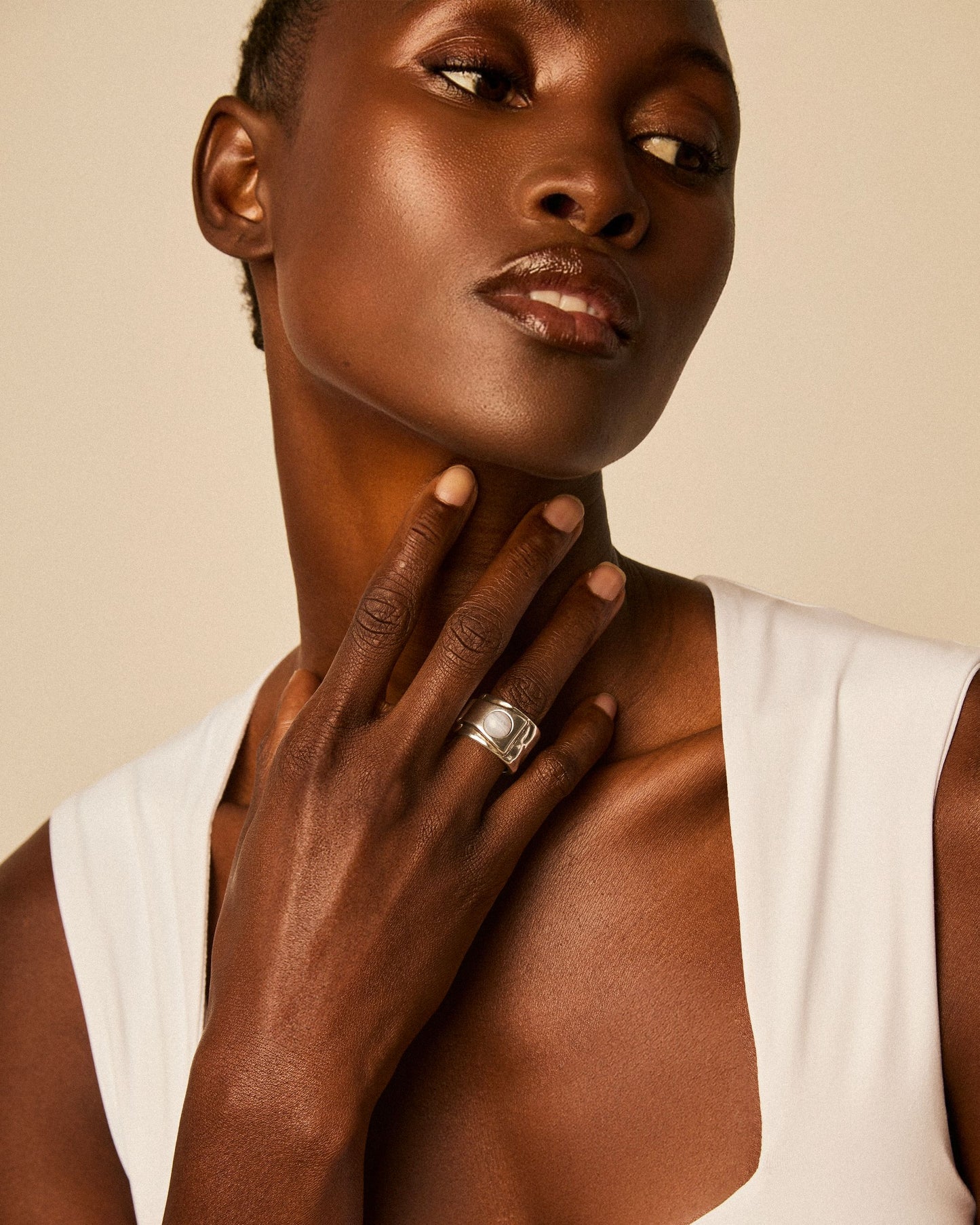 Anillo ancho con una pequeña piedra semipreciosa redonda.