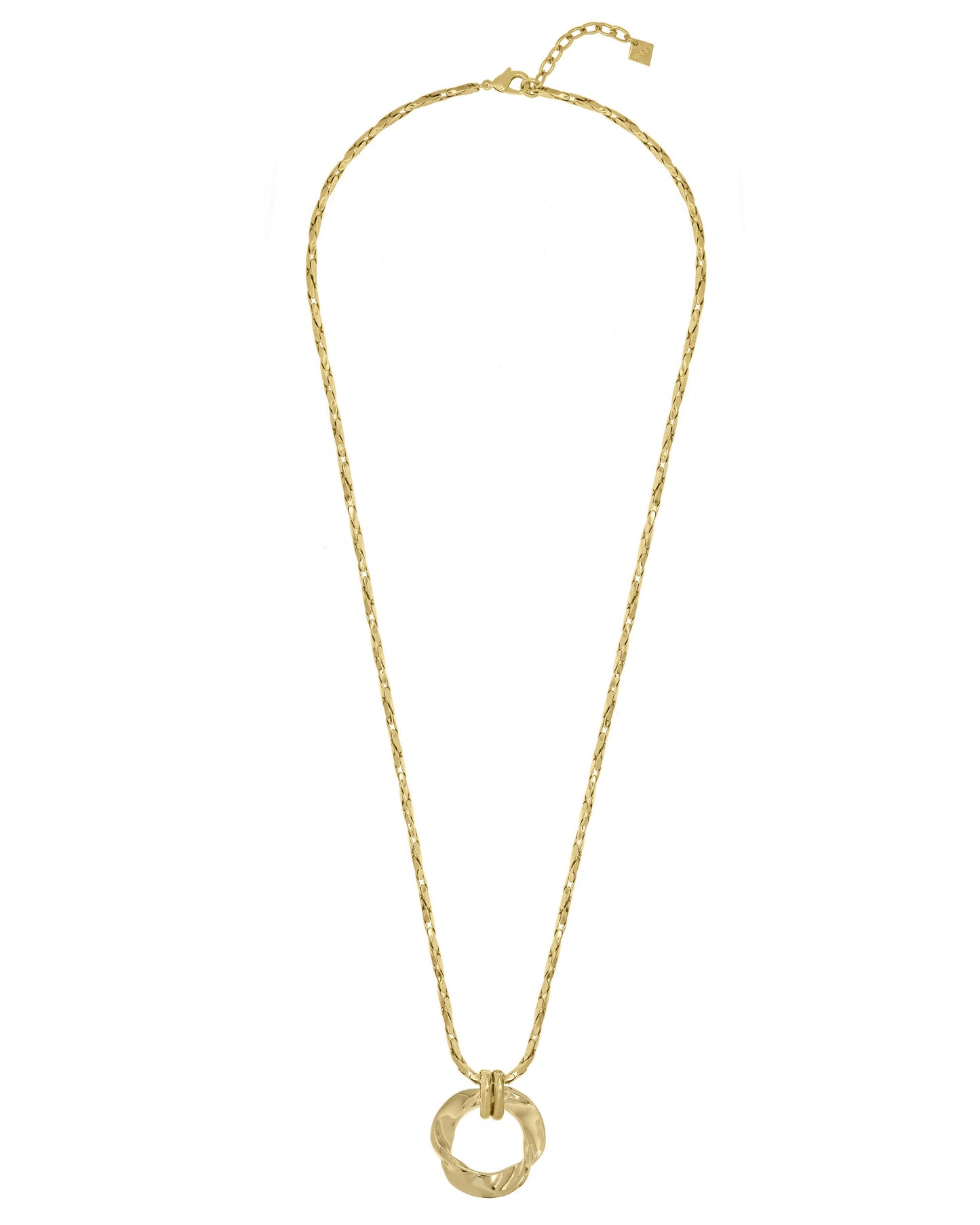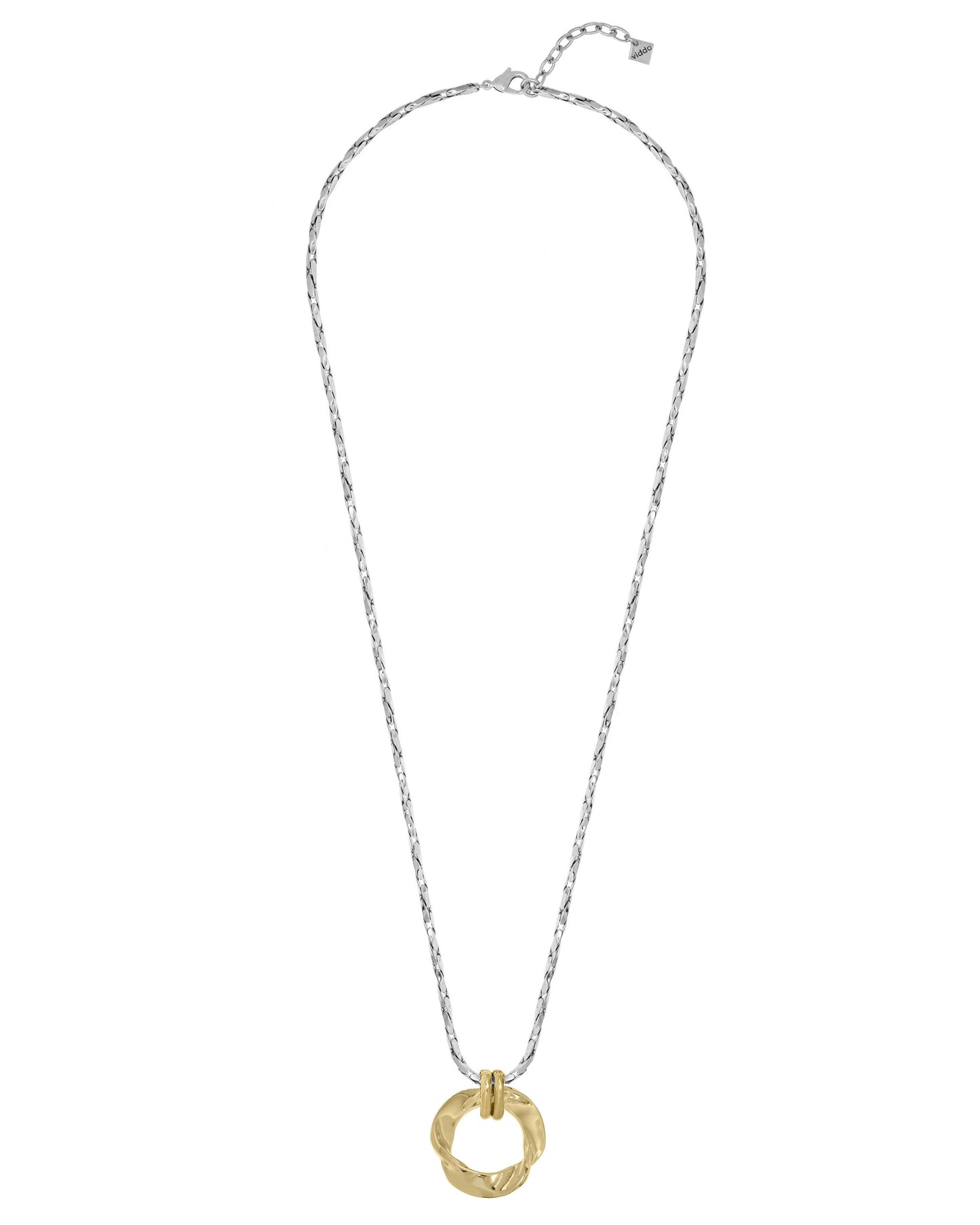 Collar lardo de cadena gruesa de tipo avena con colgante de pieza retorcida en forma circular.