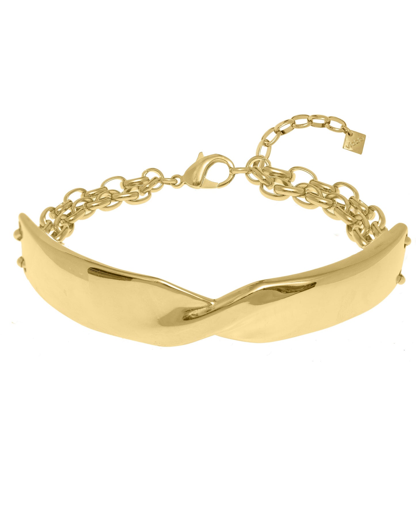 Precio regular $195.00Collar de tipo choker hecho con dos cadenas unidas mediante una pieza retorcida de metal.