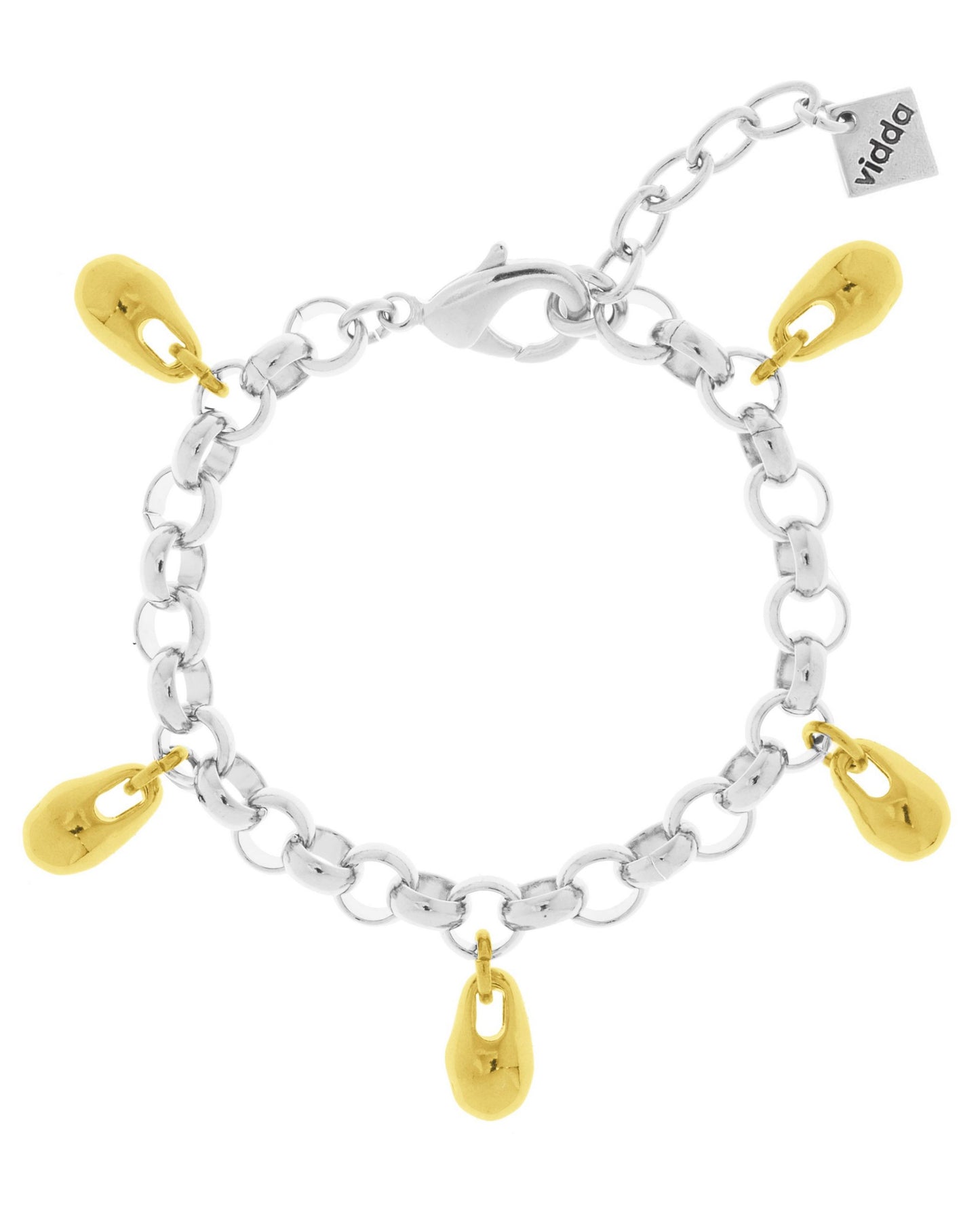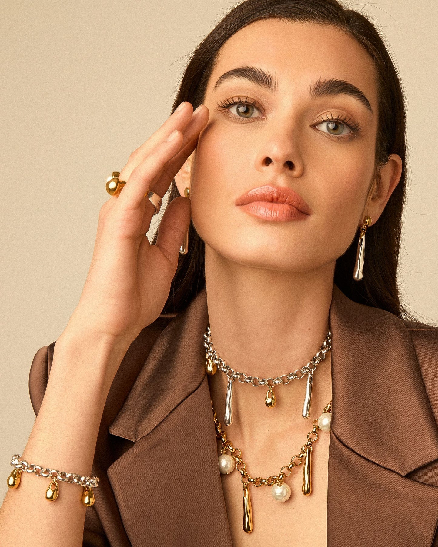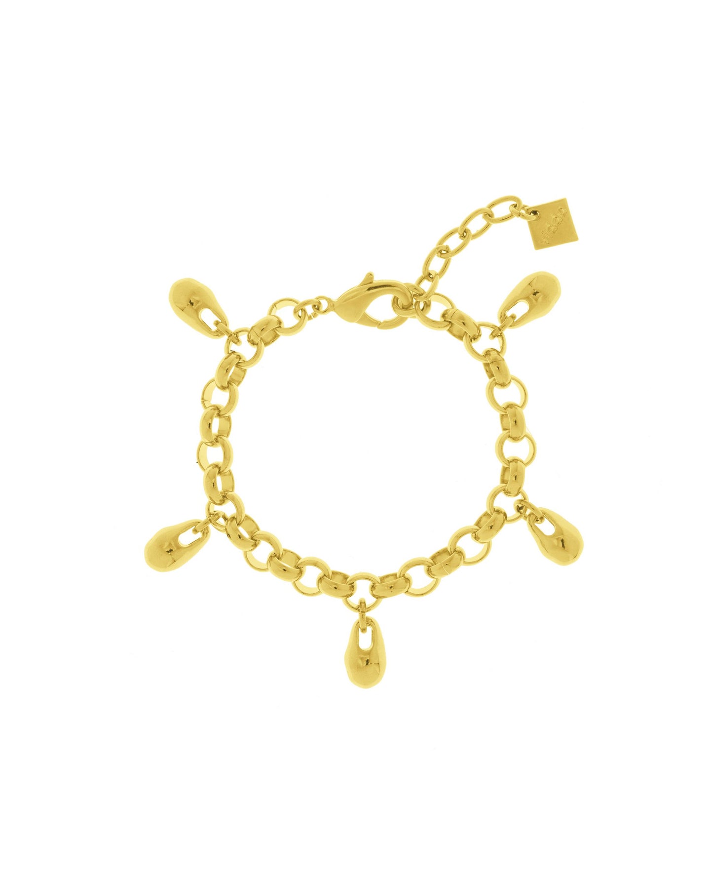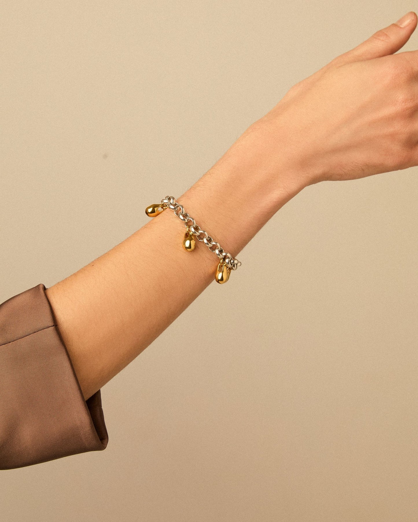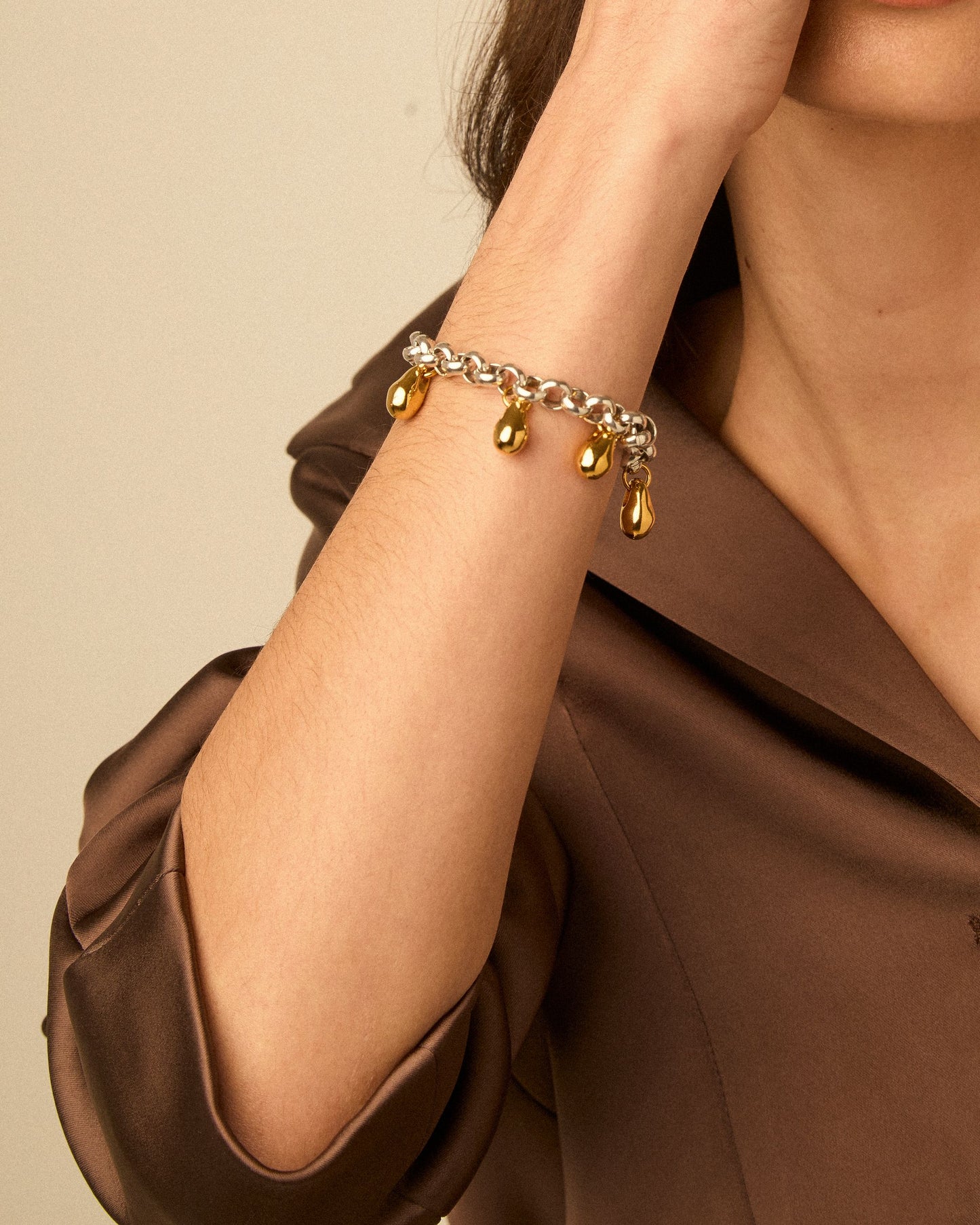 Pulsera de cadena con pequeños charms metálicos en forma de gota, dispuestos de manera uniforme a lo largo de la cadena.