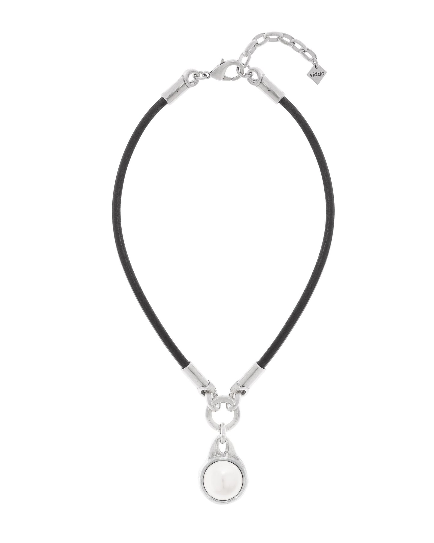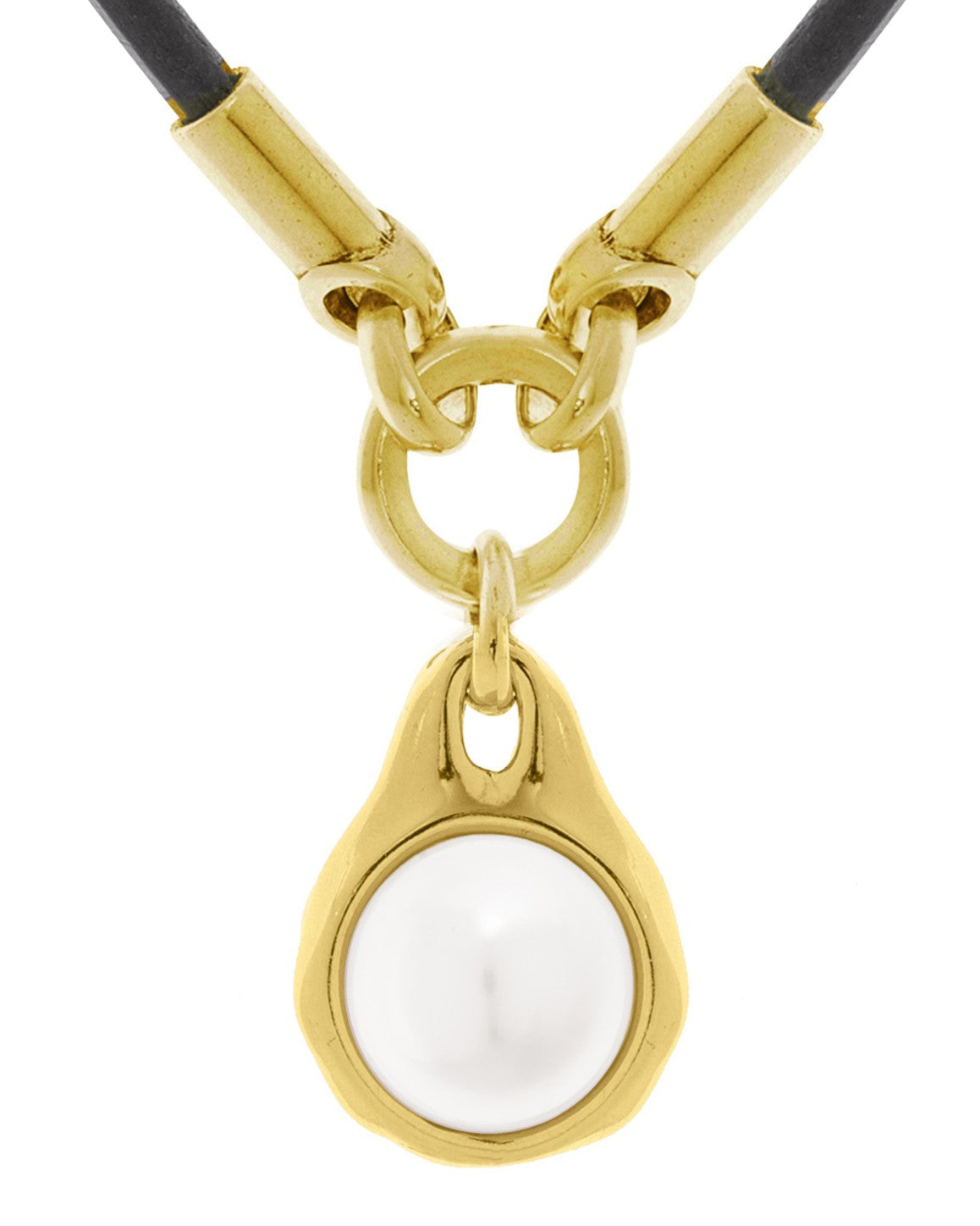 Collar de cordón de cuero grueso, con un anillo circular y un colgante metálico redondo con una perla redonda en cada lado.