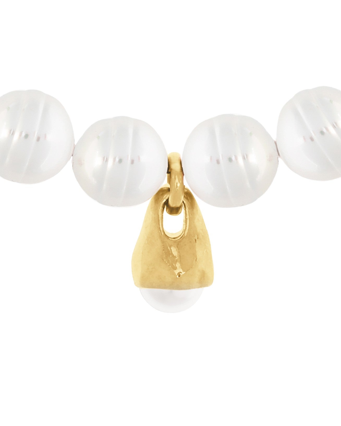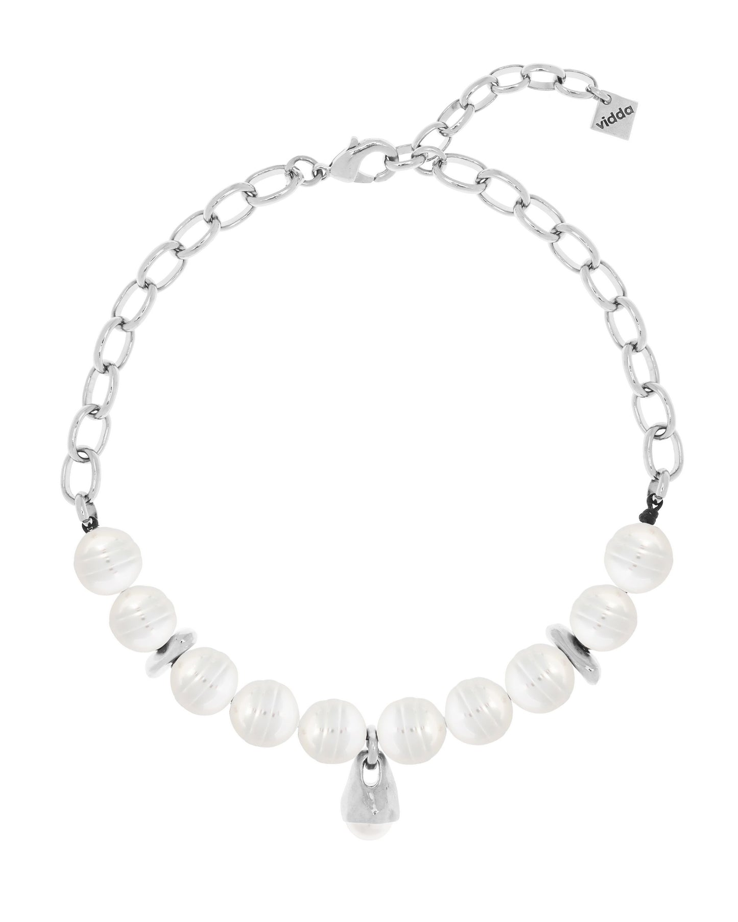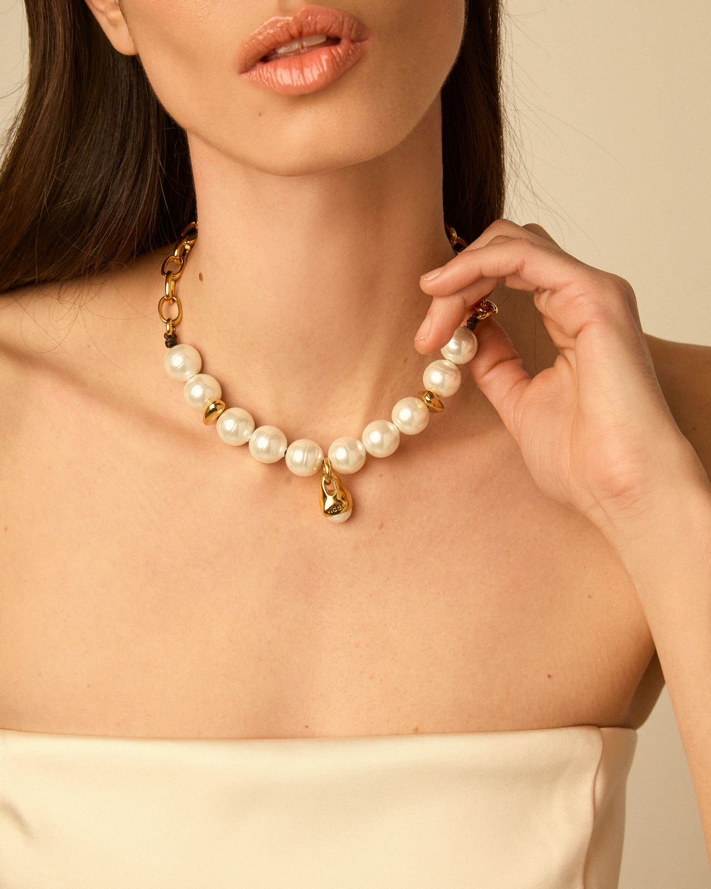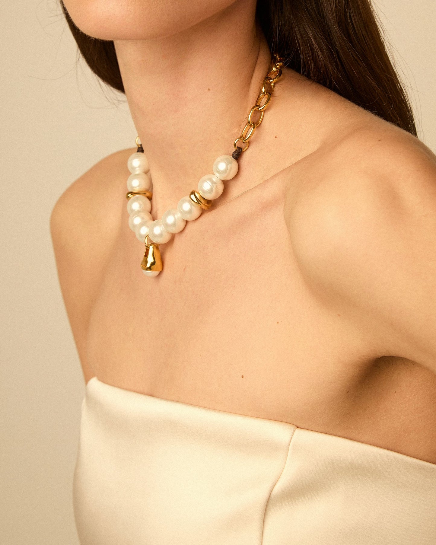 Collar de cadena combinado con cordón de cuero. Diseño central elaborado con una combinación de cuentas de perlas y cuentas metálicas insertadas en el cuero, con un colgante grande en forma de gota con una perla en la punta.