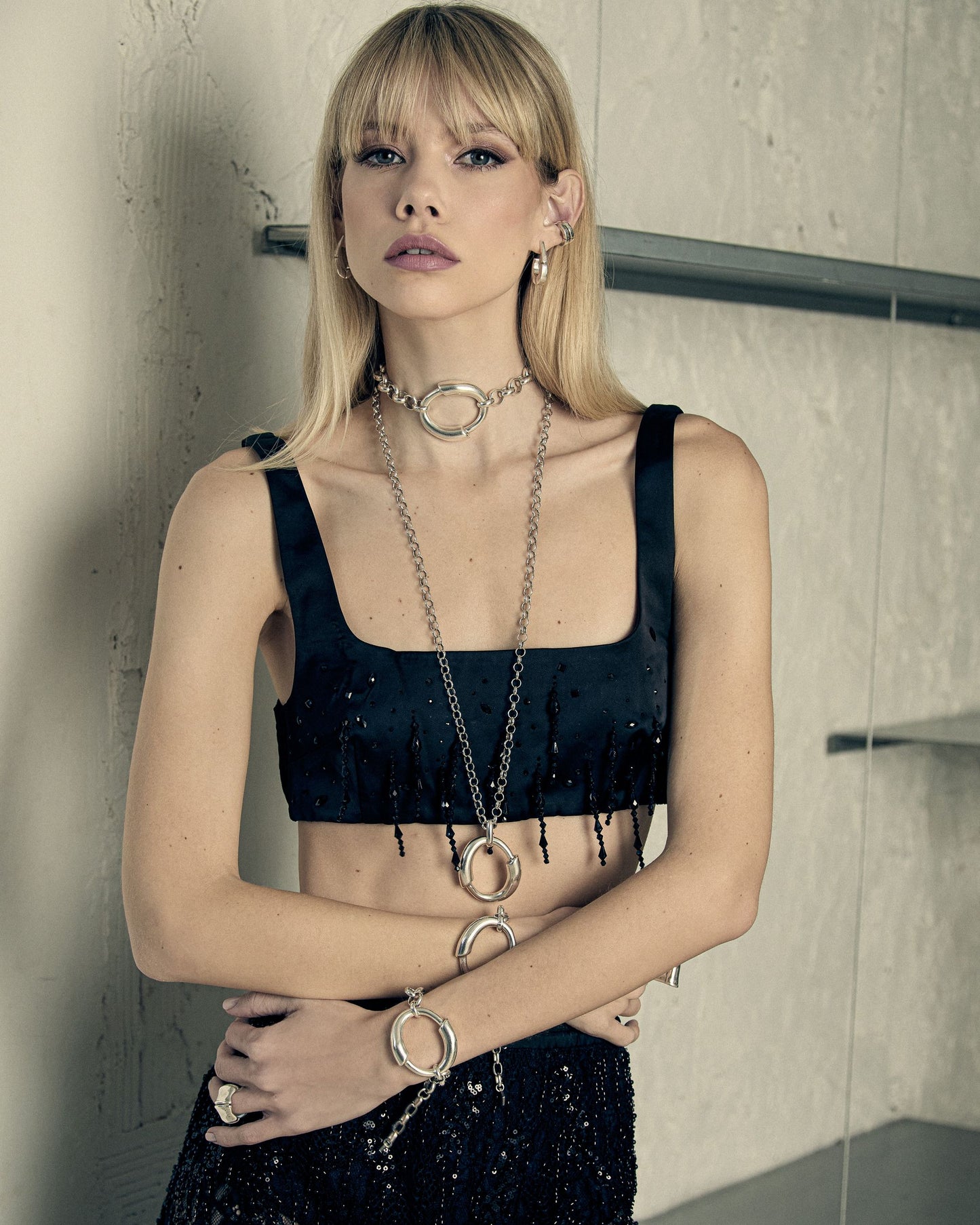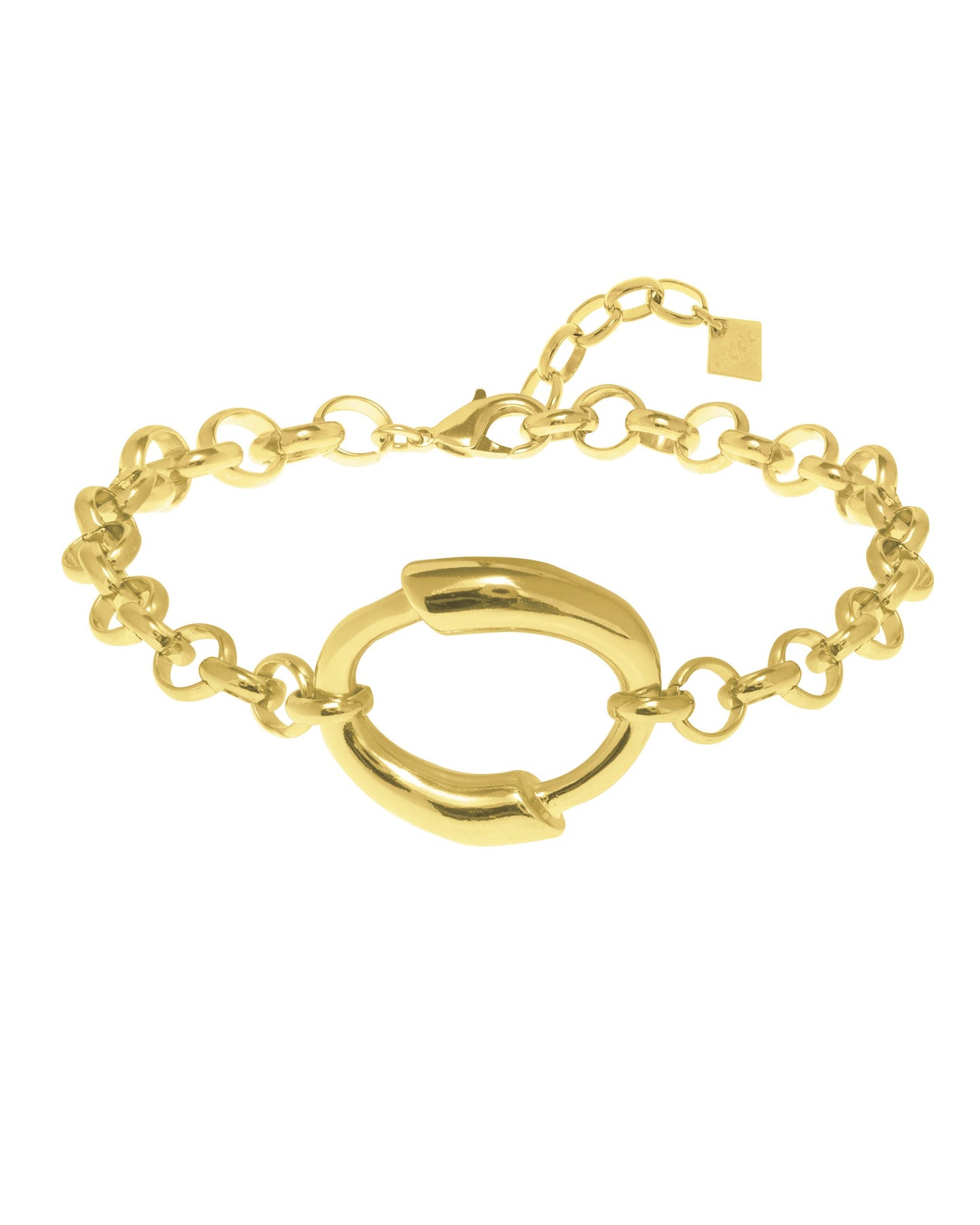 Choker de cadena tipo rolo con un eslabón central circular formado por dos elementos tubulares curvados, conectado a la cadena mediante eslabones de la misma.