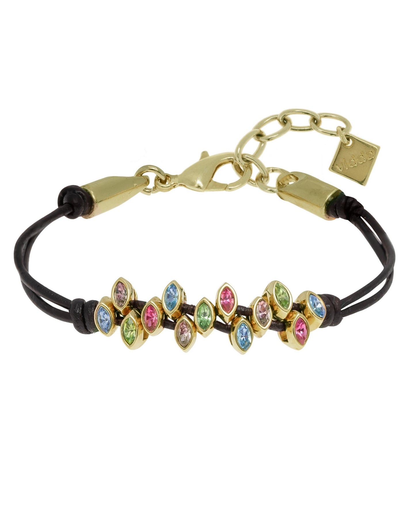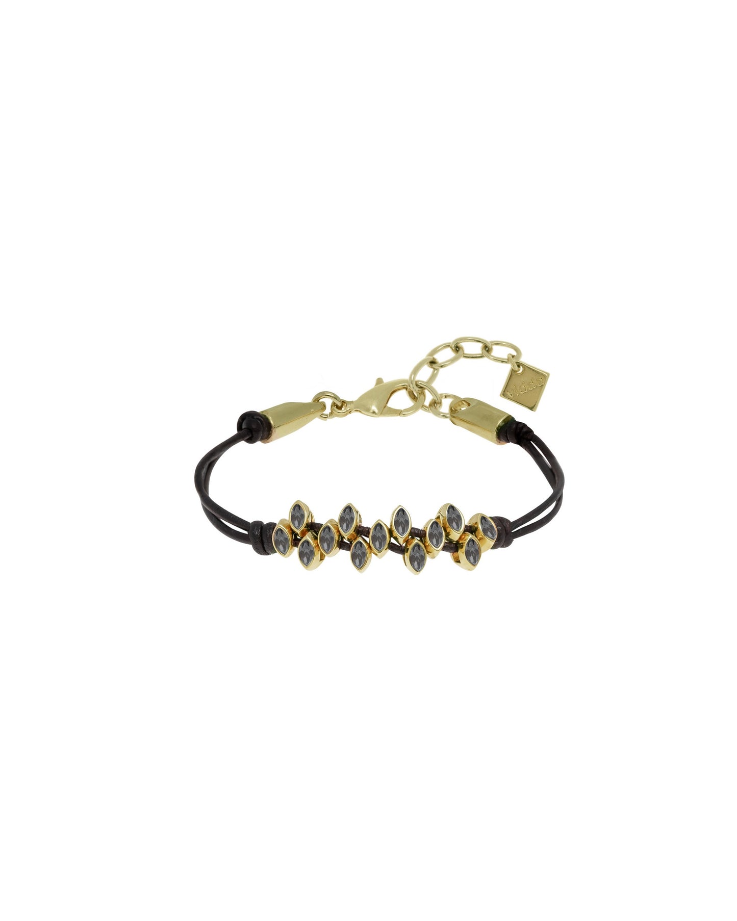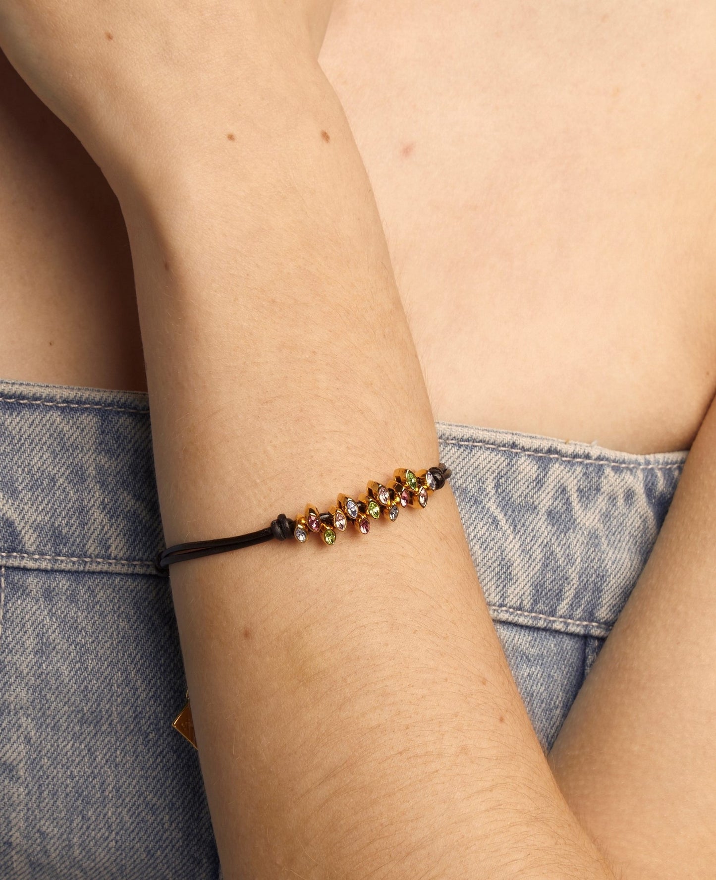 Precio regular $57.00Pulsera hecha con pequeñas piezas tipo navette con cristal Swarovski® introducidas de forma irregular en cordones de cuero.