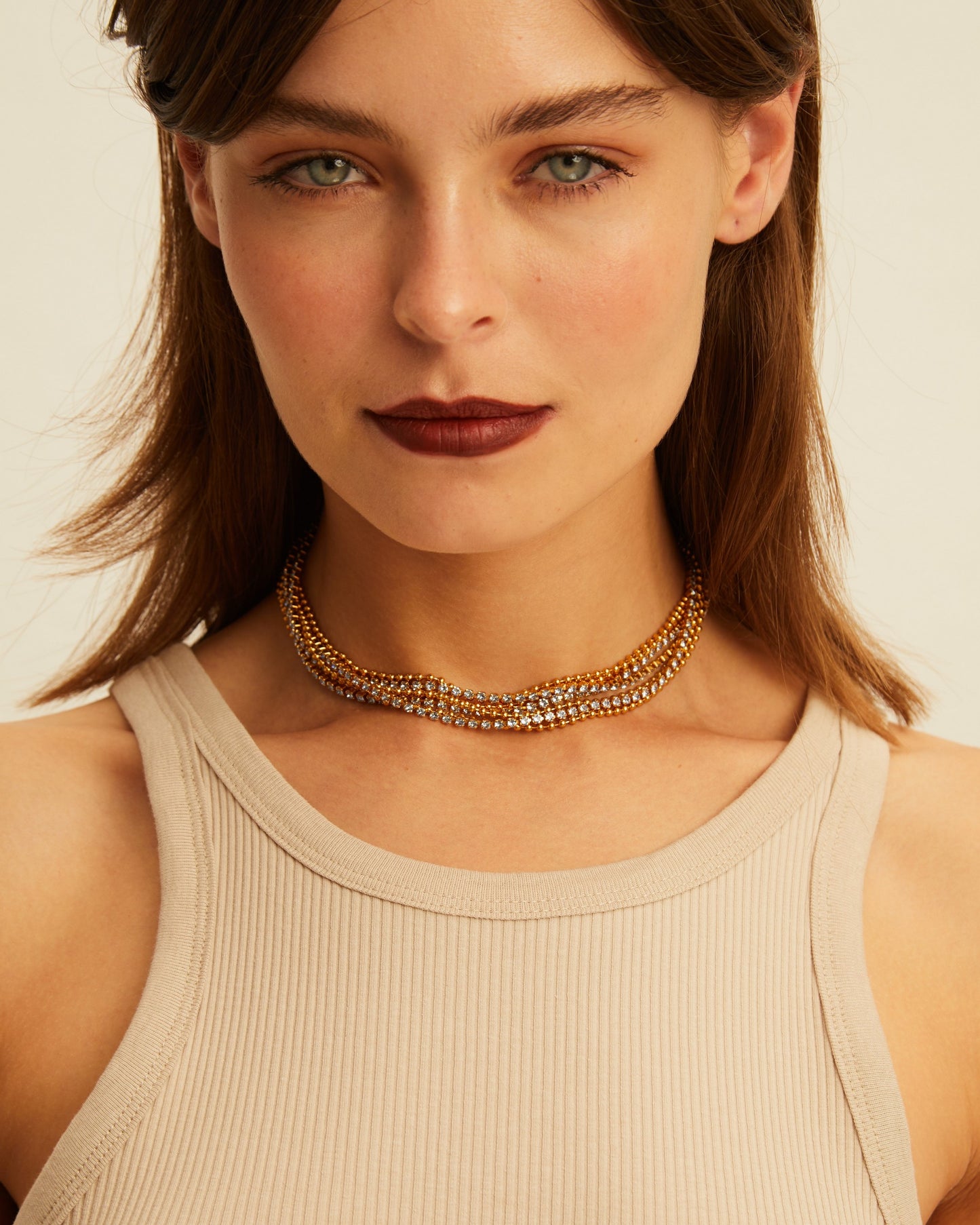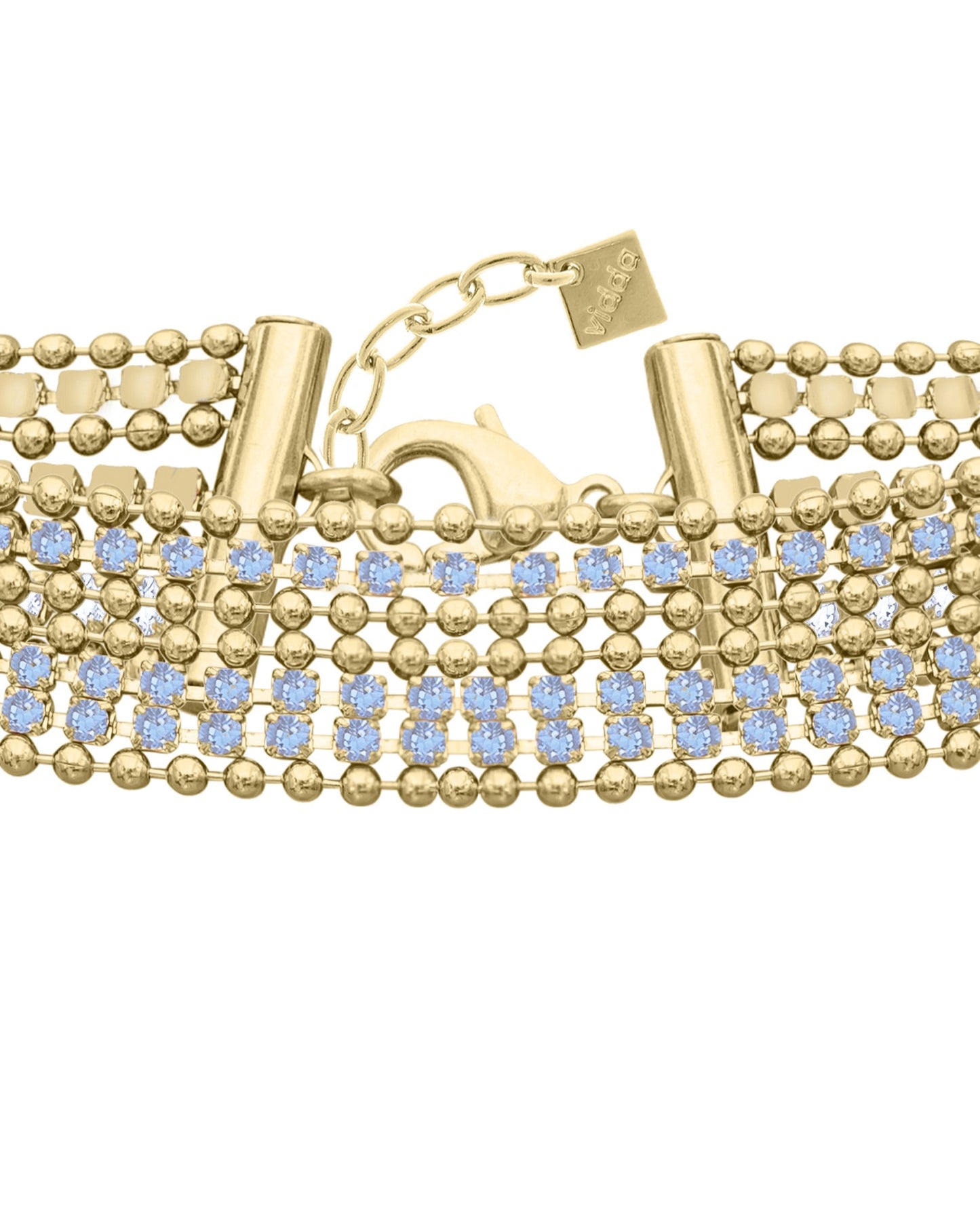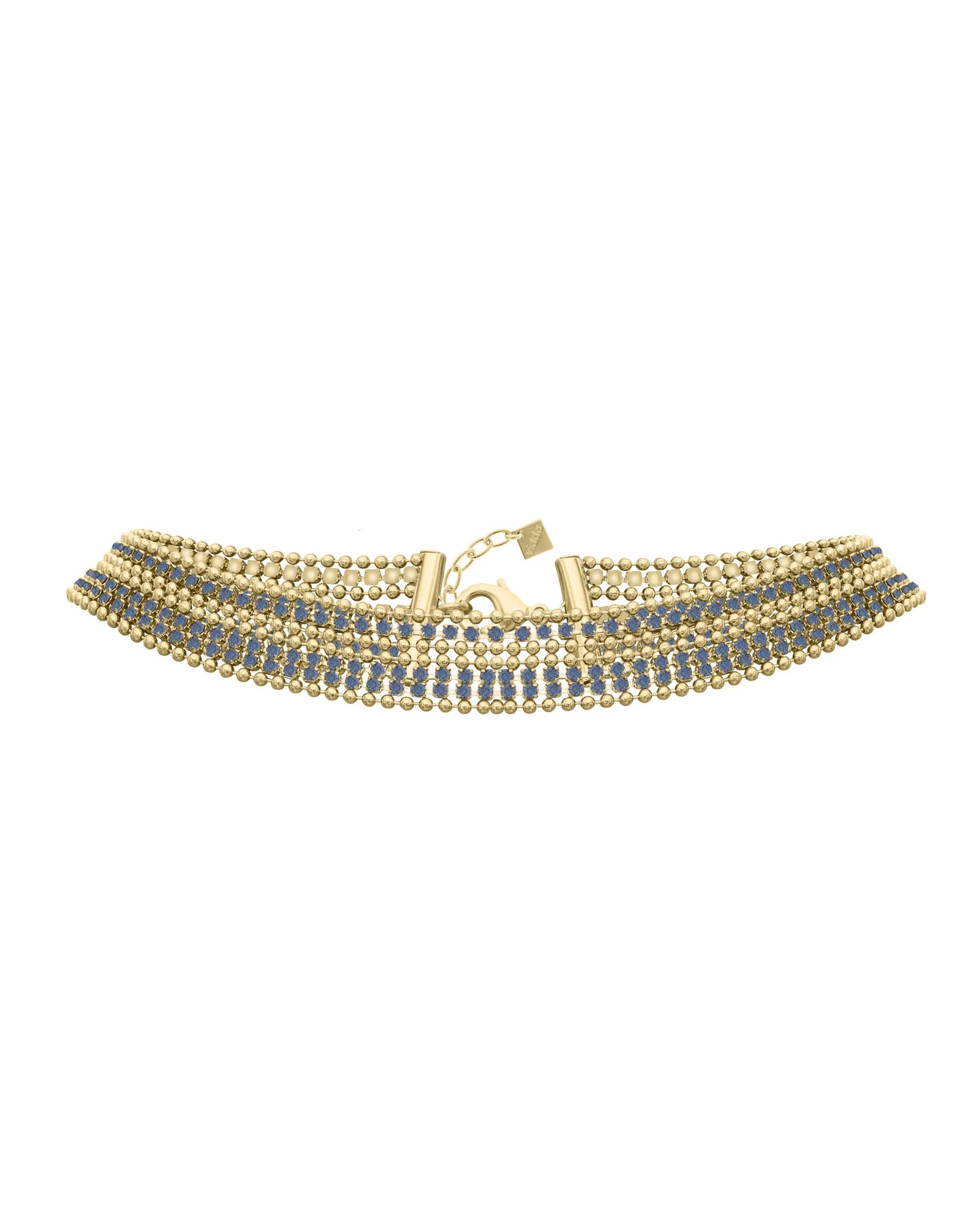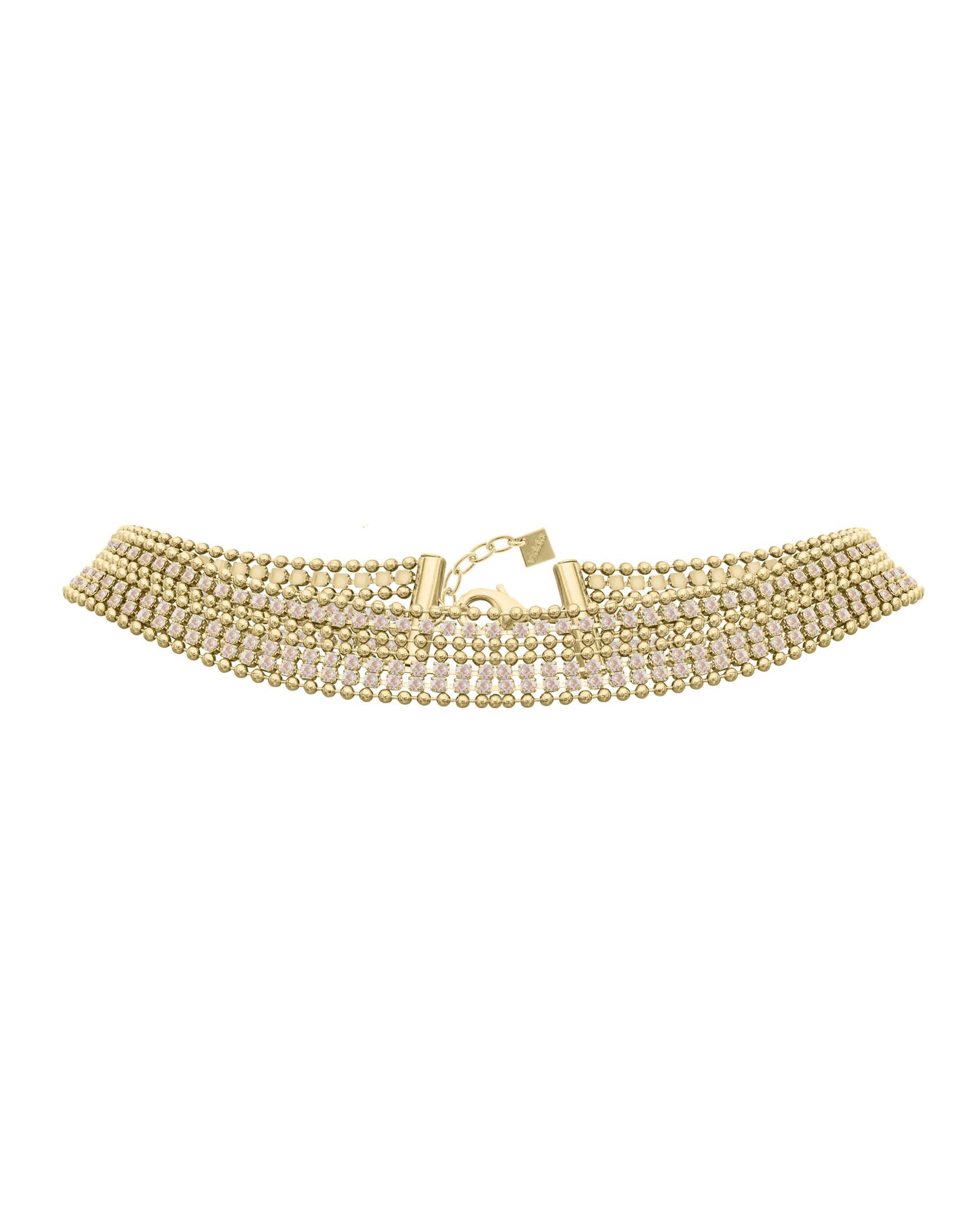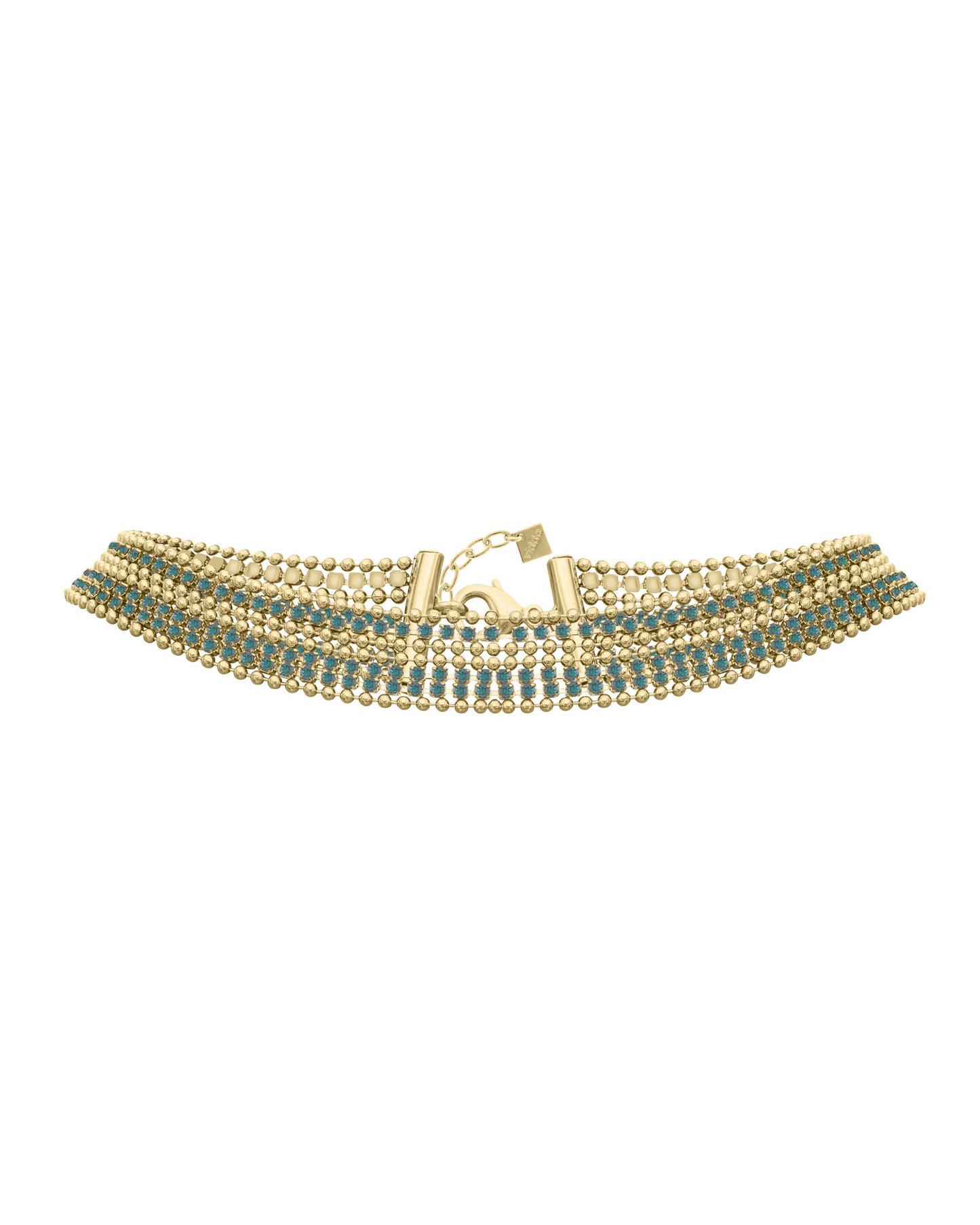 Precio regular $197.00Collar corto elaborado con finas tiras con cristales engarzados de alta calidad combinadas con cadenas de bolas.