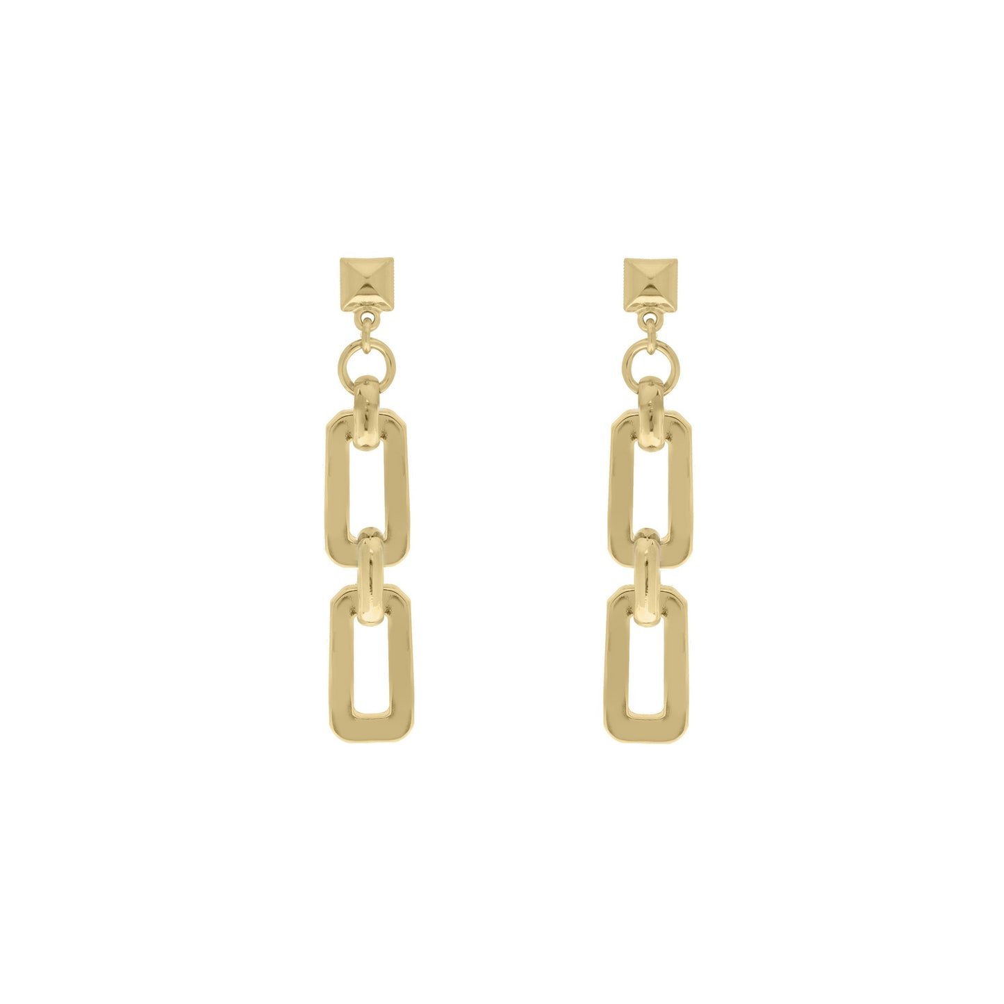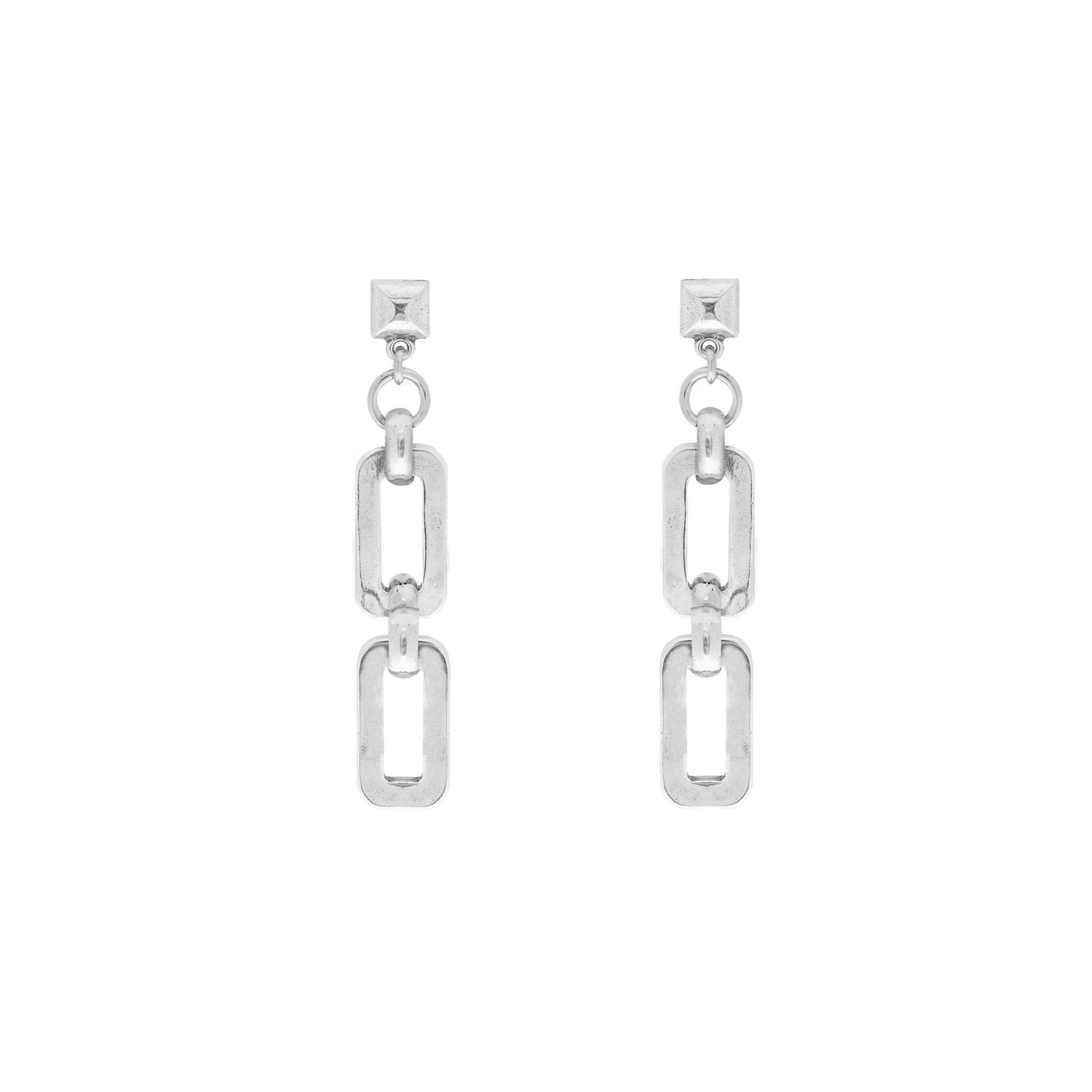 Pendientes largos hechos con dos pequeños eslabones rectangulares unidos entre si con una anilla de metal ovalada.