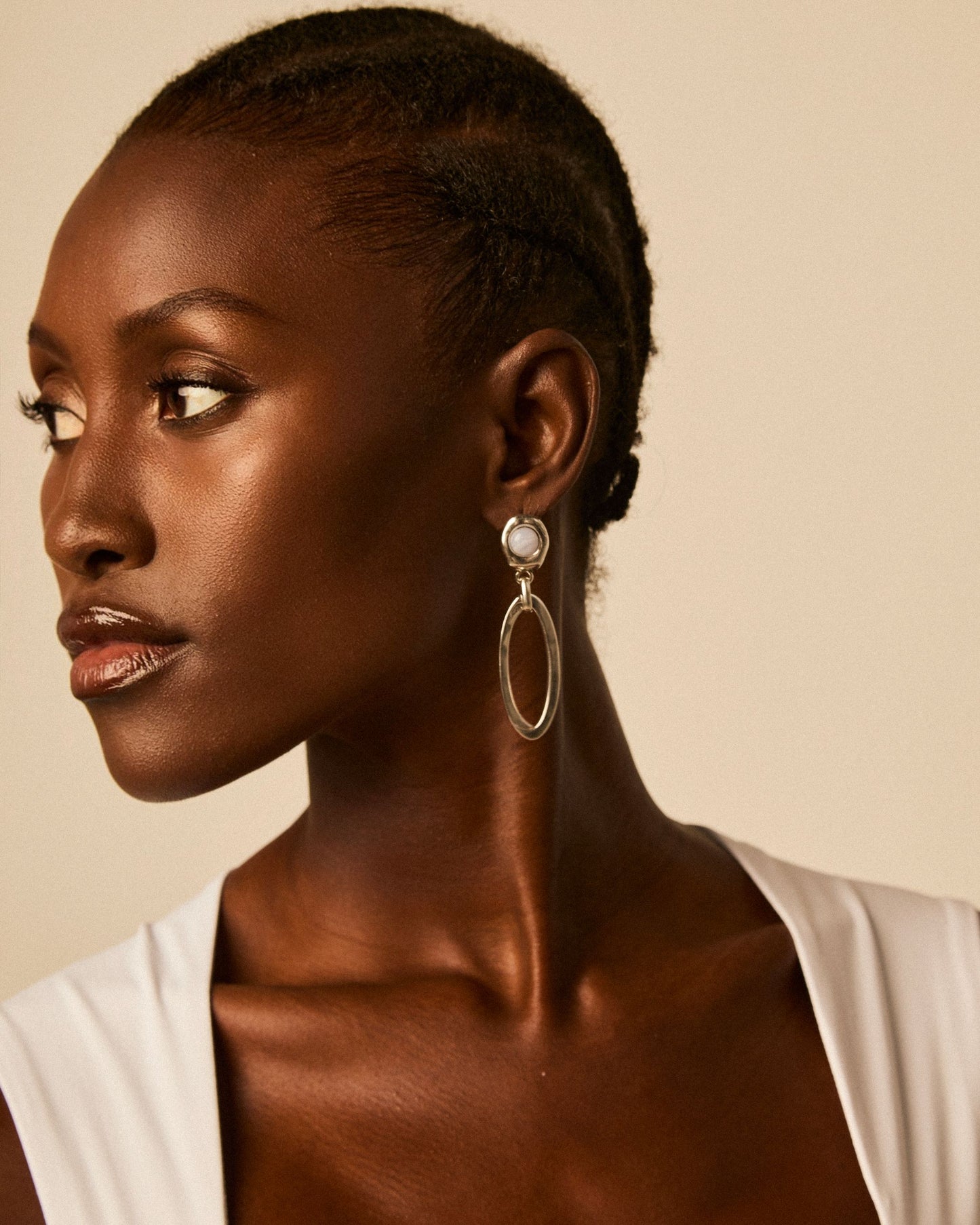 Pendientes largos con una piedra semipreciosa redonda en la base del pendiente y un colgante en forma de eslabón ovalado.