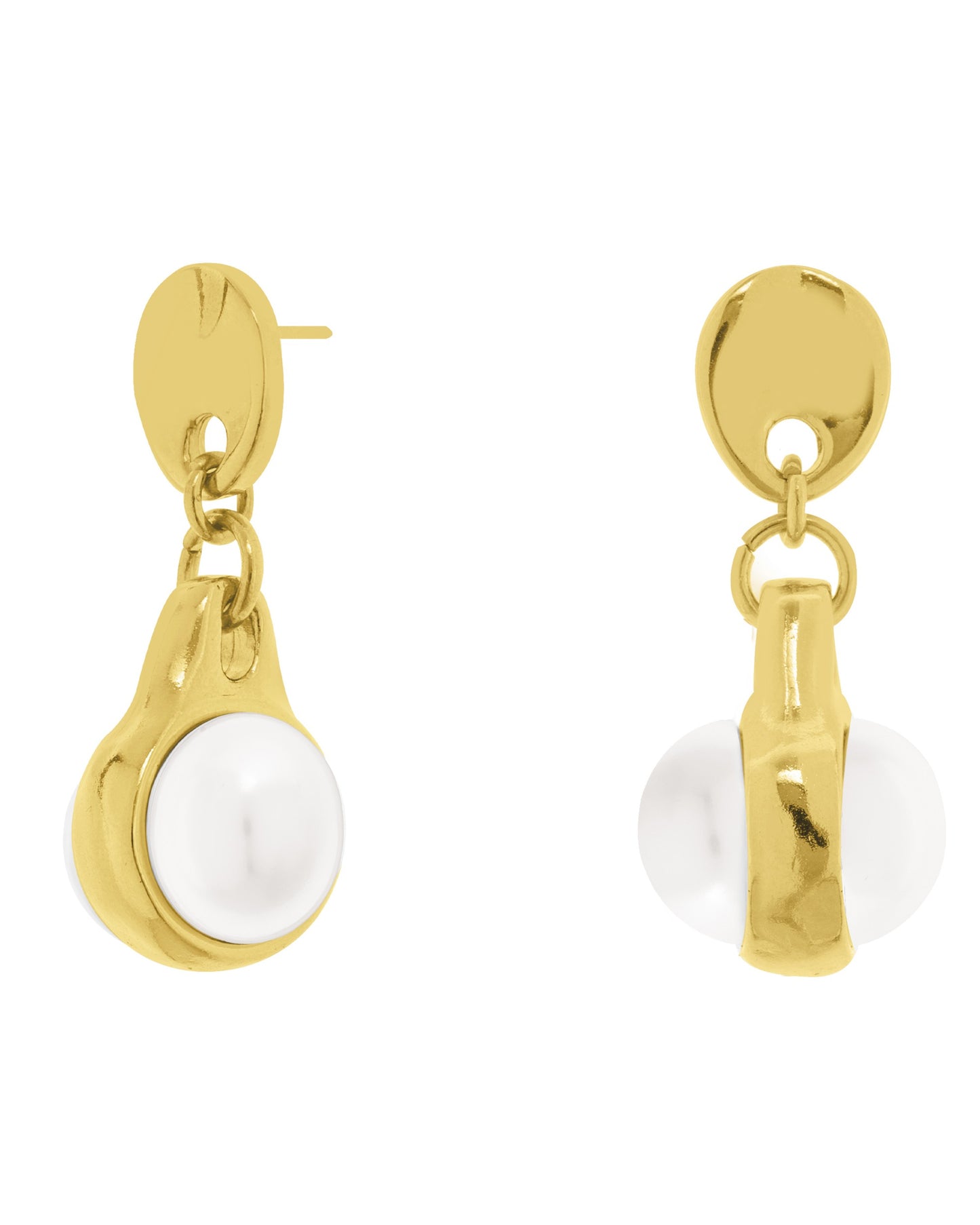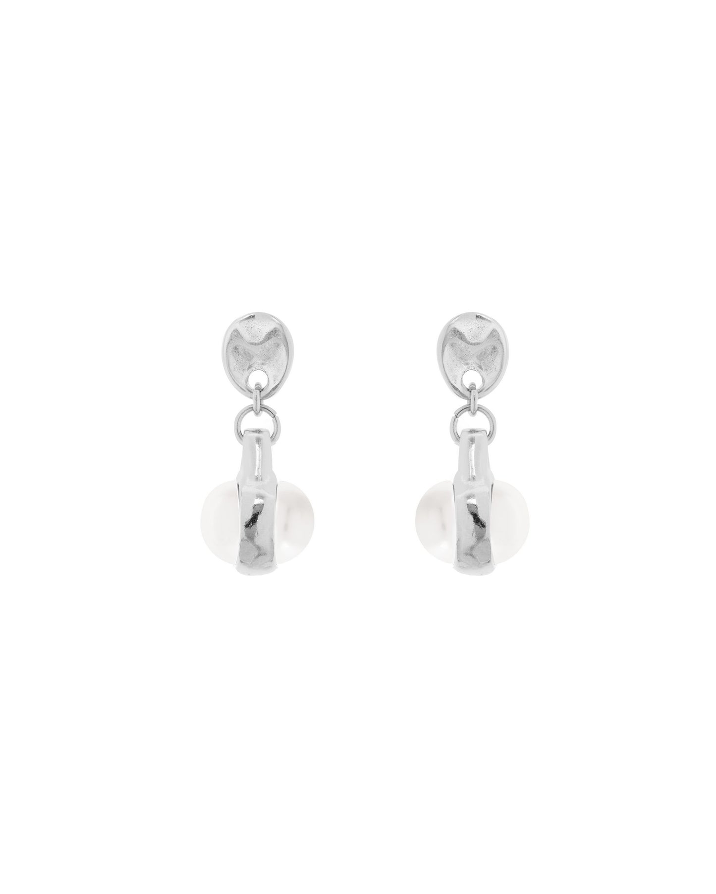 Pendientes con un colgante metálico redondo con una perla redonda en cada lado.