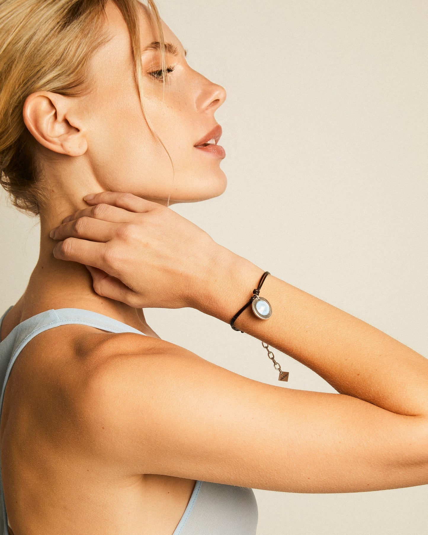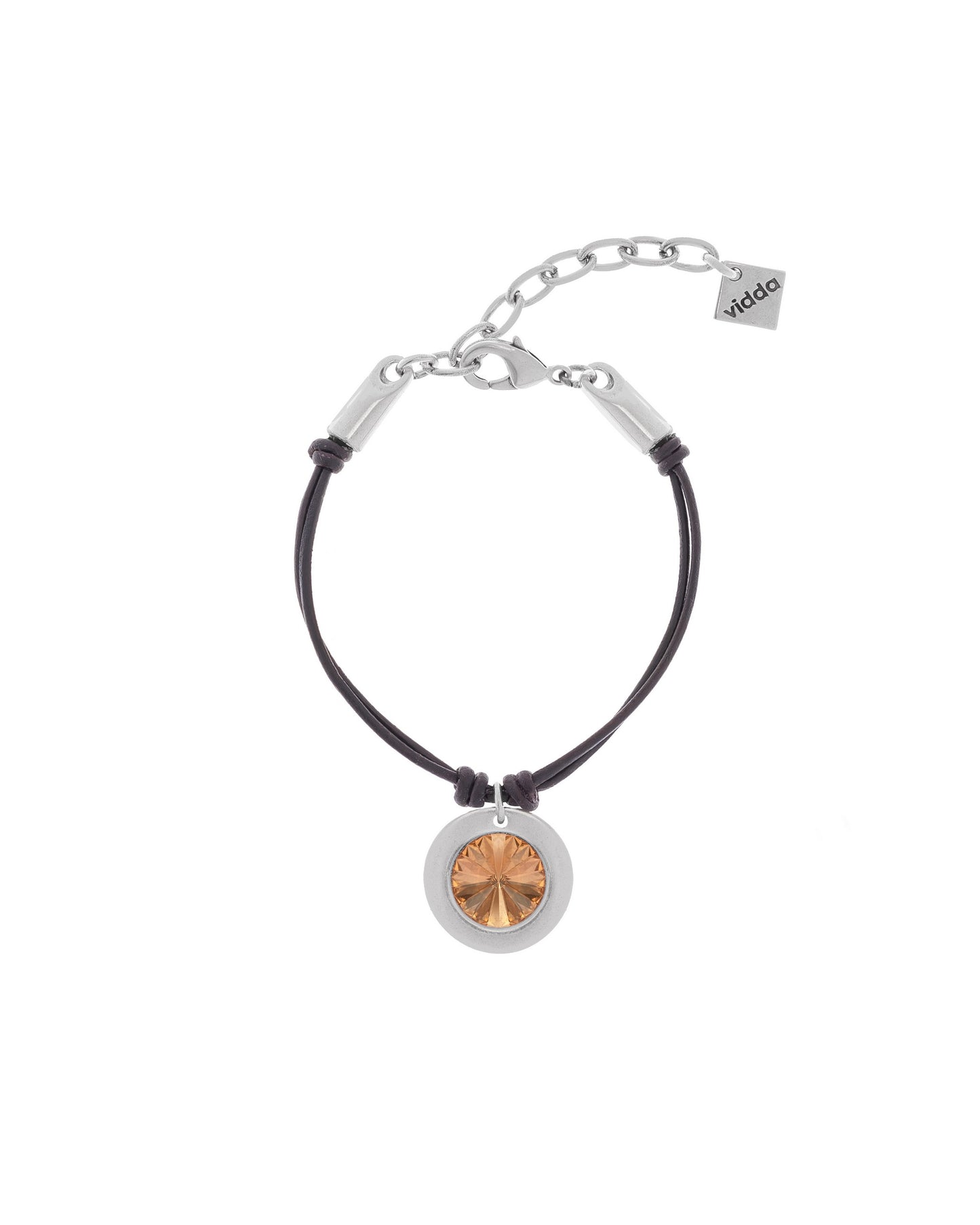 Pulsera de cordón de cuero doble con colgante circular con cristal Swarovski® en el centro.