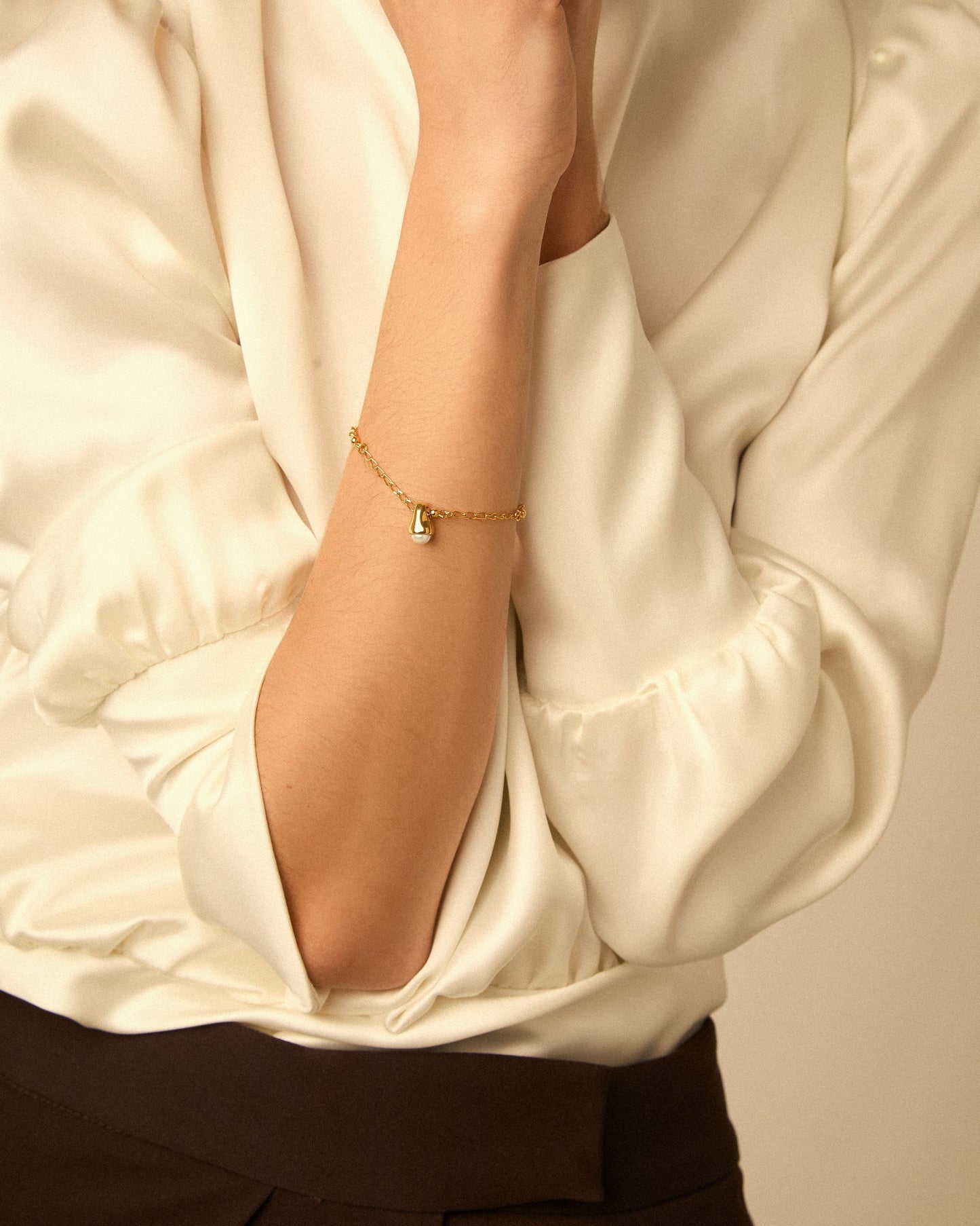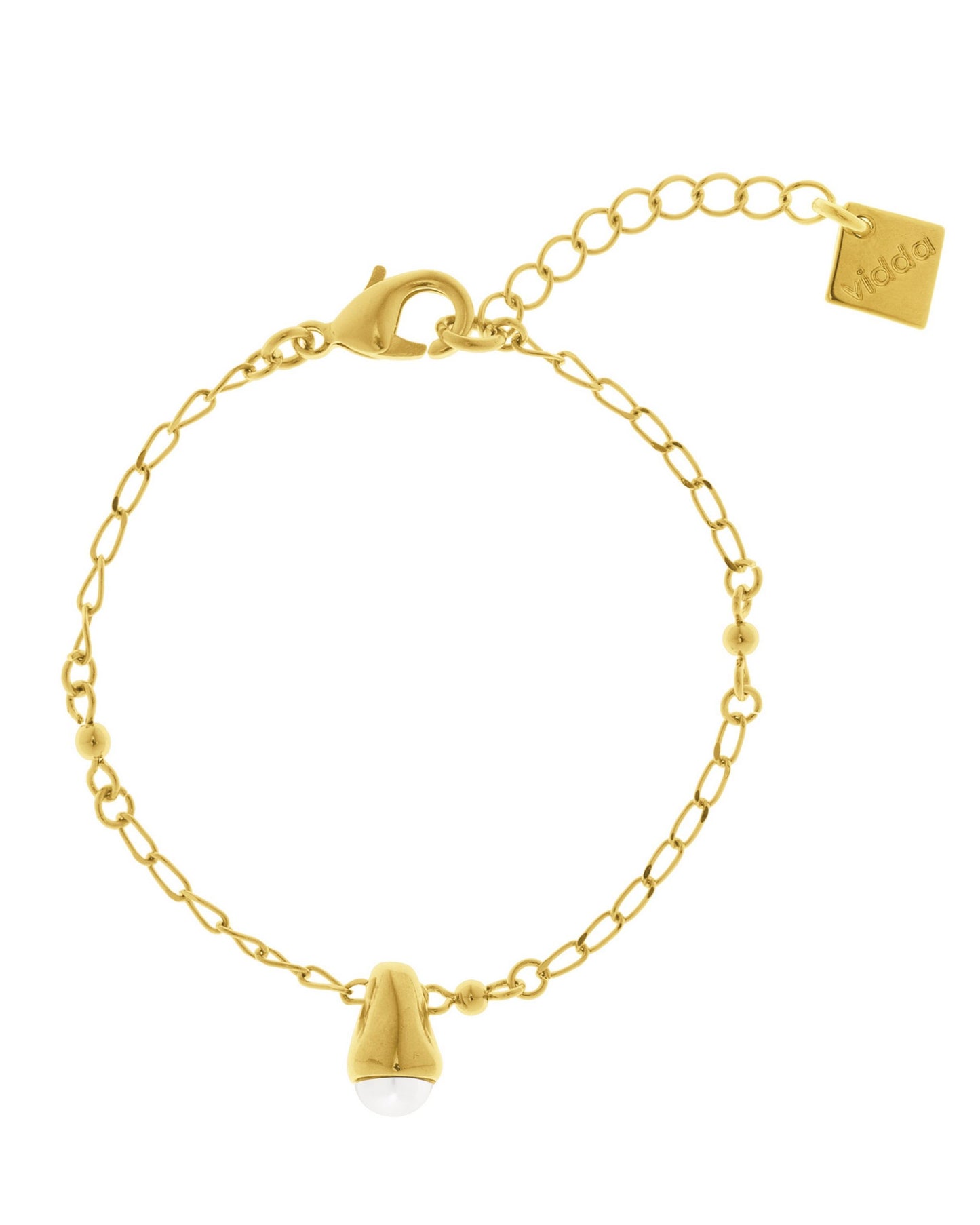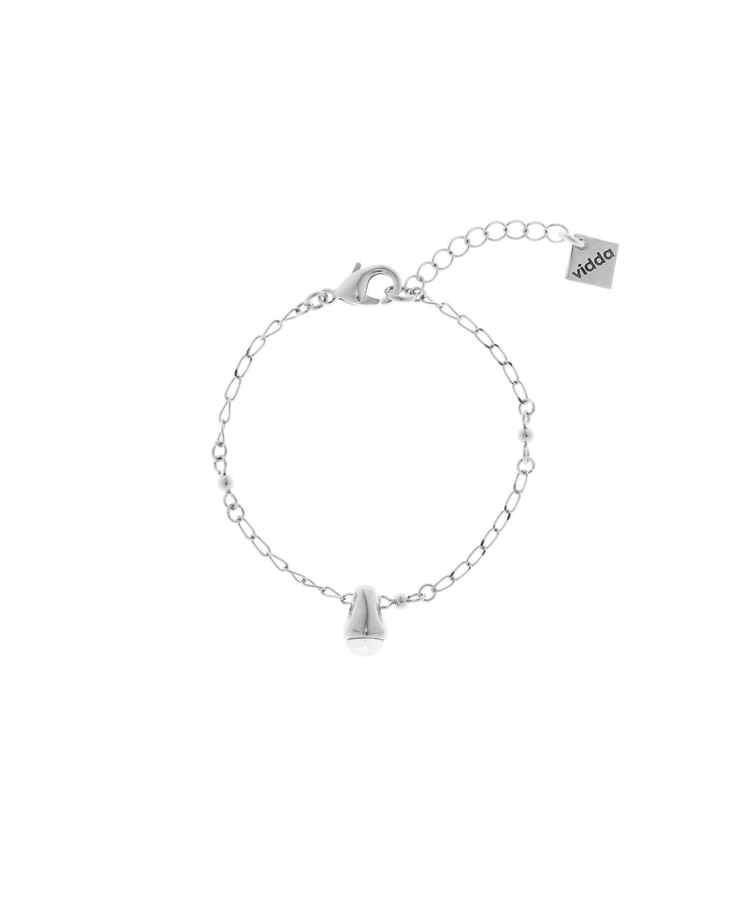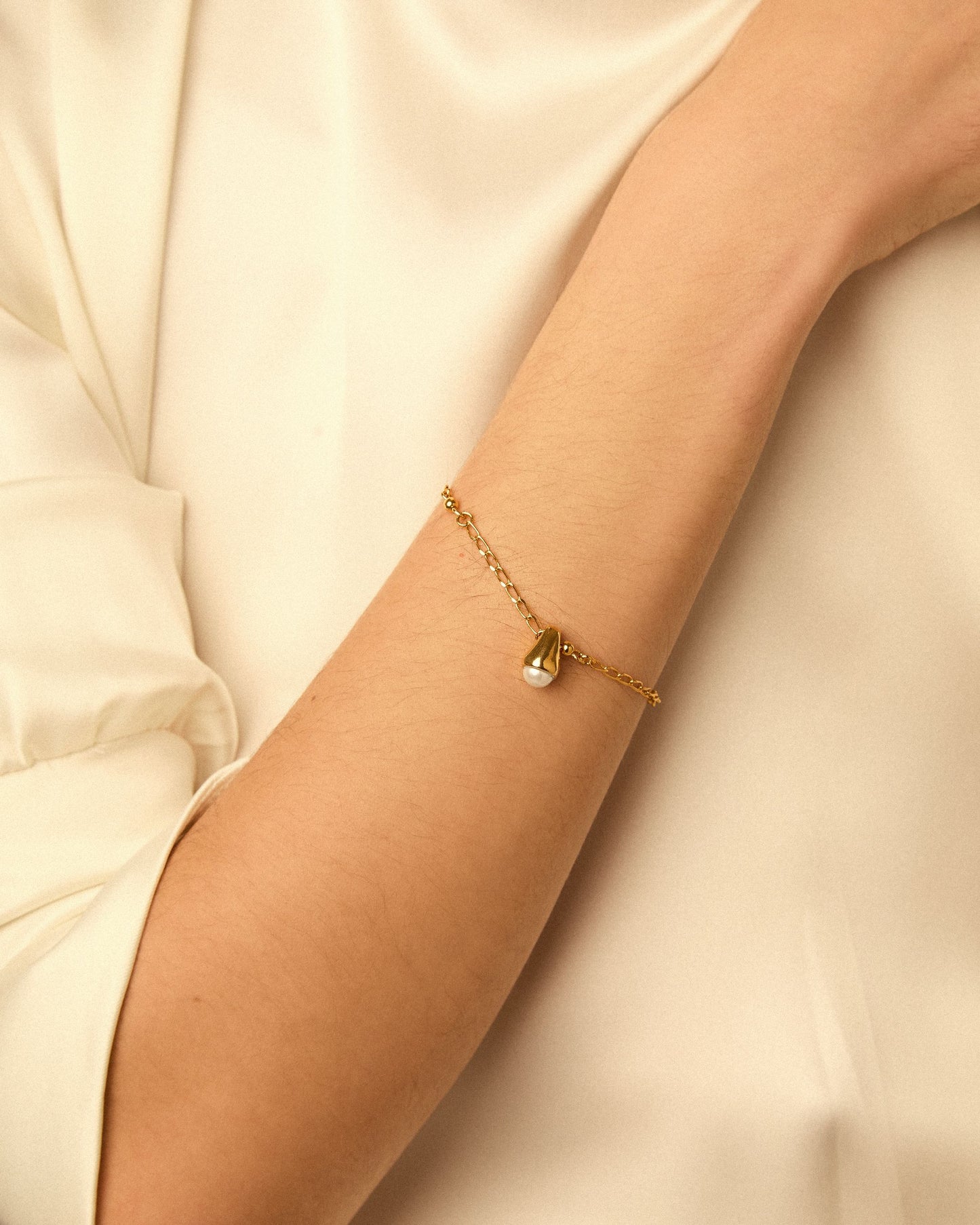 Pulsera compuesta por una cadena fina con un pequeño colgante en forma de gota con una perla en la punta.