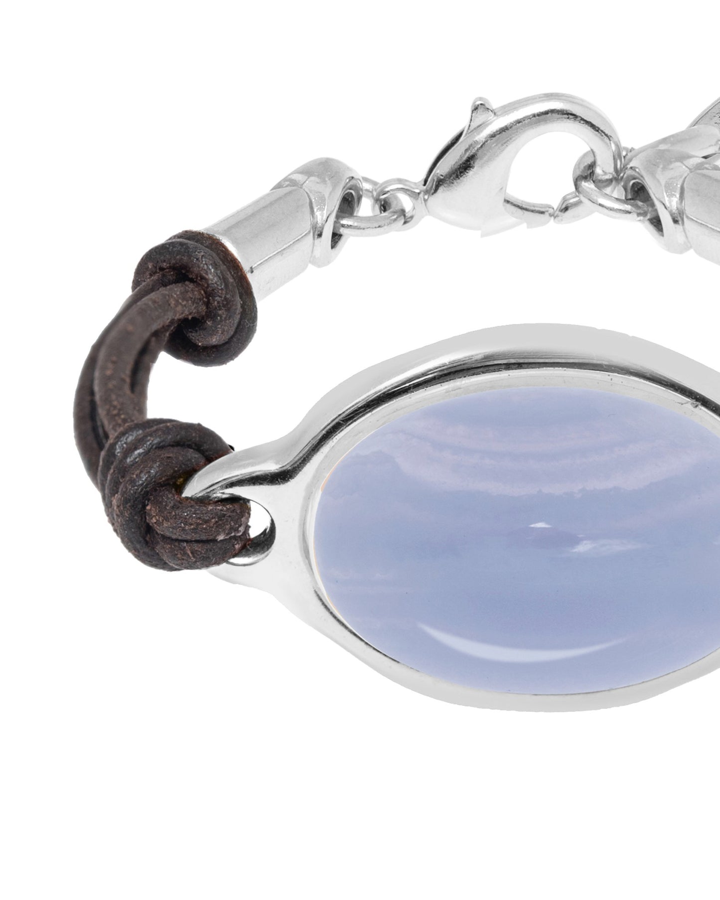 Pulsera de cordón de cuero con una pieza metálica que presenta una piedra semipreciosa ovalada en el centro.