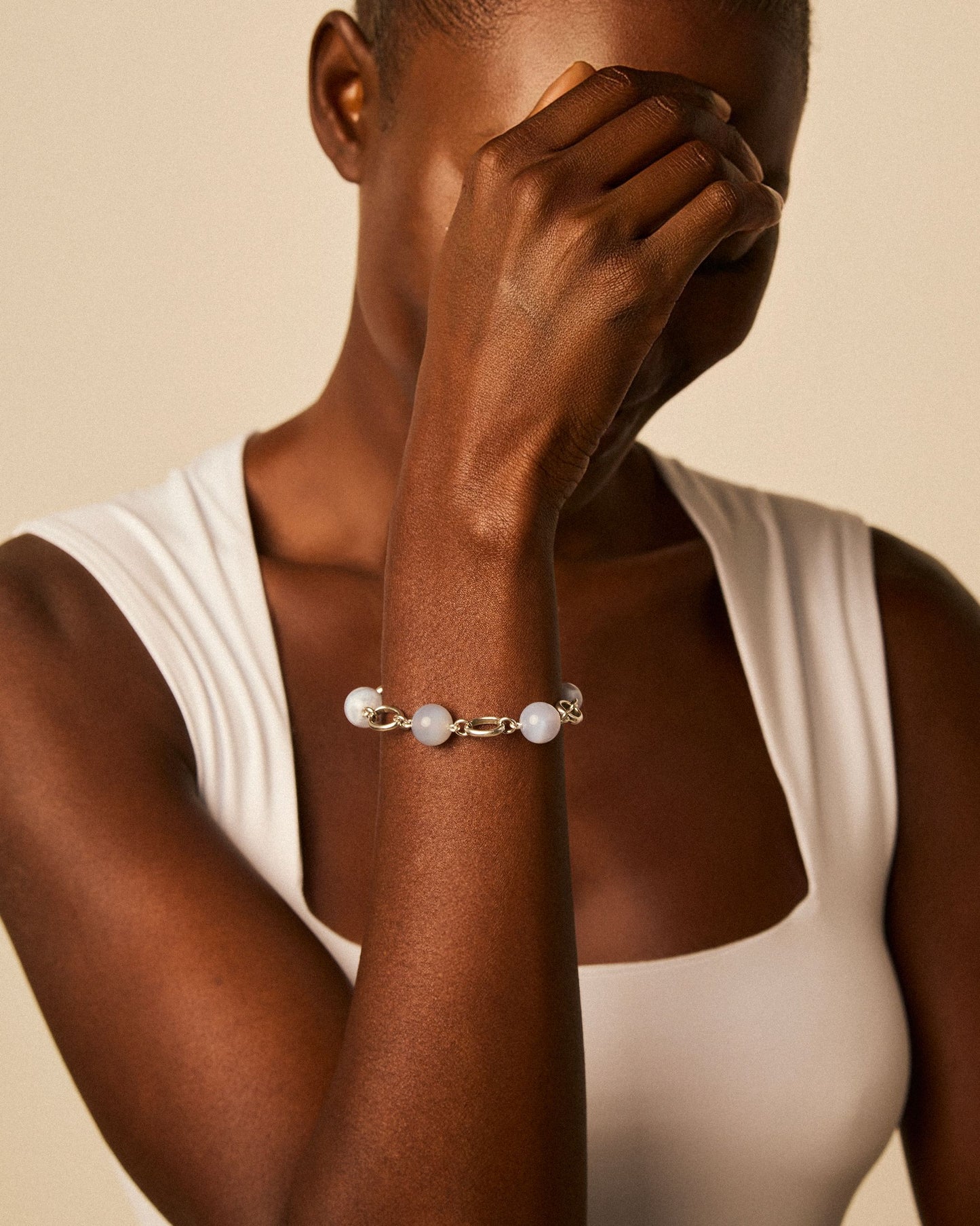 Pulsera de cadena con cinco piedras semipreciosas redondas de diferentes tamaños espaciadas de manera uniforme.