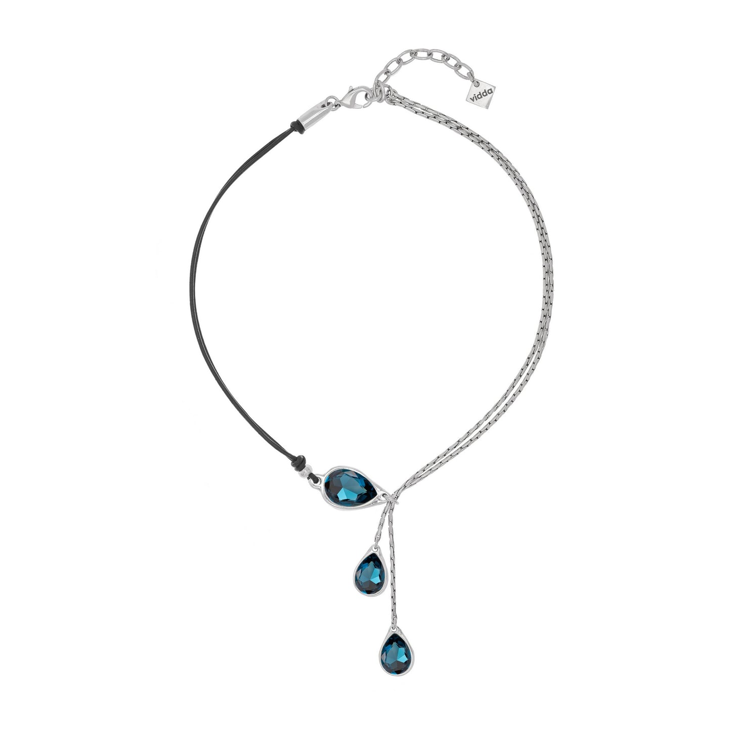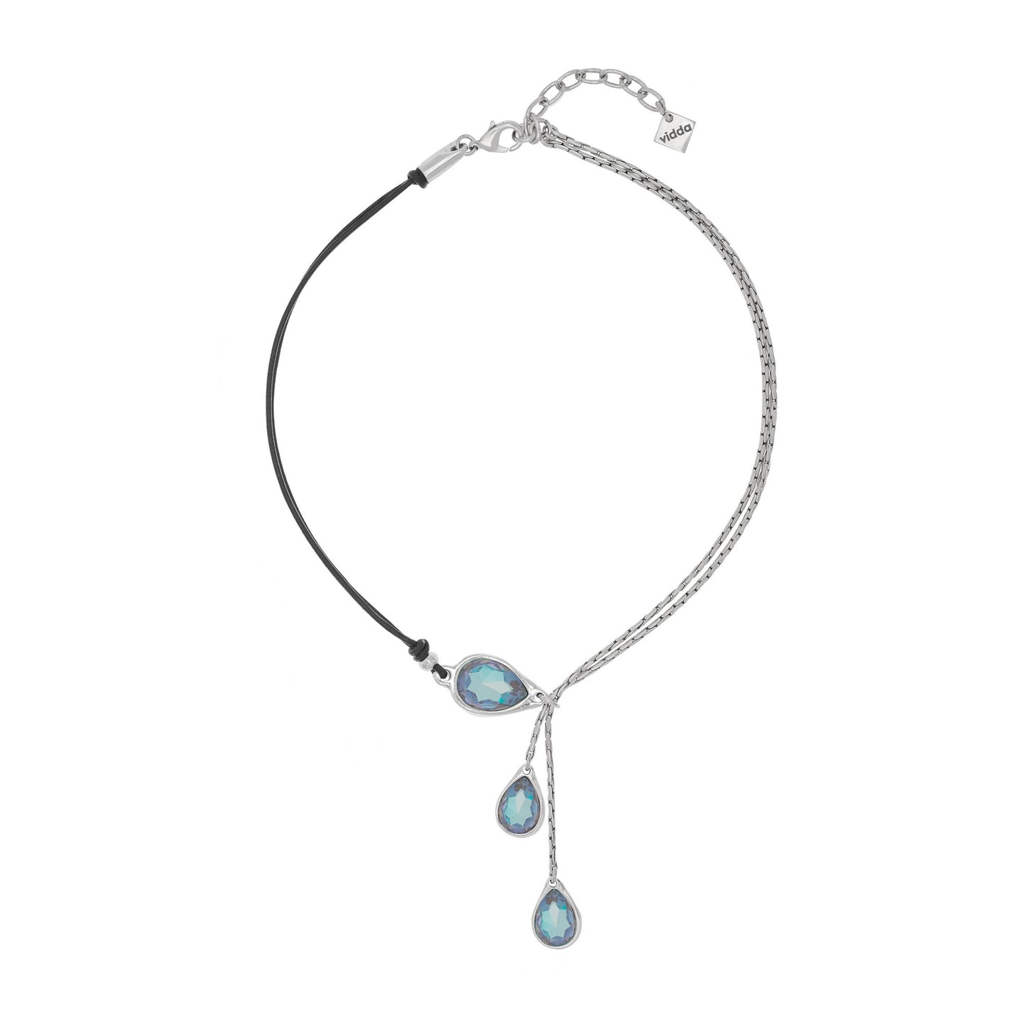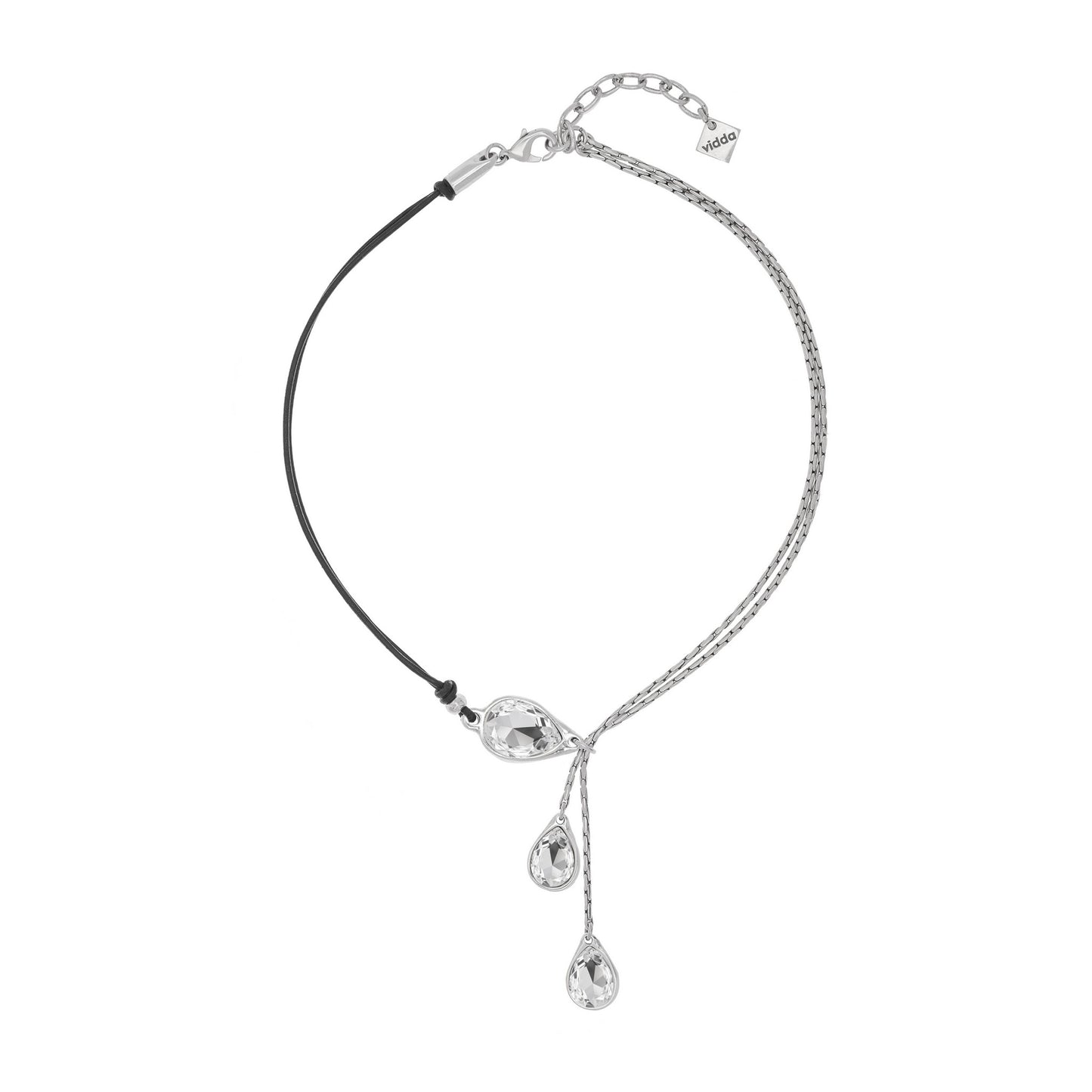 Collar corto de tipo Y hecho con cordón de cuero y dos cadenas de tipo avena de diferente longitud. El collar se entrelaza a través de un conector en forma de gota con cristal Swarovski®. Ambas cadenas presentan en su extremo un pequeño colgante en forma de gota con cristal Swarovski®.
