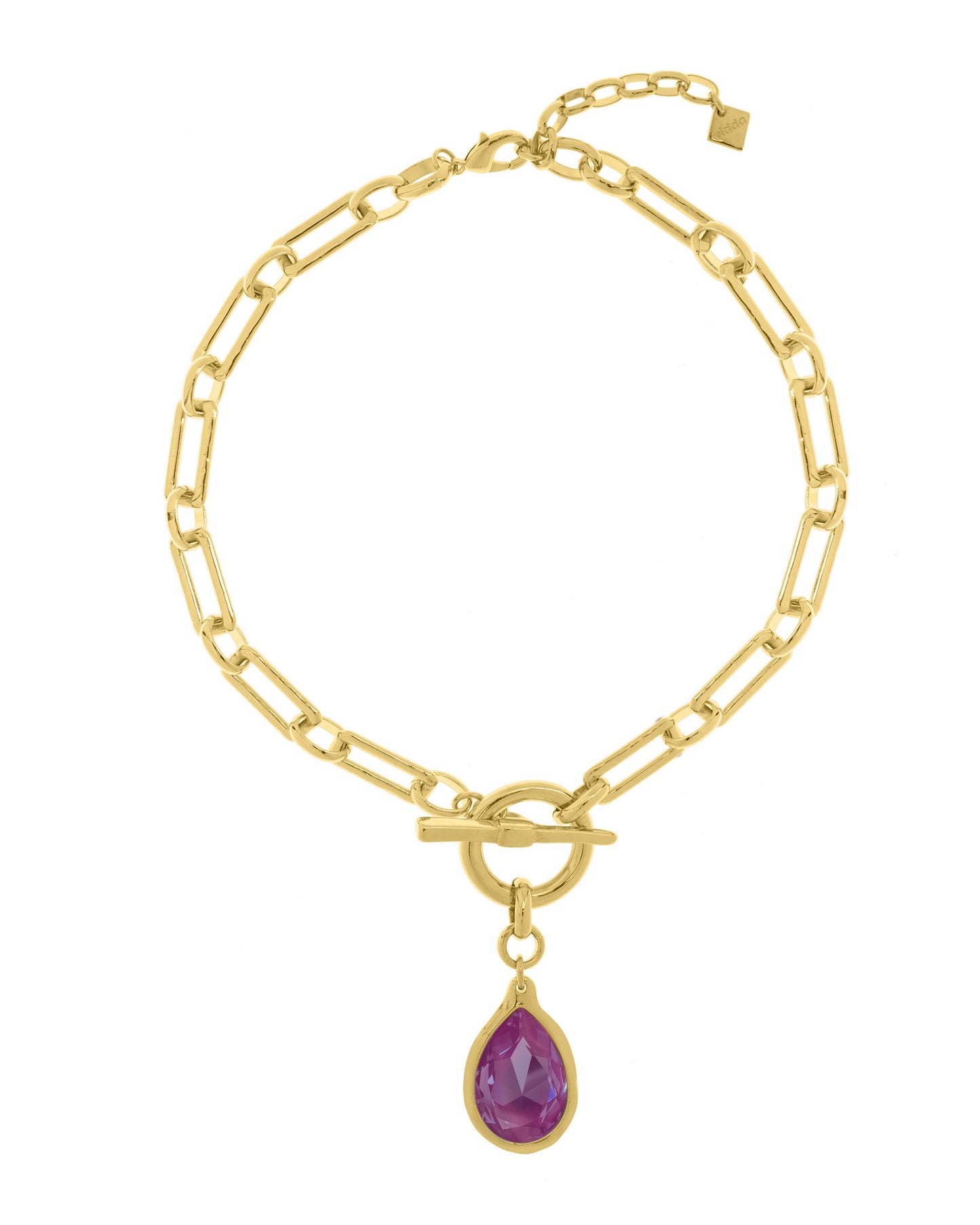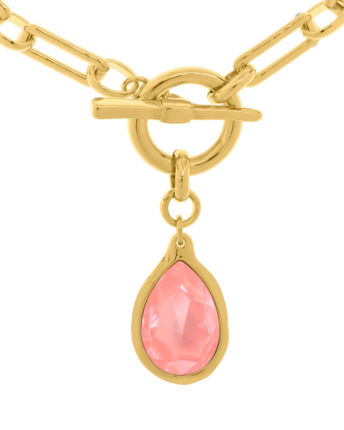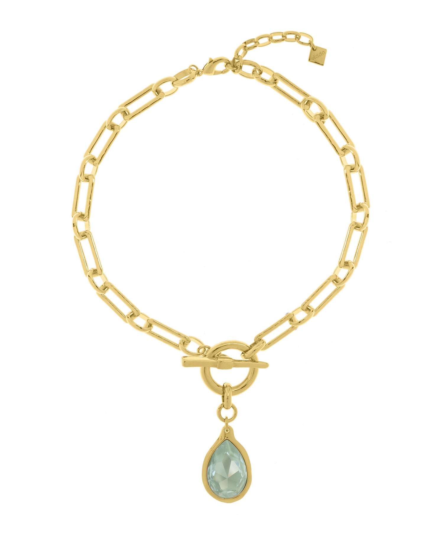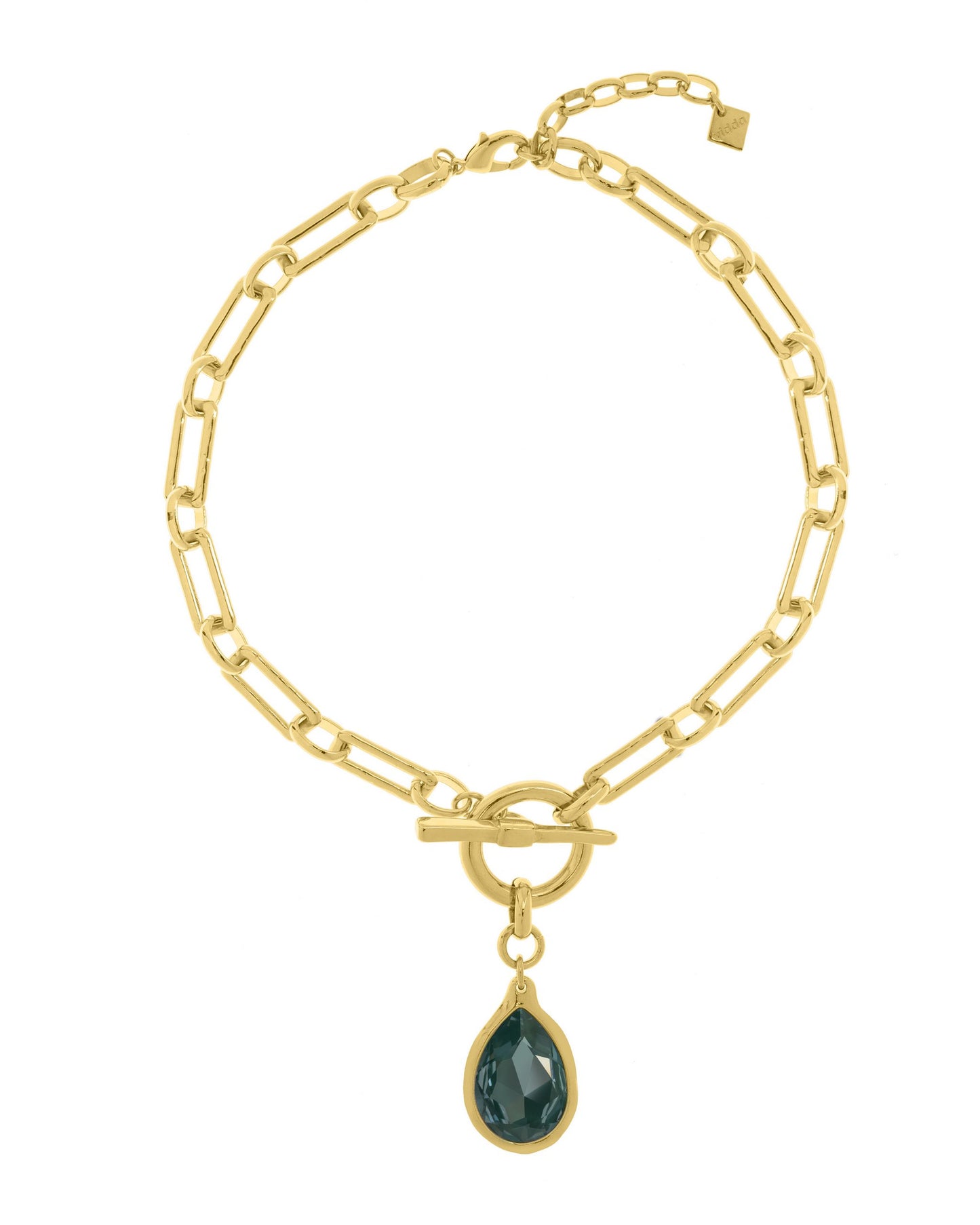 Collar de eslabones rectangulares unidos en cadena. Anillo circular con un colgante en forma de gota con cristal Swarovski® en un extremo y una barra en forma de T en el otro.