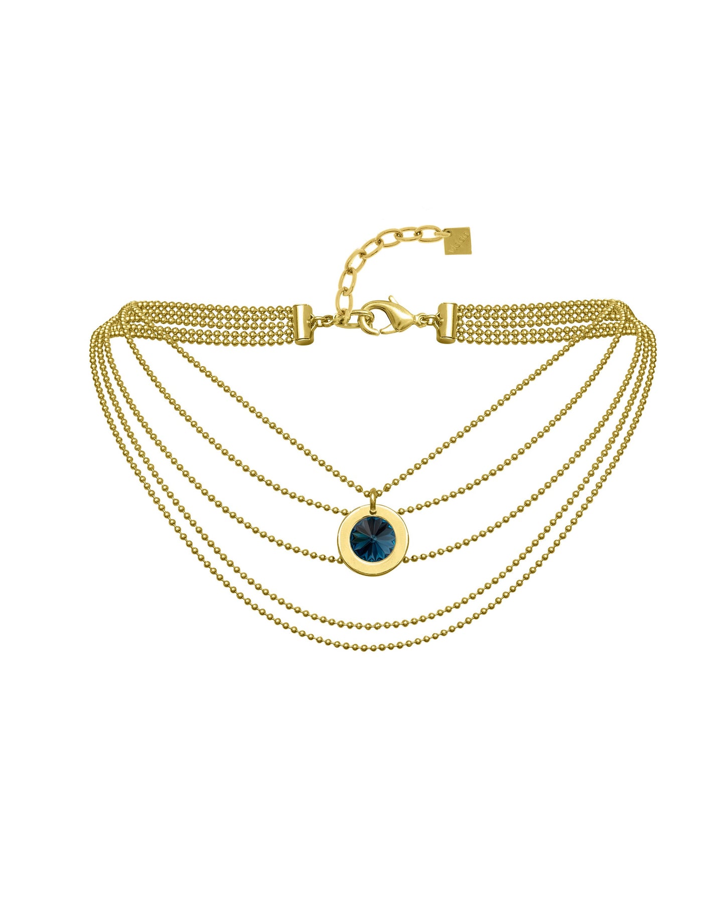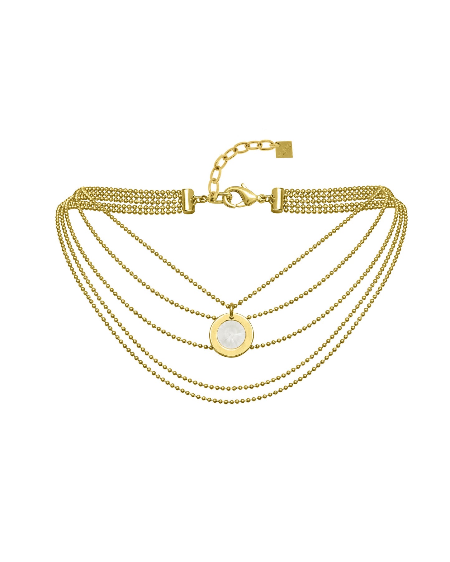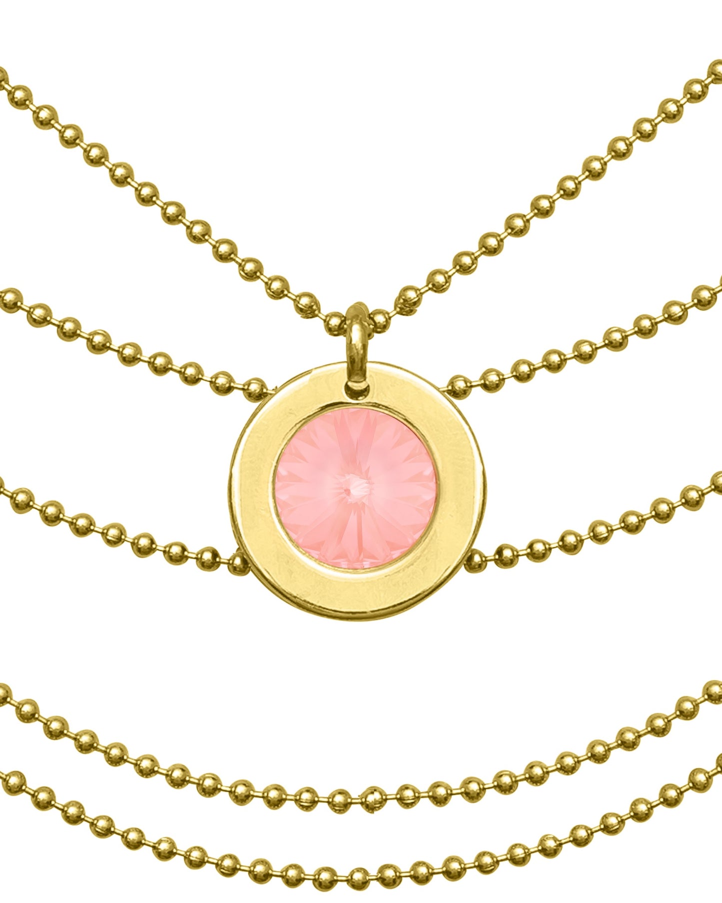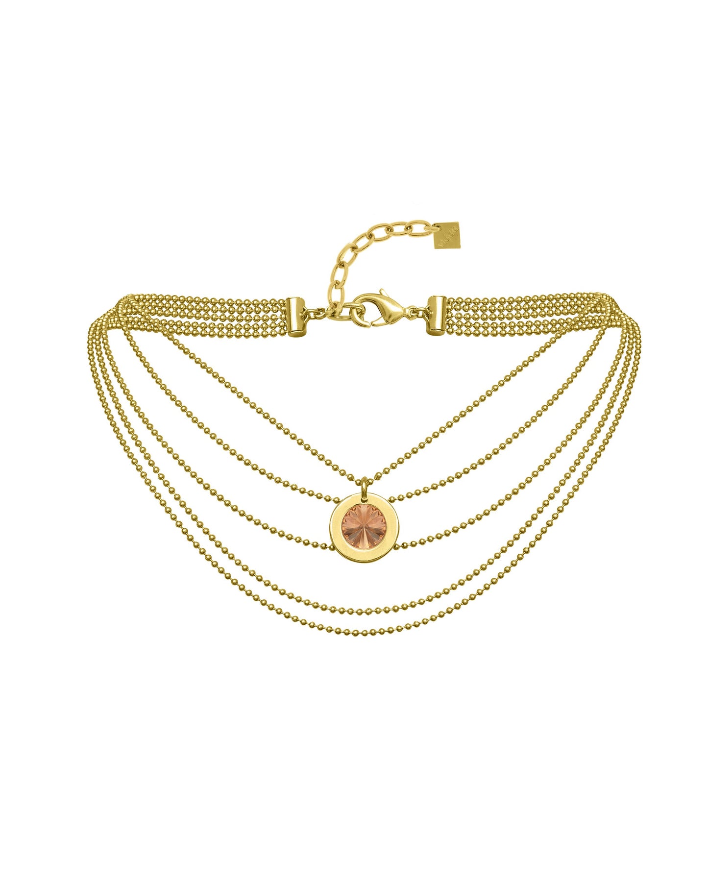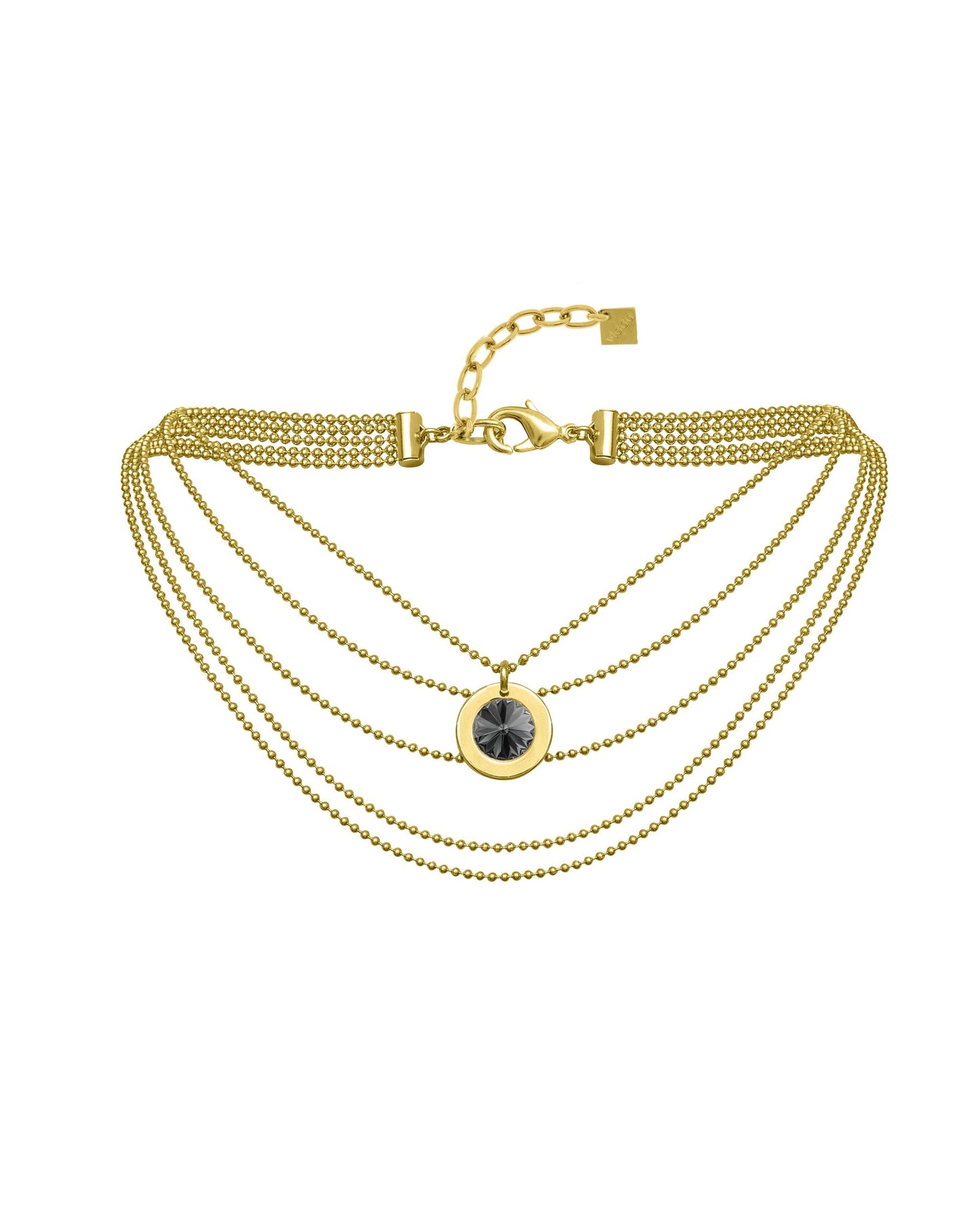 Collar corto elaborado con cinco cadenas de bolas de diferente largura con colgante circular con cristal Swarovski® en la corta.
