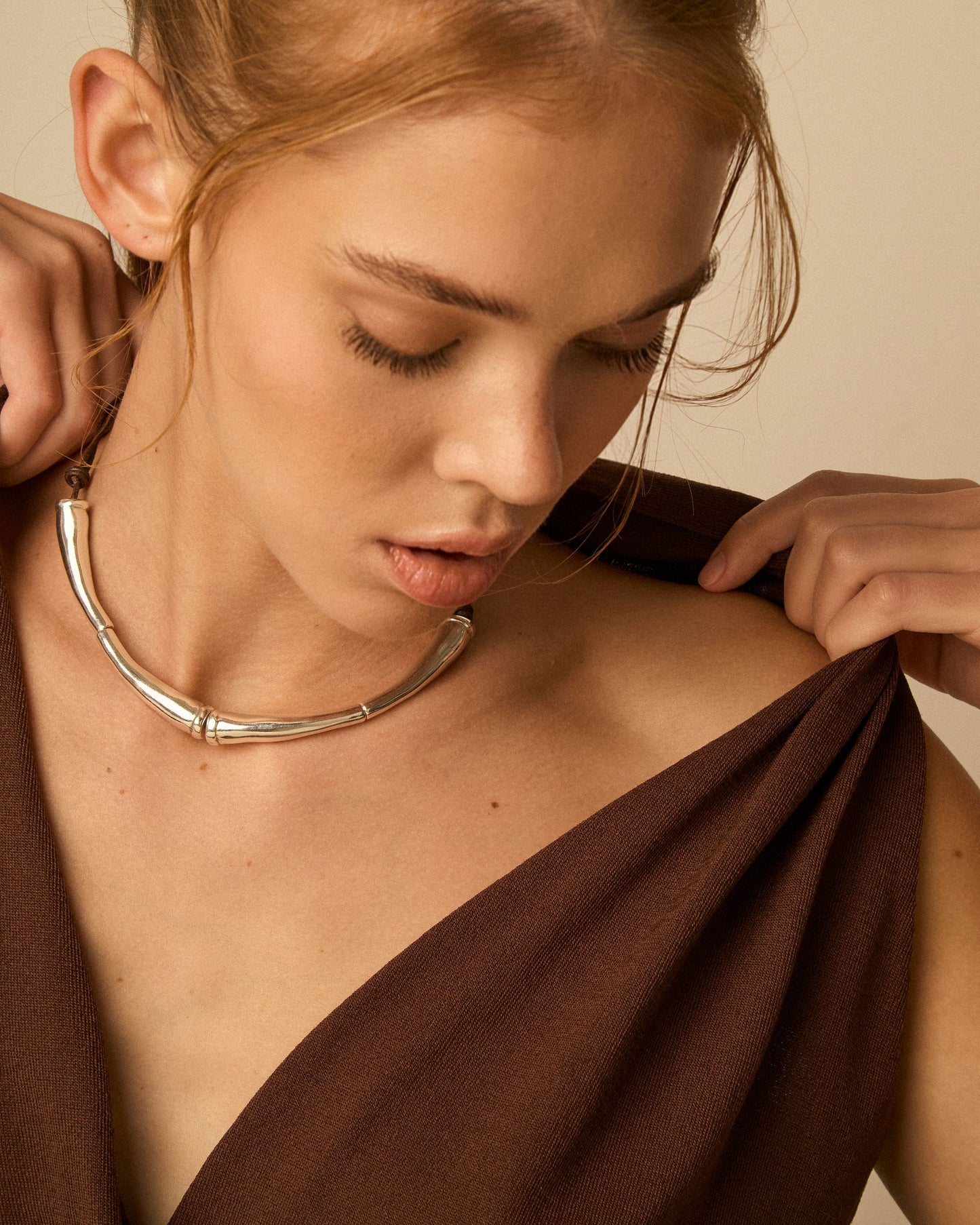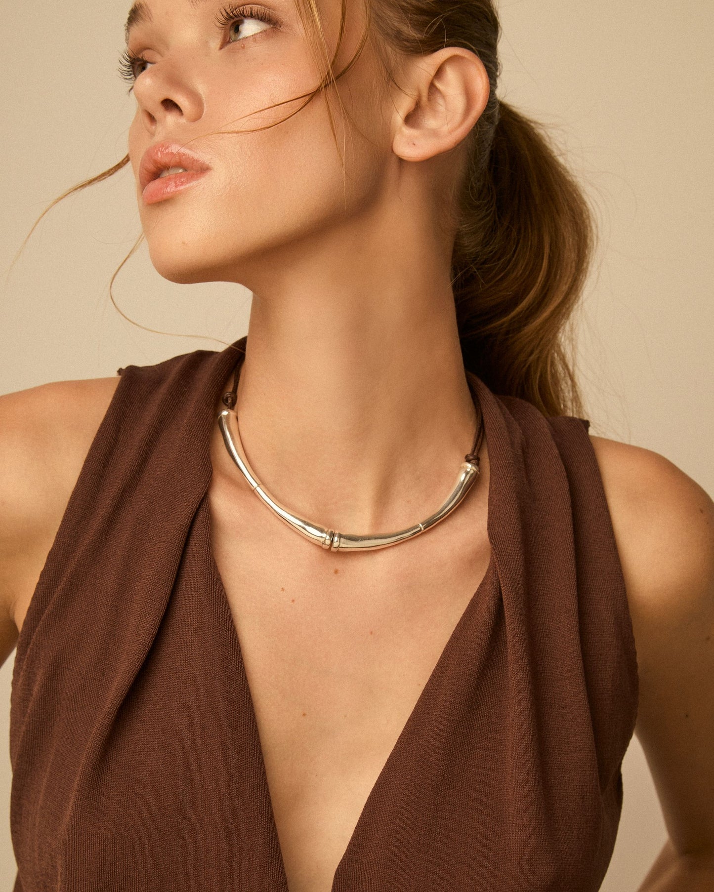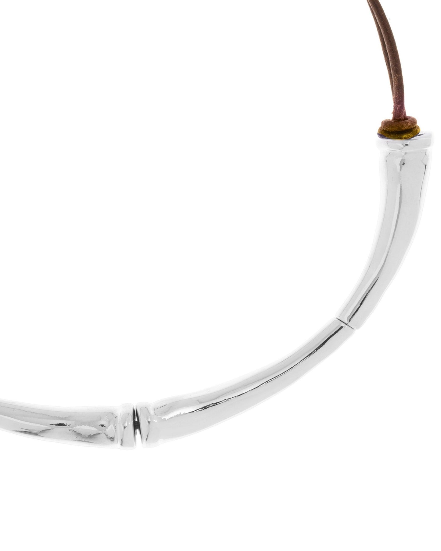 Short double leather cord necklace featuring two long curved tubular elements at the front.