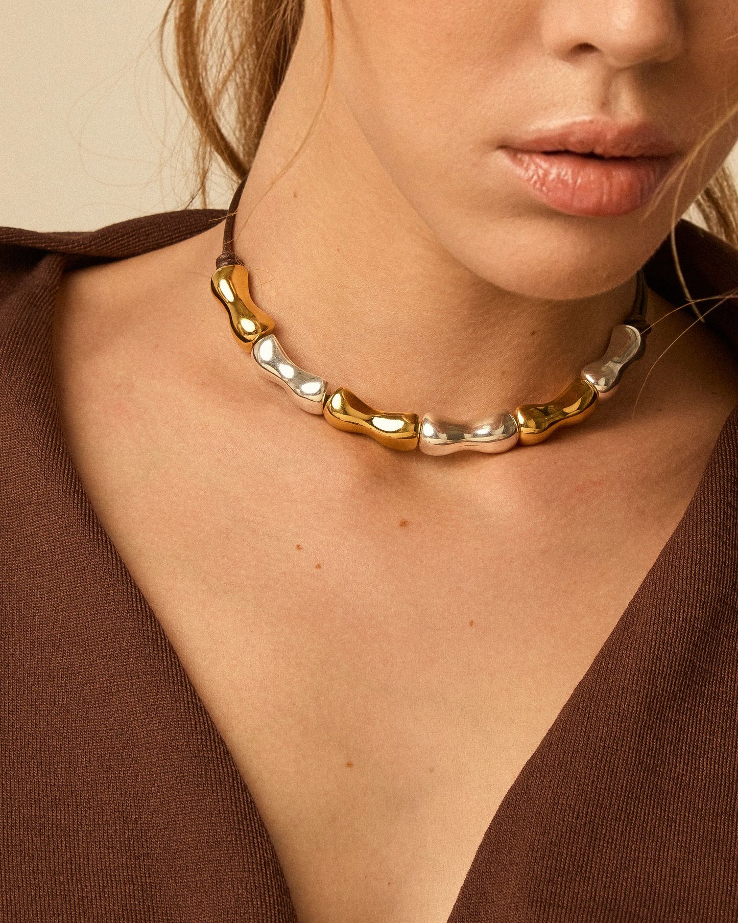 Double leather cord choker featuring a series of organic tubular elements at the front, arranged in a fluid, sculptural composition.