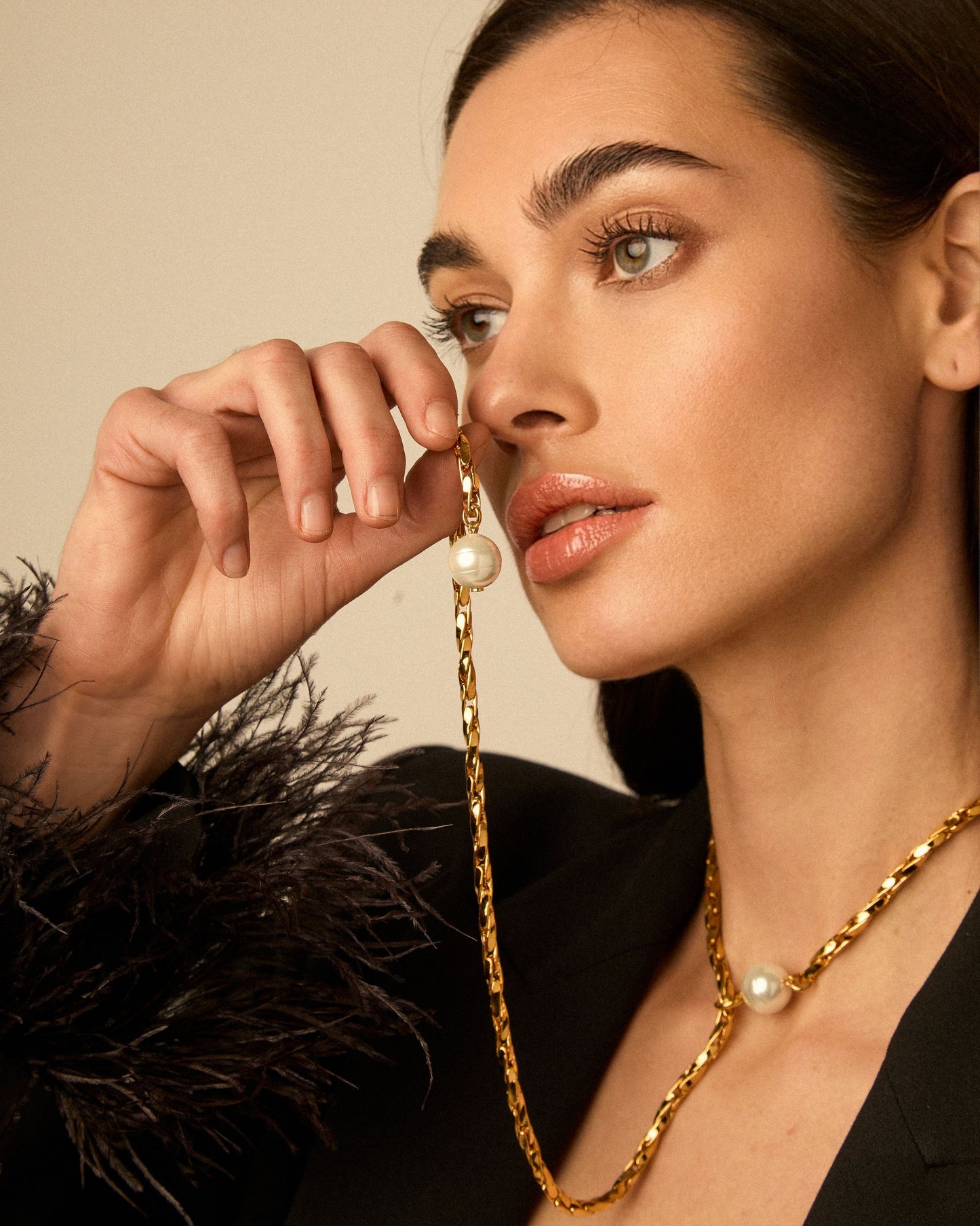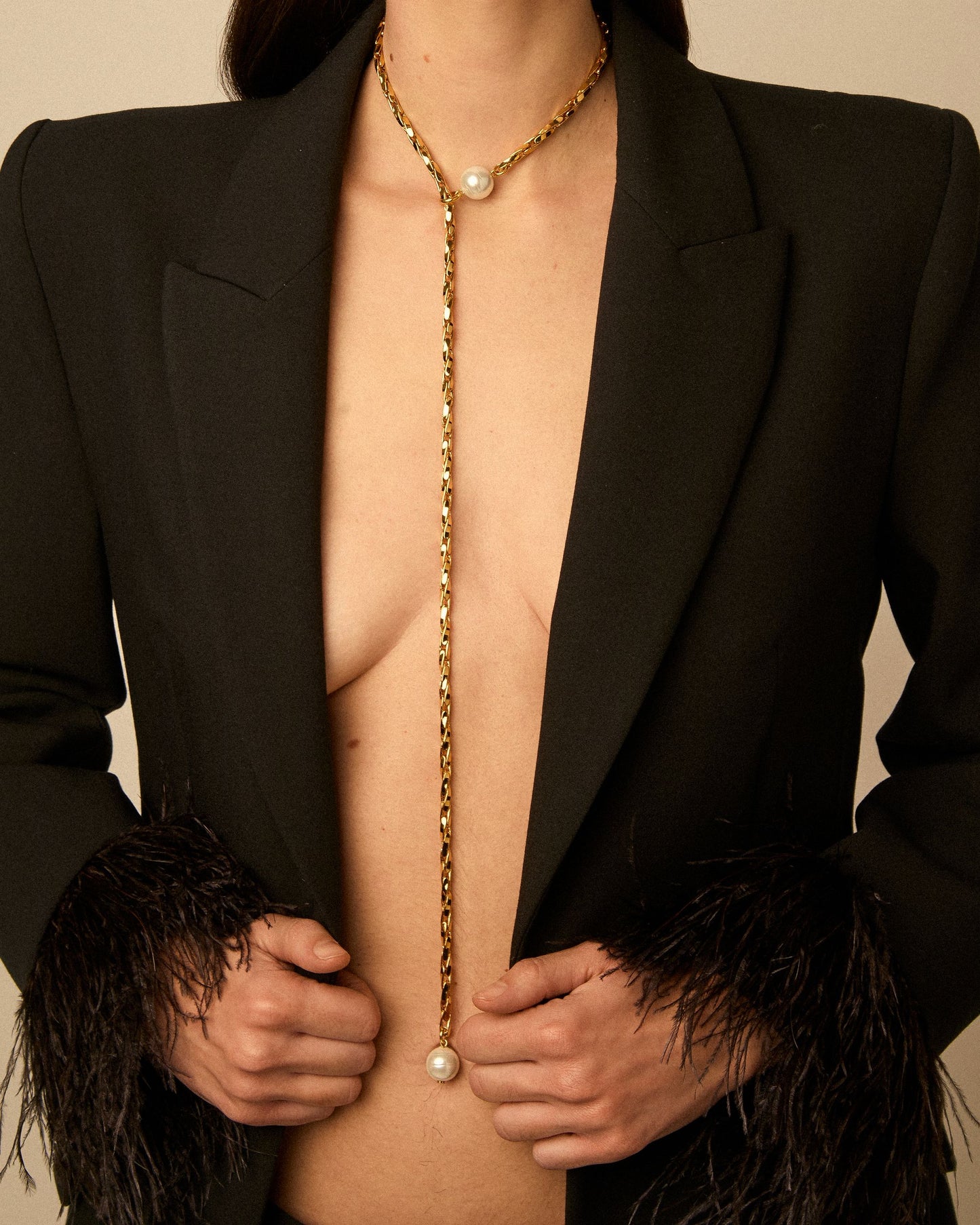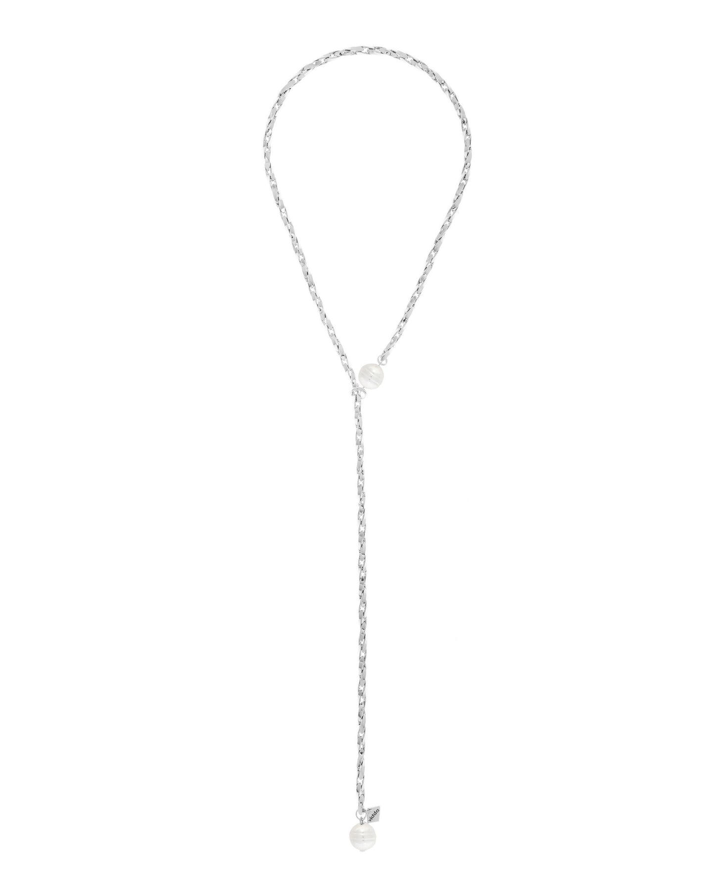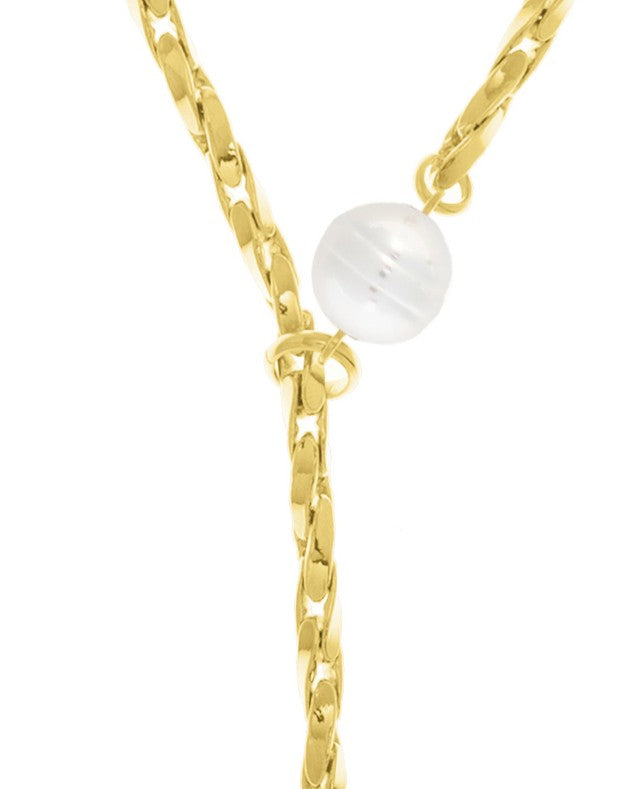 Long adjustable oat chain necklace designed to be worn in multiple ways. Finished with a pearl at each end, with a metal ring extending from one of the pearls through which the chain slides, allowing the length to be adjusted freely.